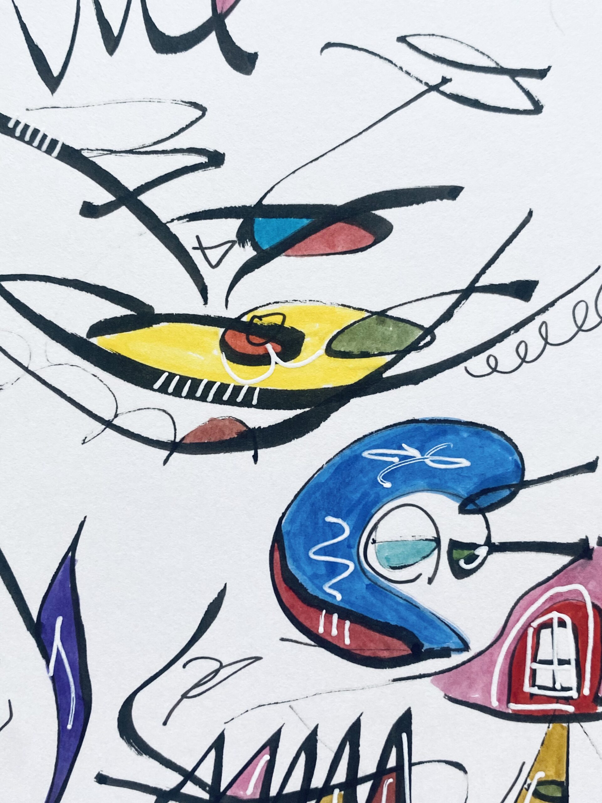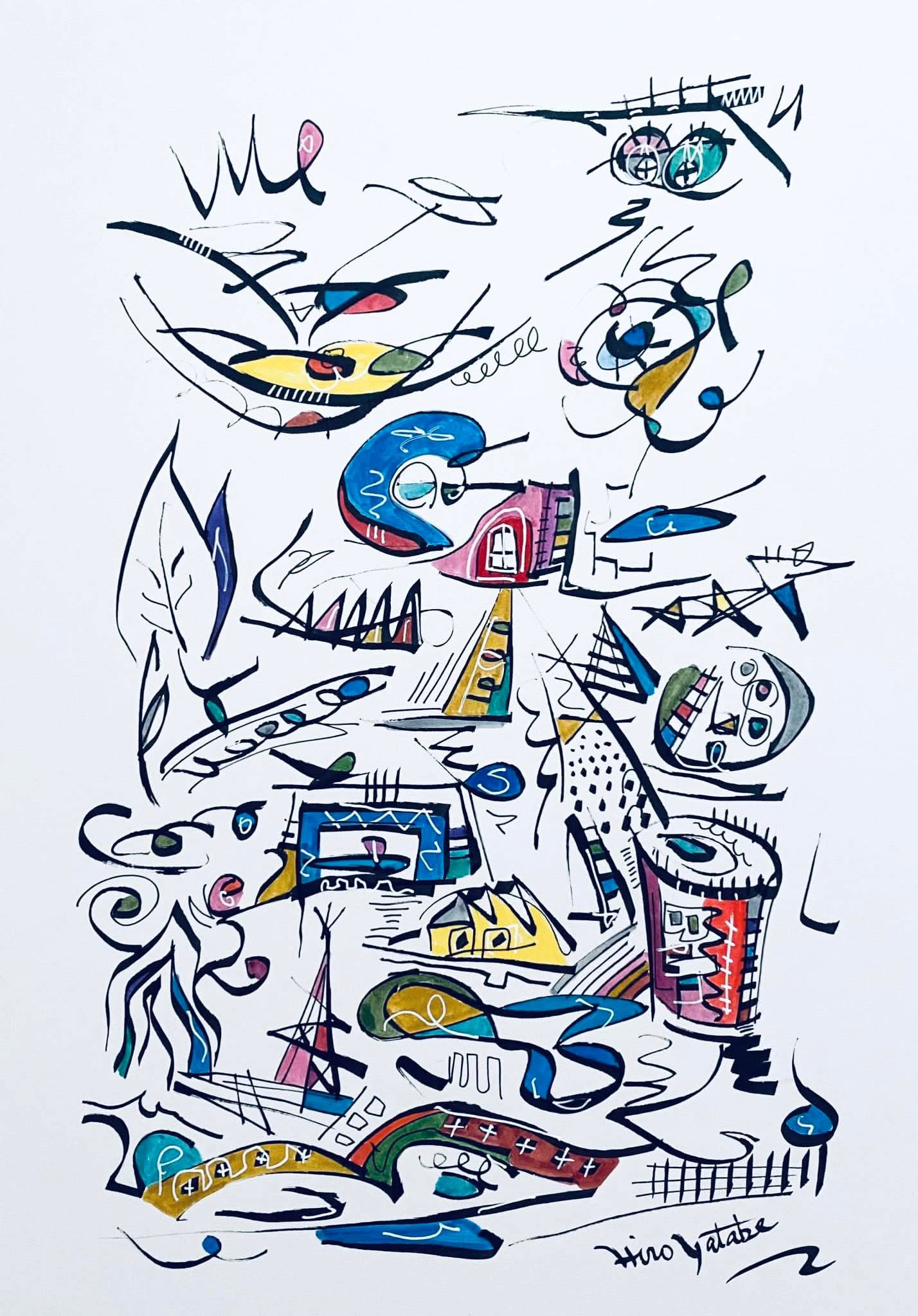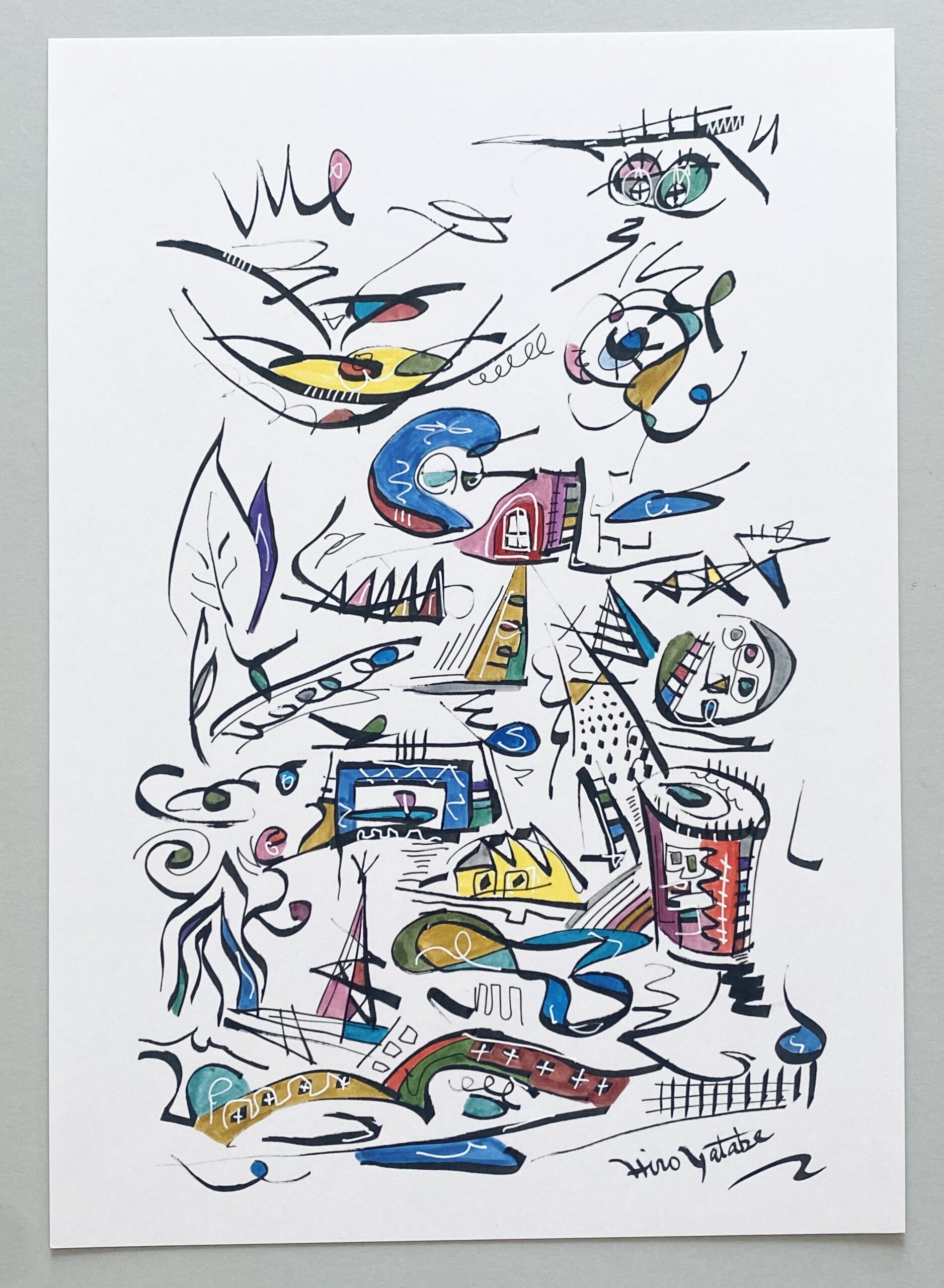 2008年 浮かんだイメージを付箋にボールペンでスケッチ。2012年になりそれをまとめたものを知人に見せたところサイズや画材をかえて絵画として発表することを勧められ、2013年、公募展にA4サイズのカードボードにペン・パステルで描いた作品を出品。その後アクリル絵具での創作をスタート。