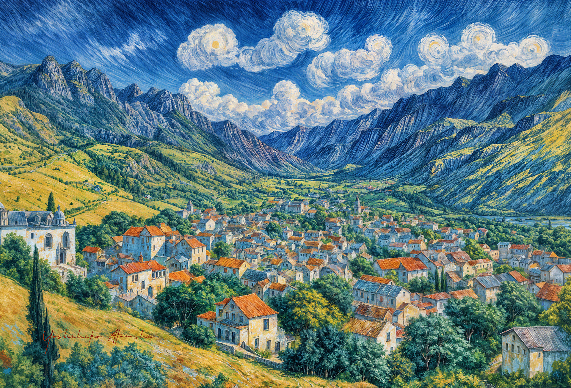 タイトル「風に還る山間の風景」に込めた想いは、自然と人の暮らしが静かに寄り添い、時と共に風のように巡る情景の記憶です。私はこの作品群を通じて、旅先で心を奪われたヨーロッパの山間の町の空気感や光の移ろいを描きました。柔らかな筆致と重ねた色彩で、懐かしさと静けさを表現しています。見る人の心にやさしく触れ、記憶の奥にある風景と呼応するような、そんな絵画でありたいと願っています。