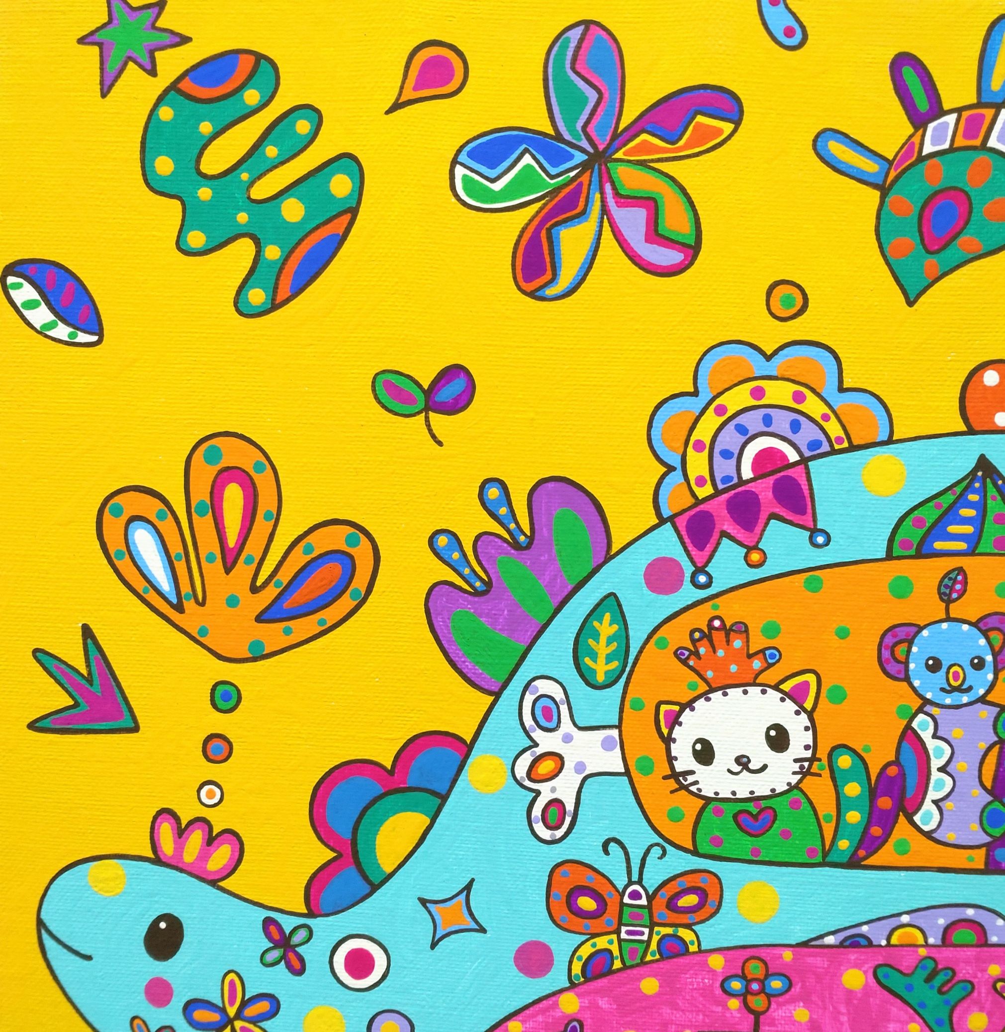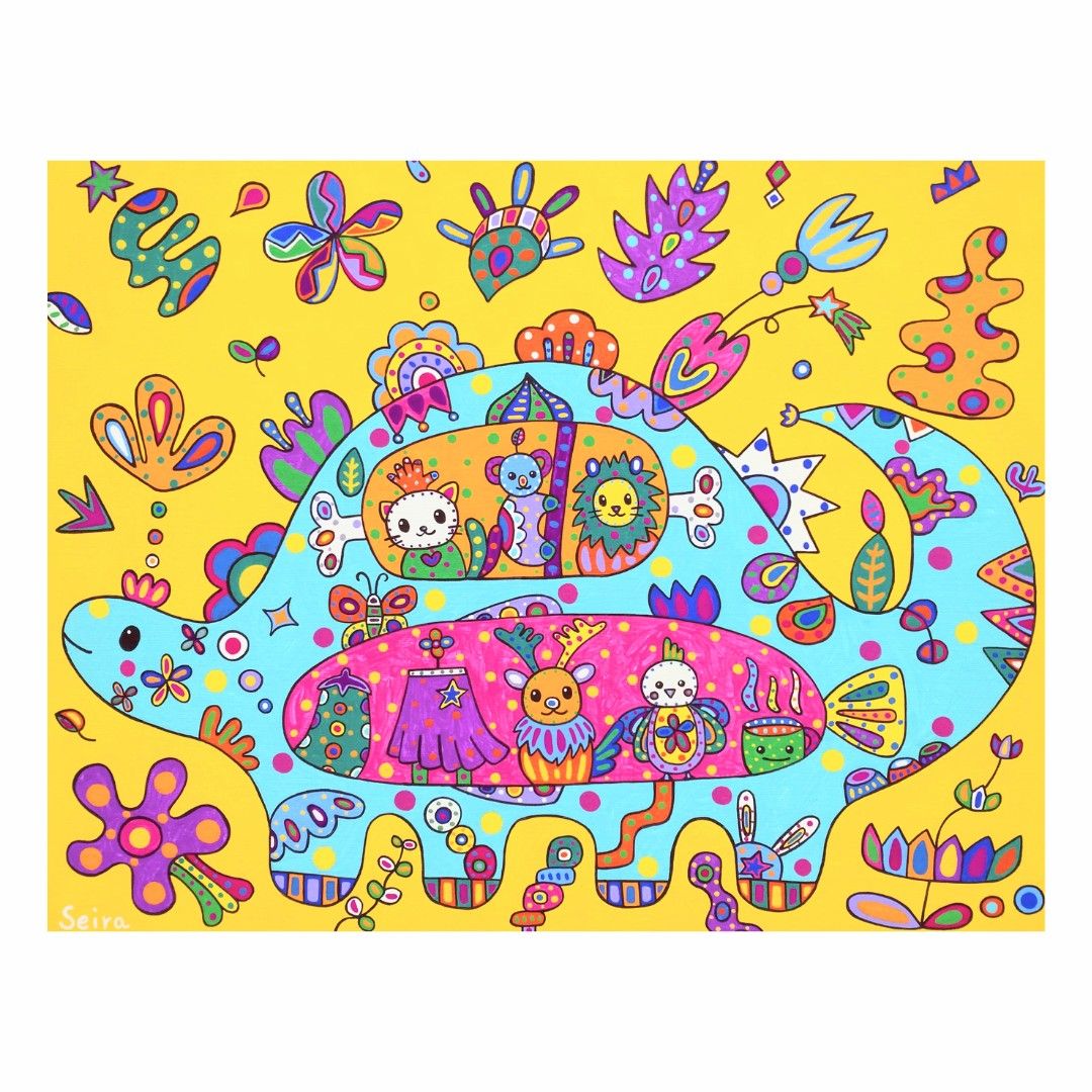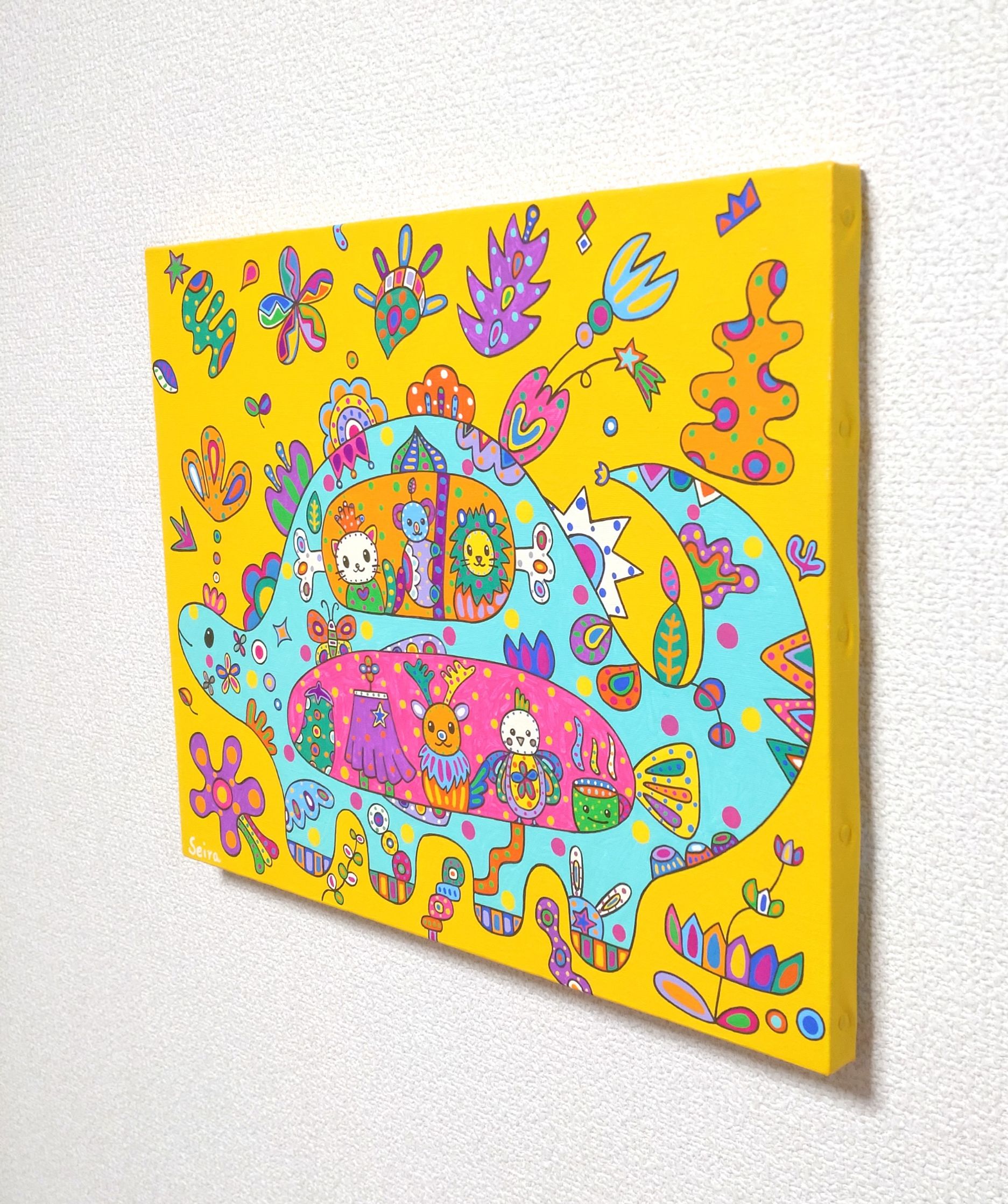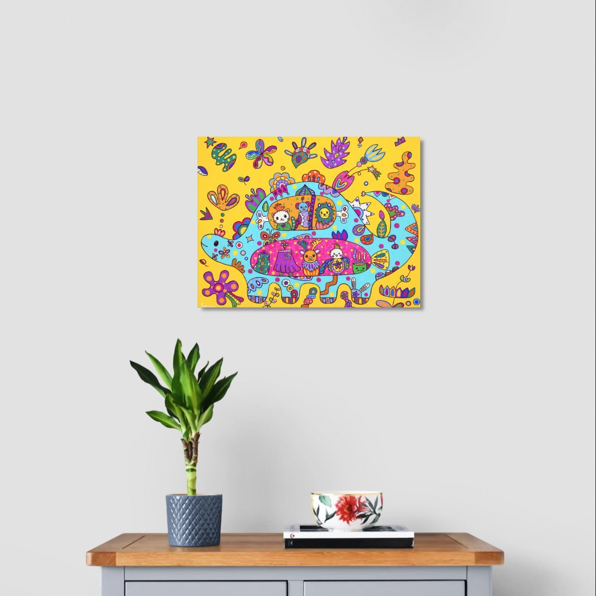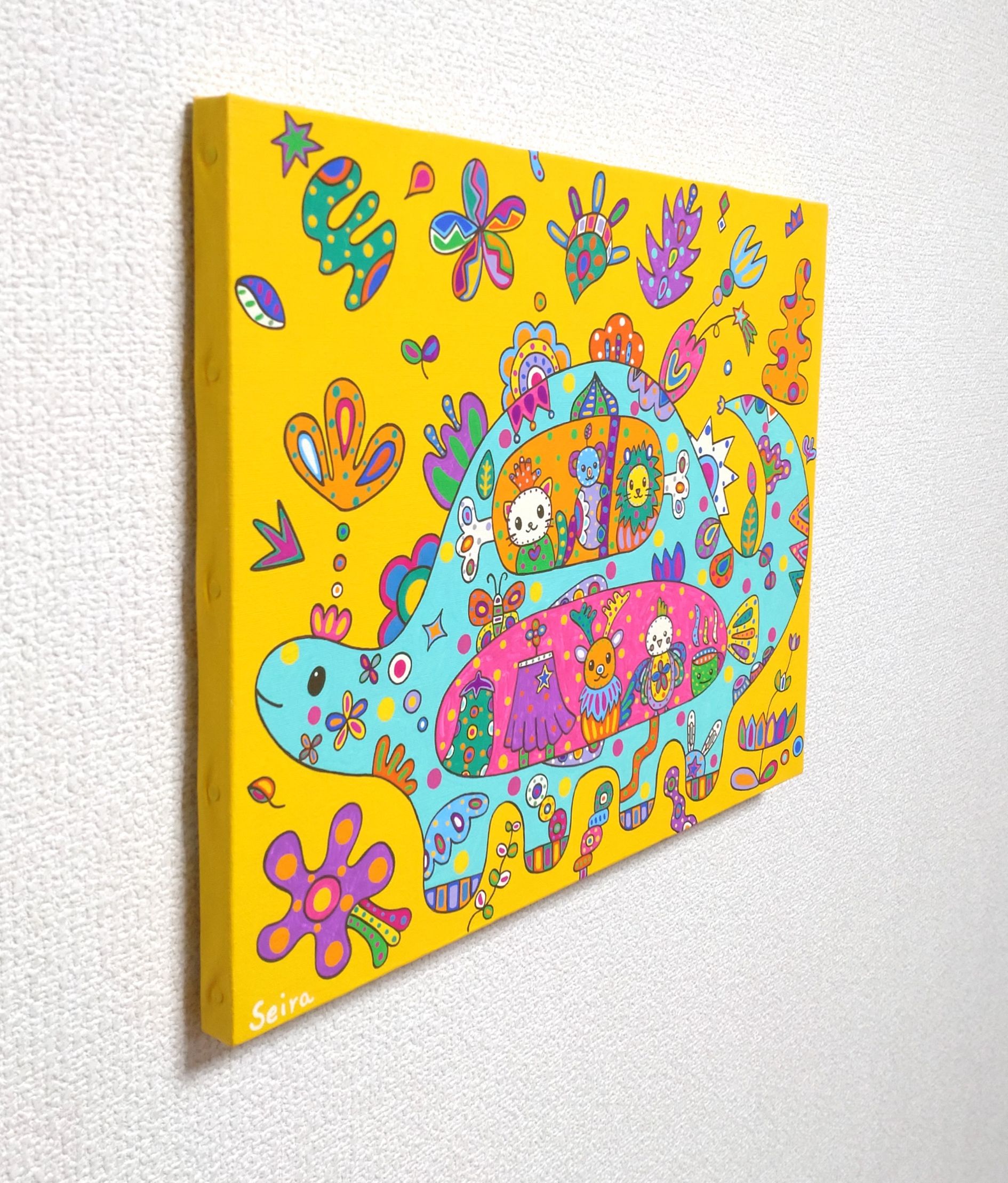 恐竜がお好きな方、お花がお好きな方、明るい作品をお探しの方、子供部屋に飾る作品をお探しの方におススメです。