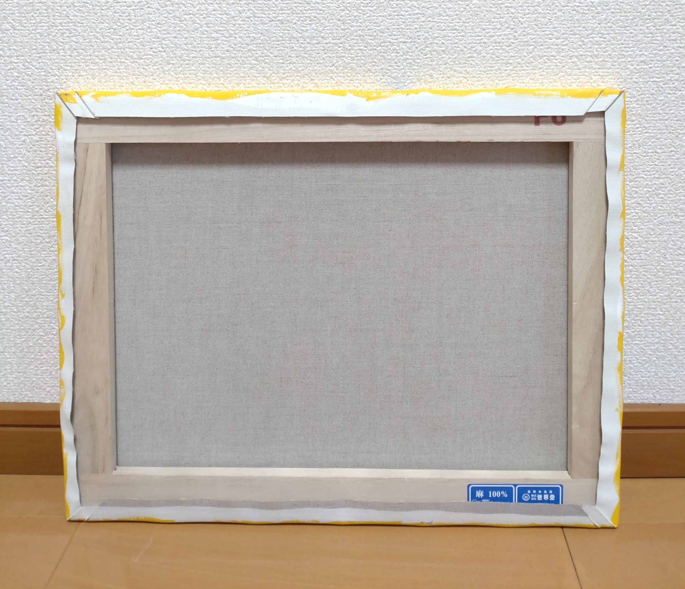 キャンバスのうしろにひもがついておりません。ピンにひっかけていただくと簡単&すぐに展示していただけます。(ふちの部分も色を塗っているので、そのまま飾ることができます。)