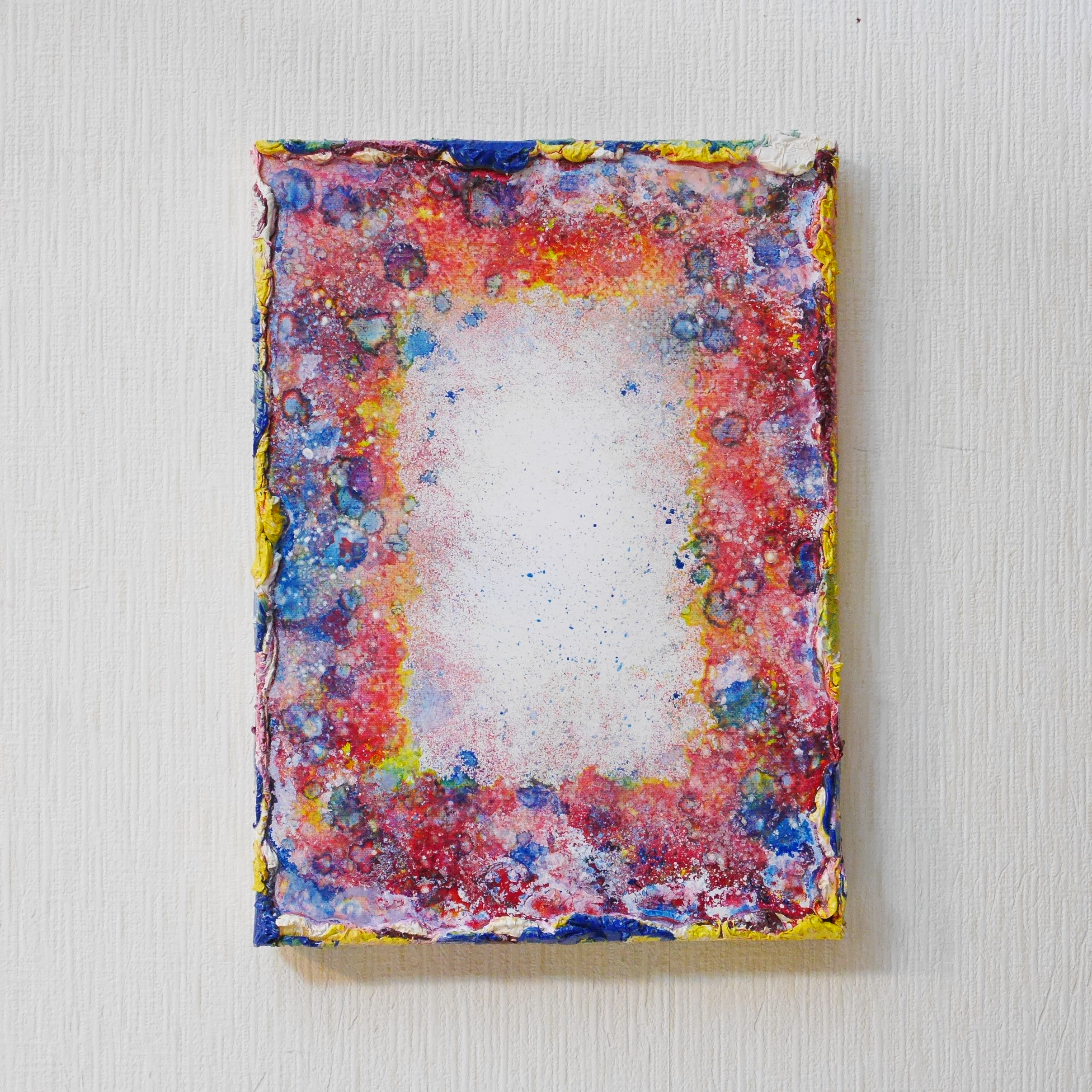 平滑なキャンバスの縁(側面)を「マゼンタ」「青」「イエロー」の三原色が厚みを持って盛られ、キャンバスの正面には華やかに色彩の粒が踊っているようです。