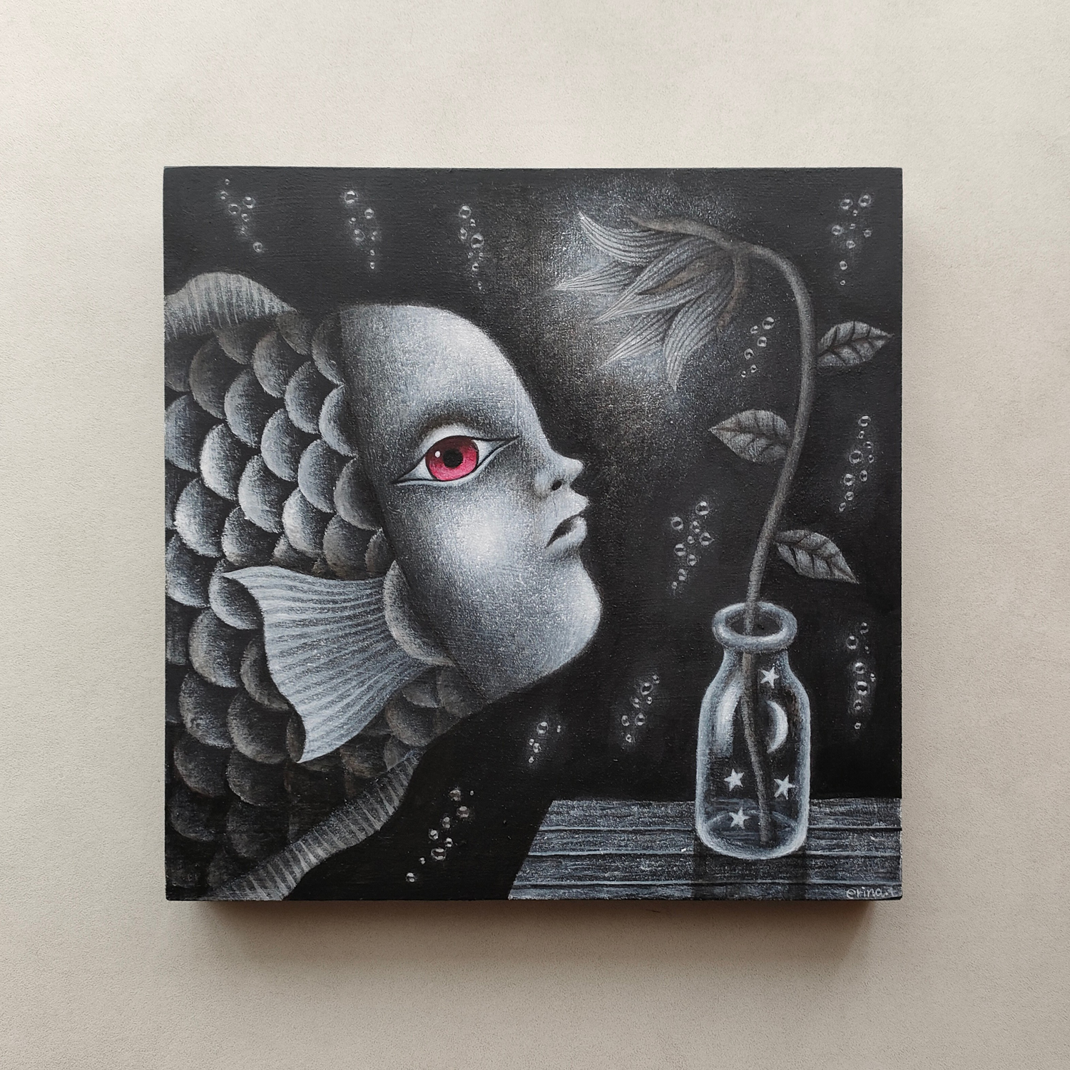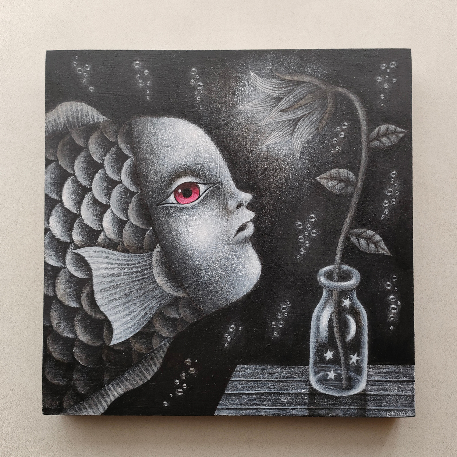花のランプの光に誘われて不思議な魚が泳いでくる場面を描きました。