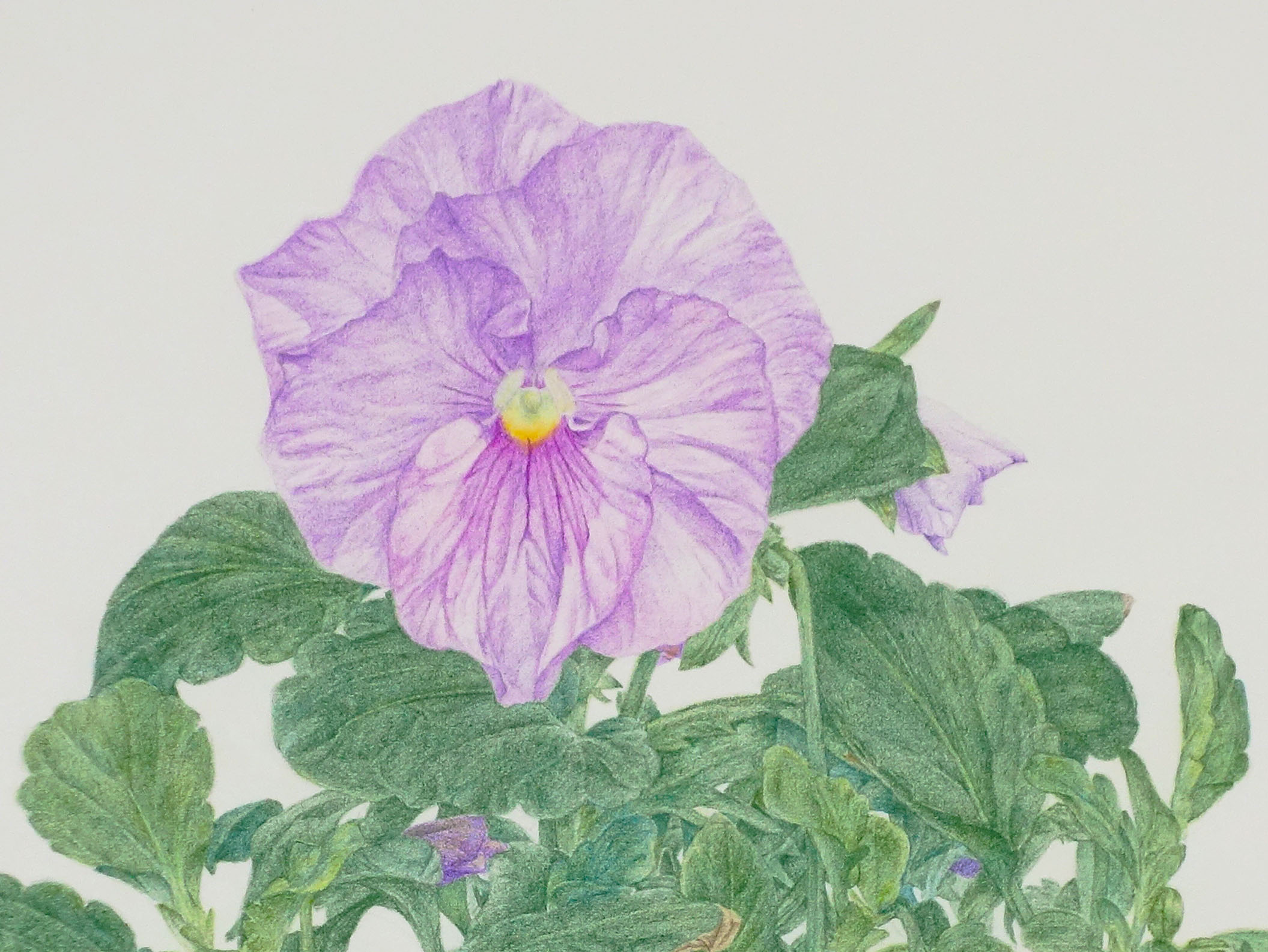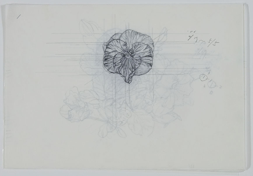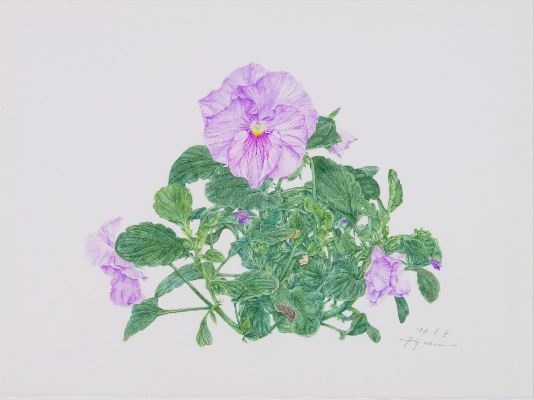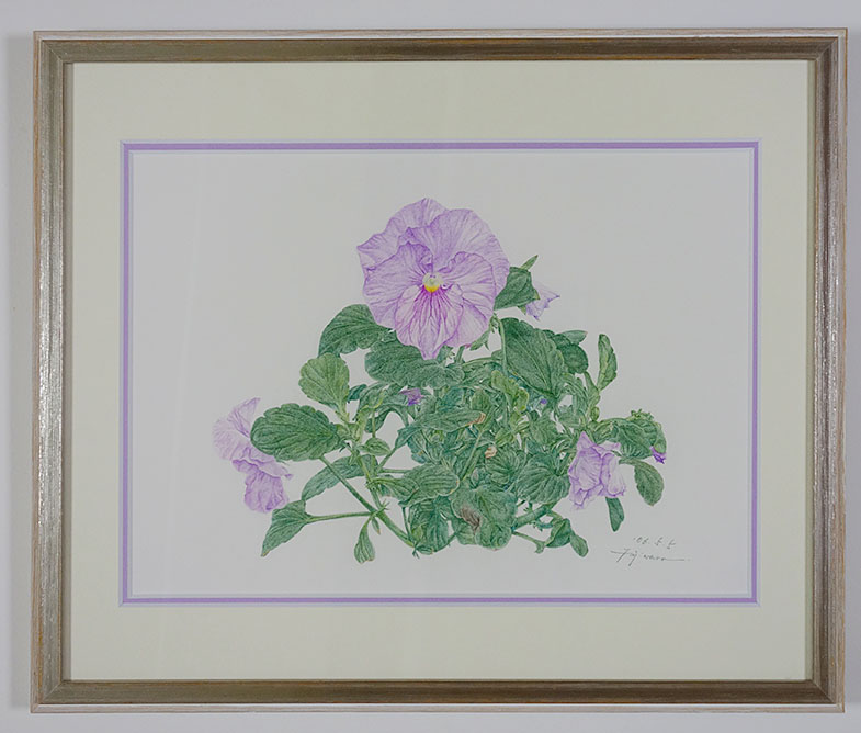 2006.04.19~0.50.5の期間に制作。パンジー、ビオラシリーズの一枚です。単に見て描くのではなく、先に下スケッチを描き、そして本描画紙に転写をして実際に見ながら、形を修正をしながら部分々を描き進めています。ですので、下スケッチ29枚からなっています。これも添えます。植物を描くときは、生活をそれに合わせます。この下スケッチはパンジースケッチの製作過程で見ることができます。最初の一、二枚を額装しても良いと思います。