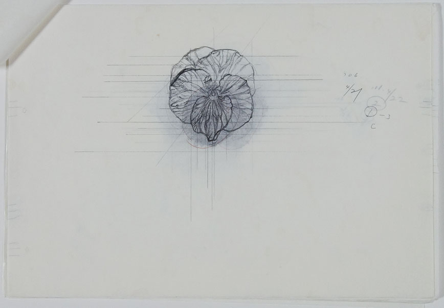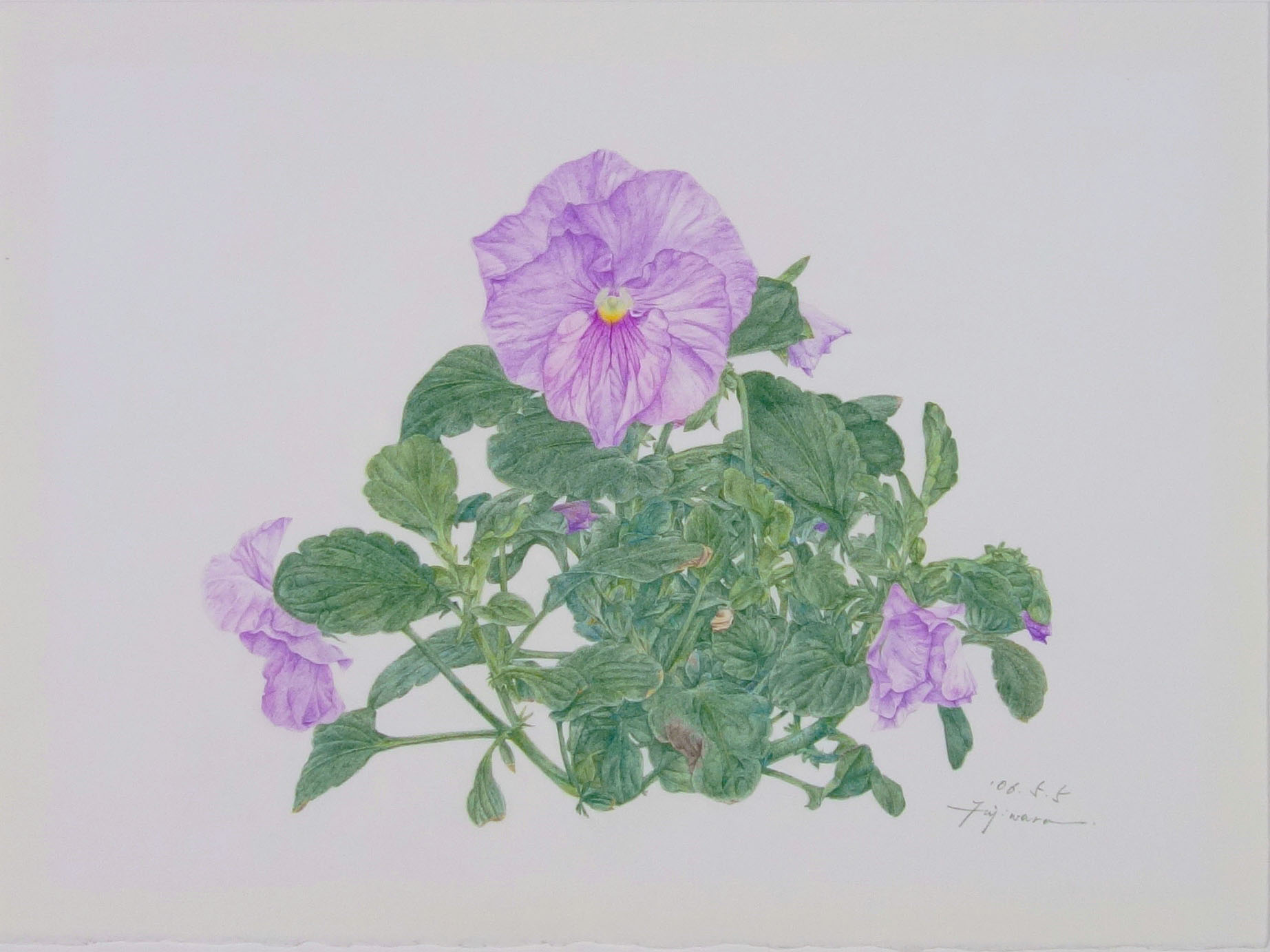 2006.04.19~05.05の期間に制作。パンジー、ビオラシリーズの一枚です。単に見て描くのではなく、先に下スケッチを描き、そして本描画紙に転写をして実際に見ながら、形を修正をしながら部分々を描き進めています。ですので、粗下スケッチ29枚からなっています。これも添えます。植物を描くときは、生活をそれに合わせます。この下スケッチはパンジースケッチの製作過程で見ることができます。最初の一、二枚を額装しても良いと思います。