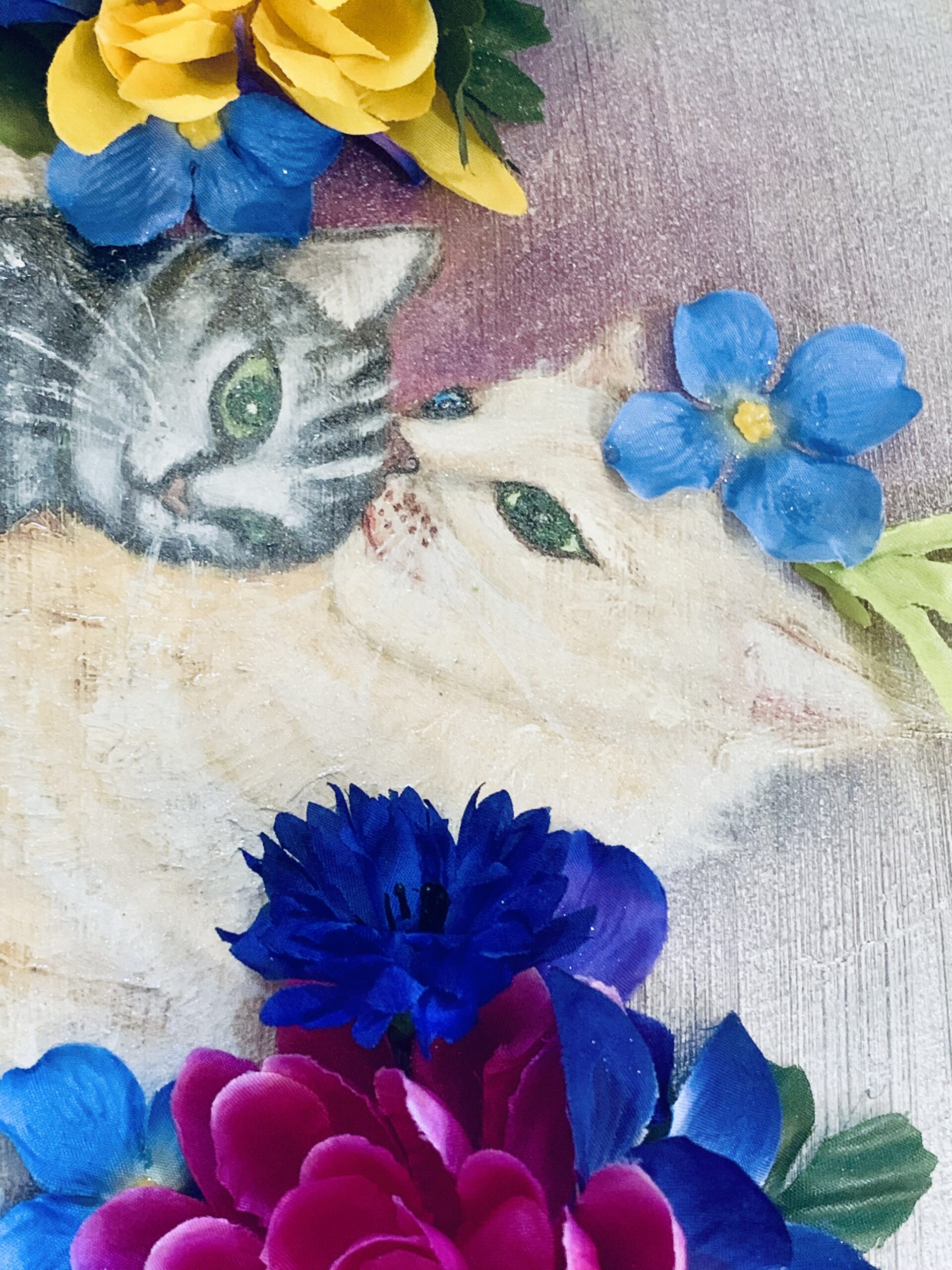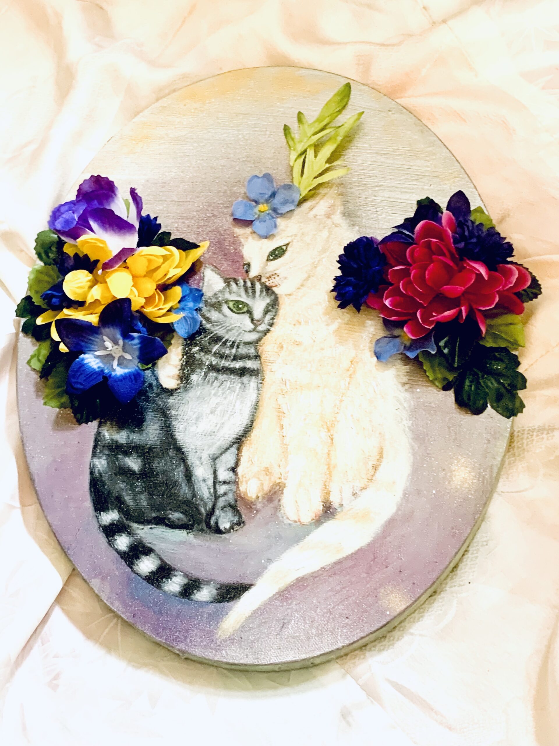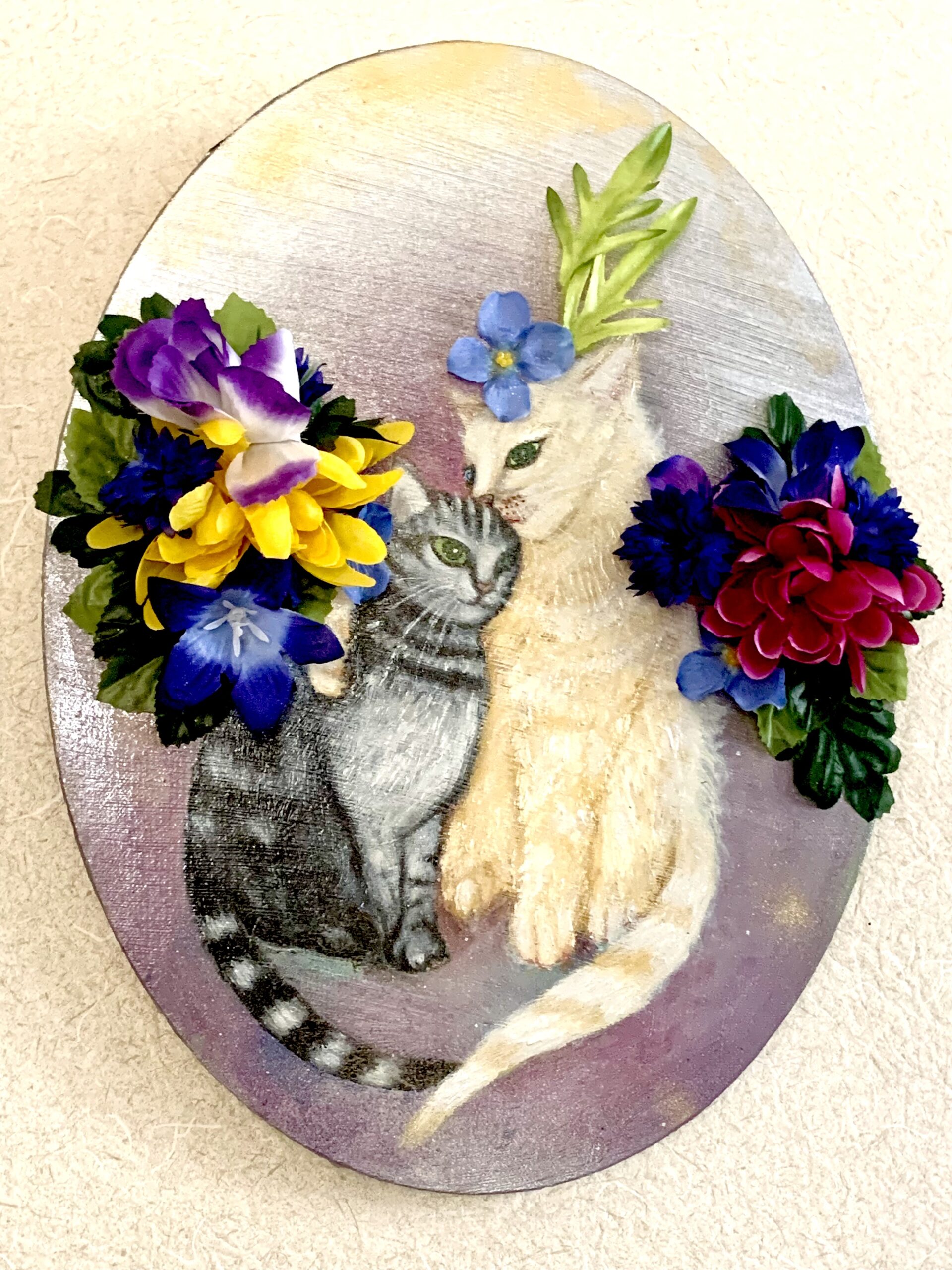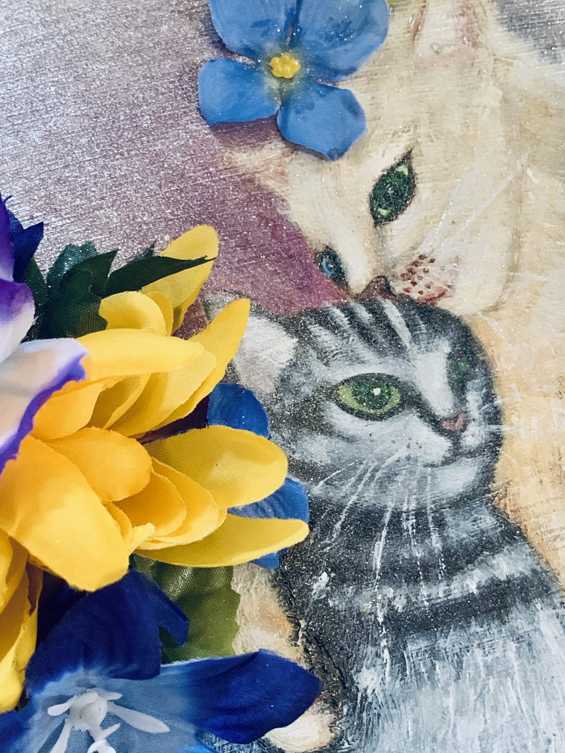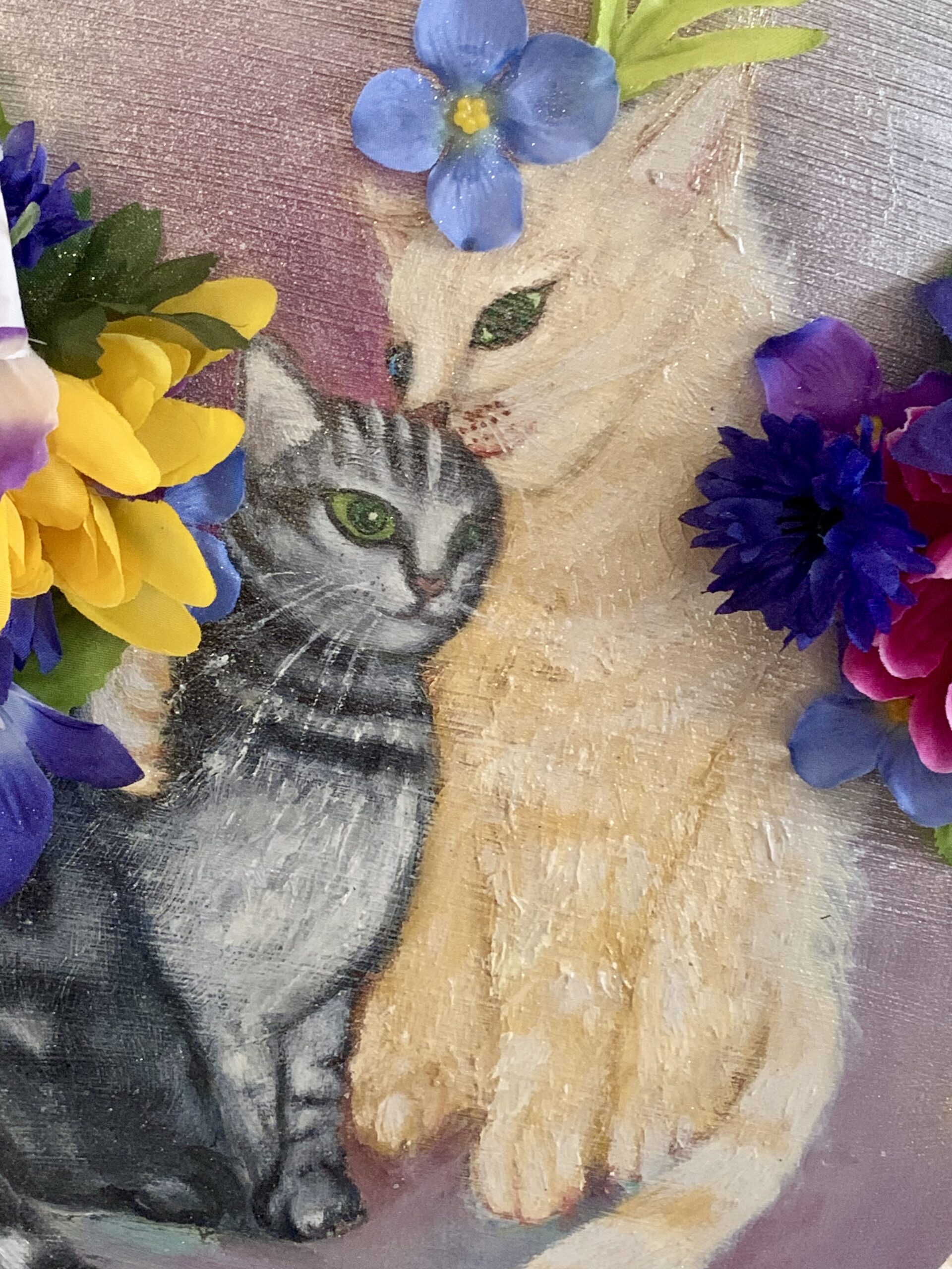 油絵具特有の、時間をかけて丁寧に塗り重ねられた色彩は、猫ちゃんたちの柔らかな毛並みの質感や、体温までもが伝わってくるような温かみを感じさせます