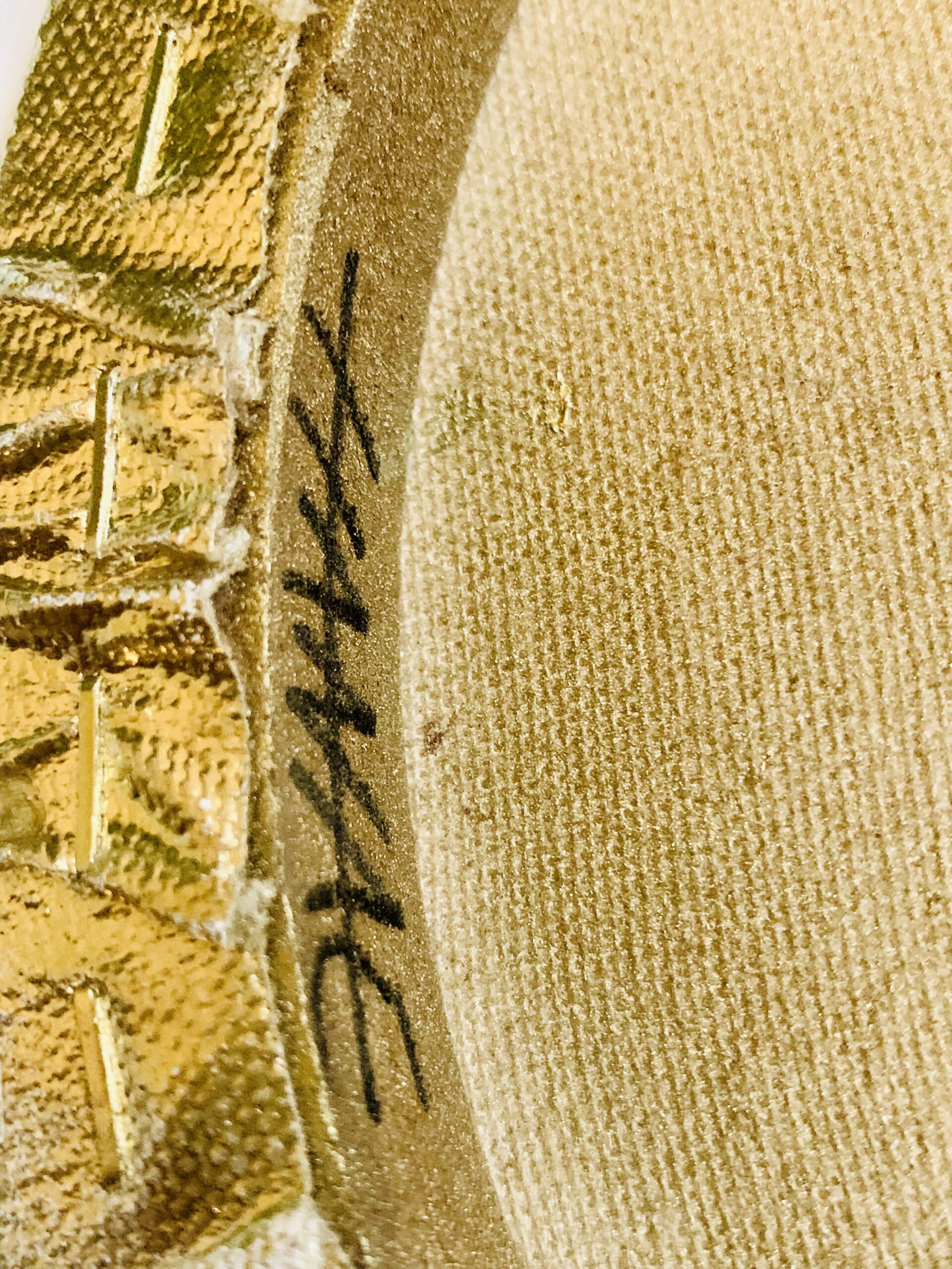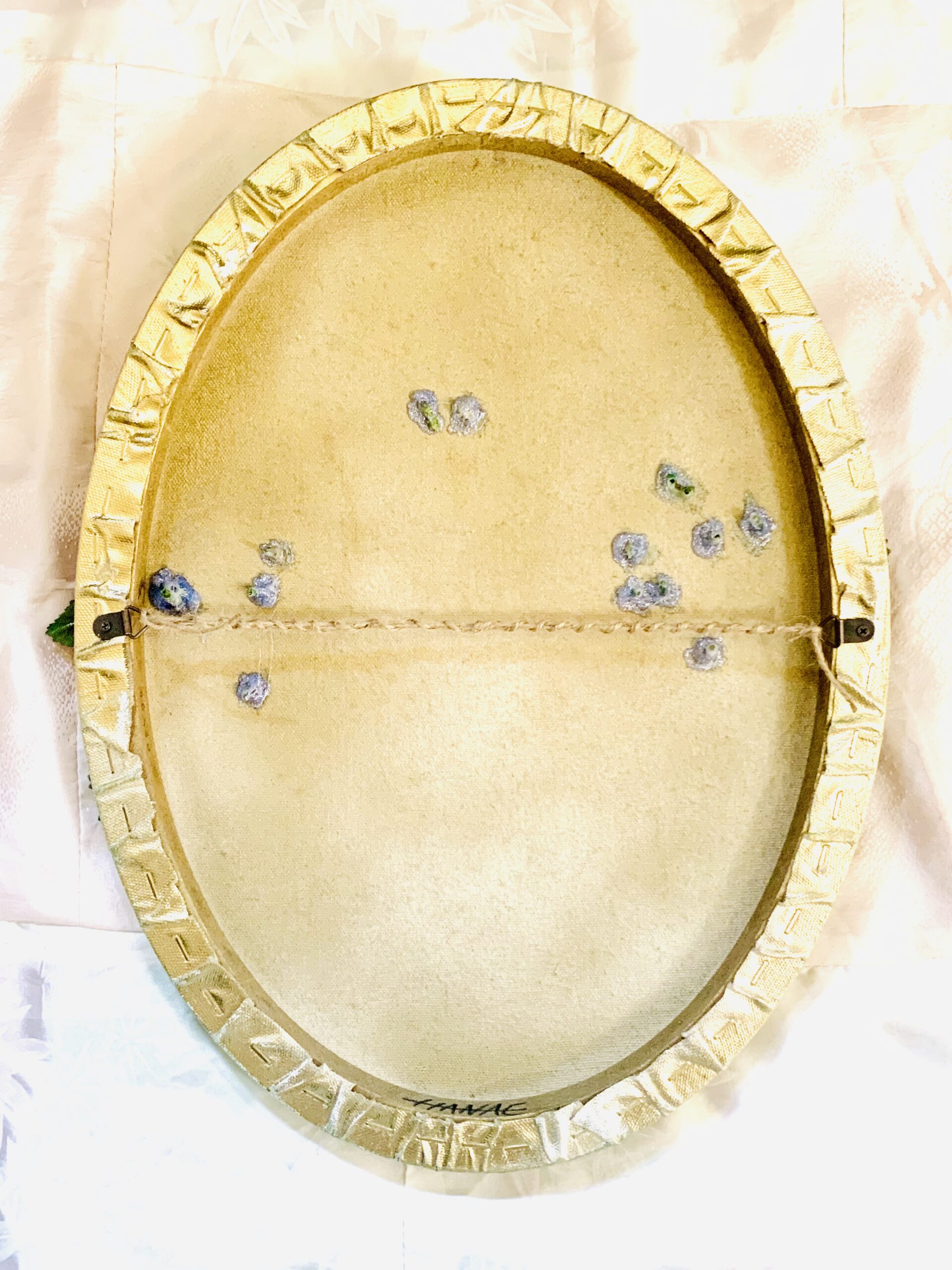 本作は、油彩、金箔、造花を使用したデリケートなミックスドメディア作品です