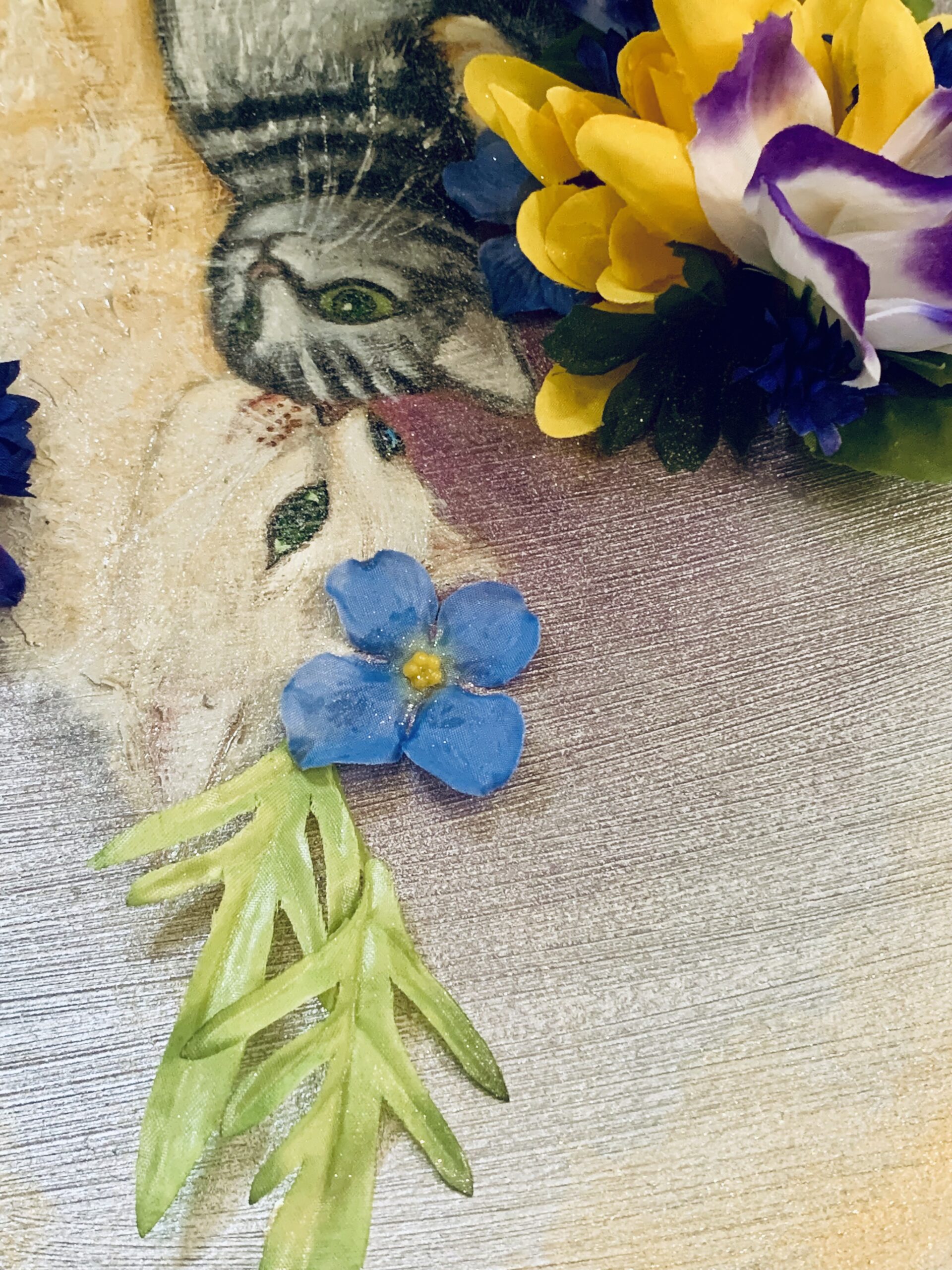 2. 立体部分(造花)について: 画面を彩る造花は、裏面からグルーガンで強固に固定されています