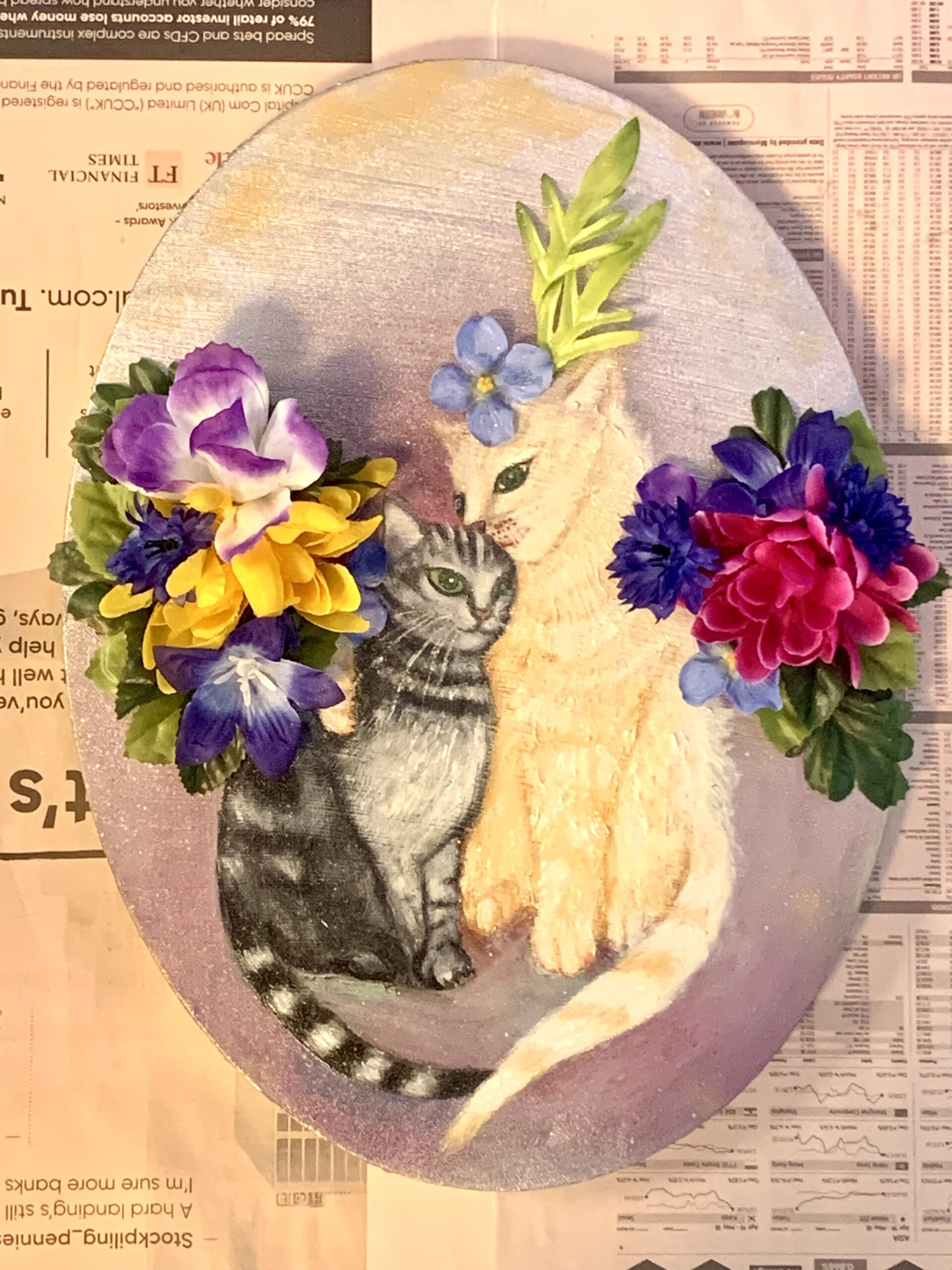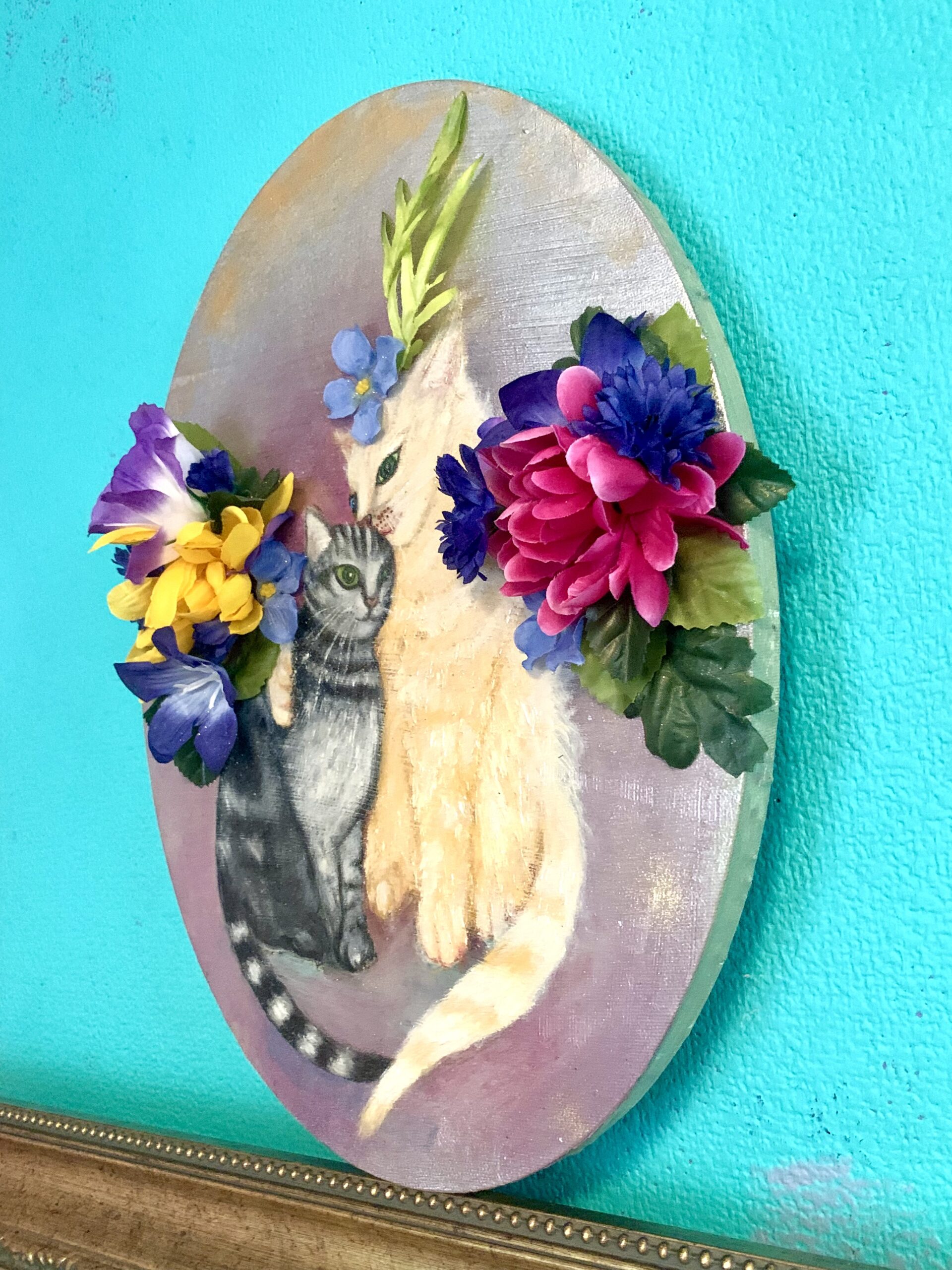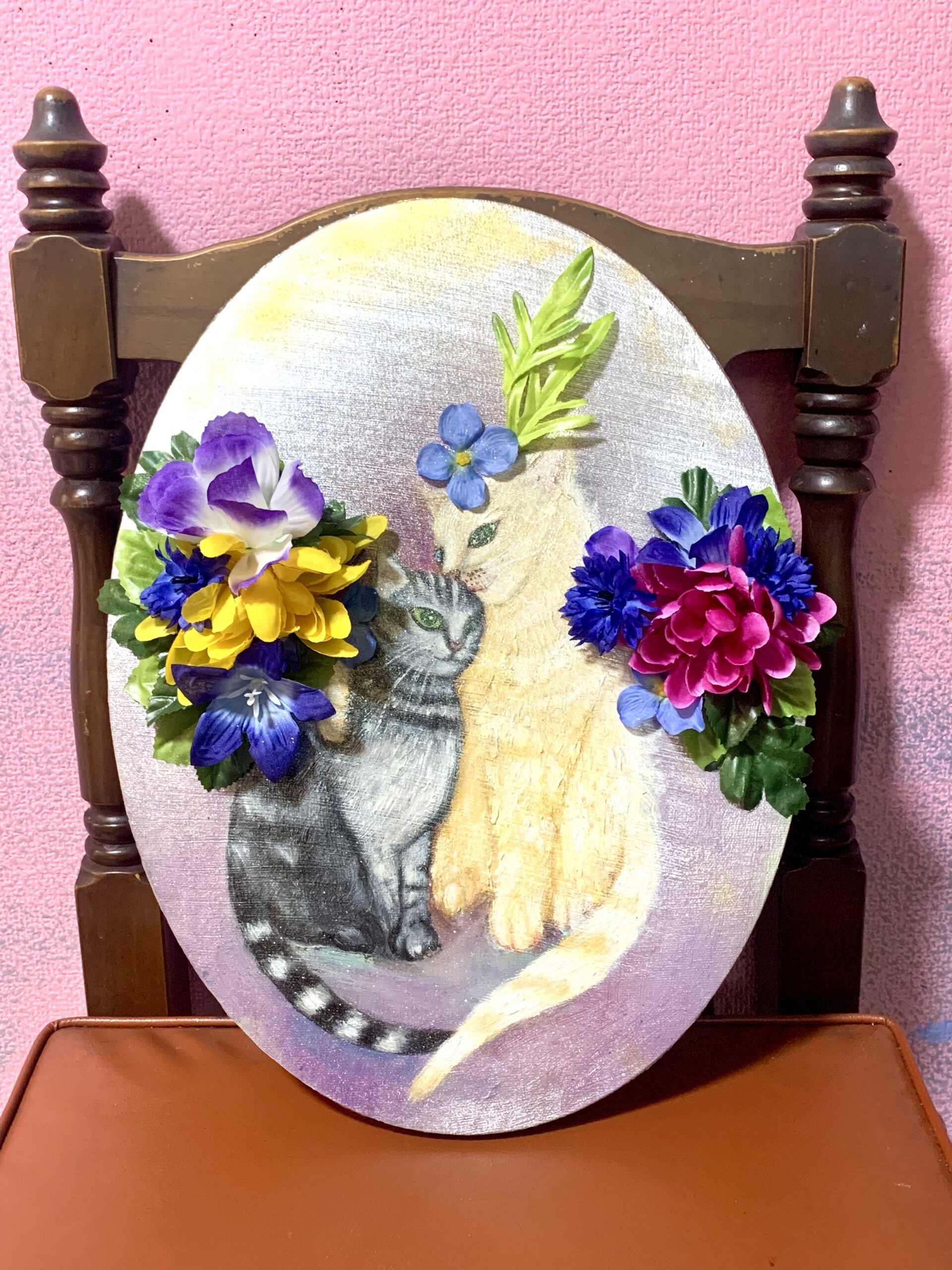 平面の油彩画を彩るのは、左右に溢れんばかりに配置された鮮やかな造花のミックスドメディア