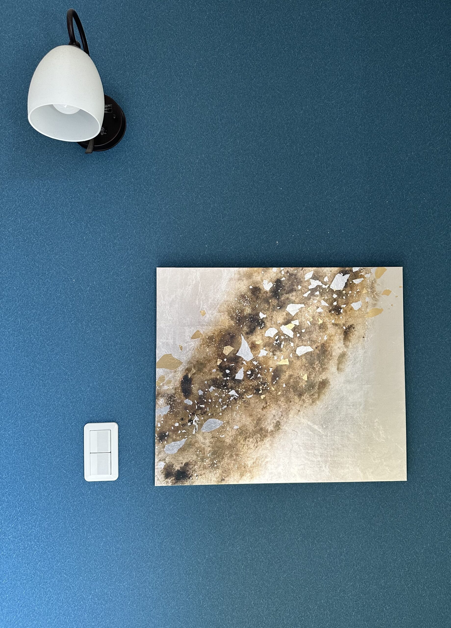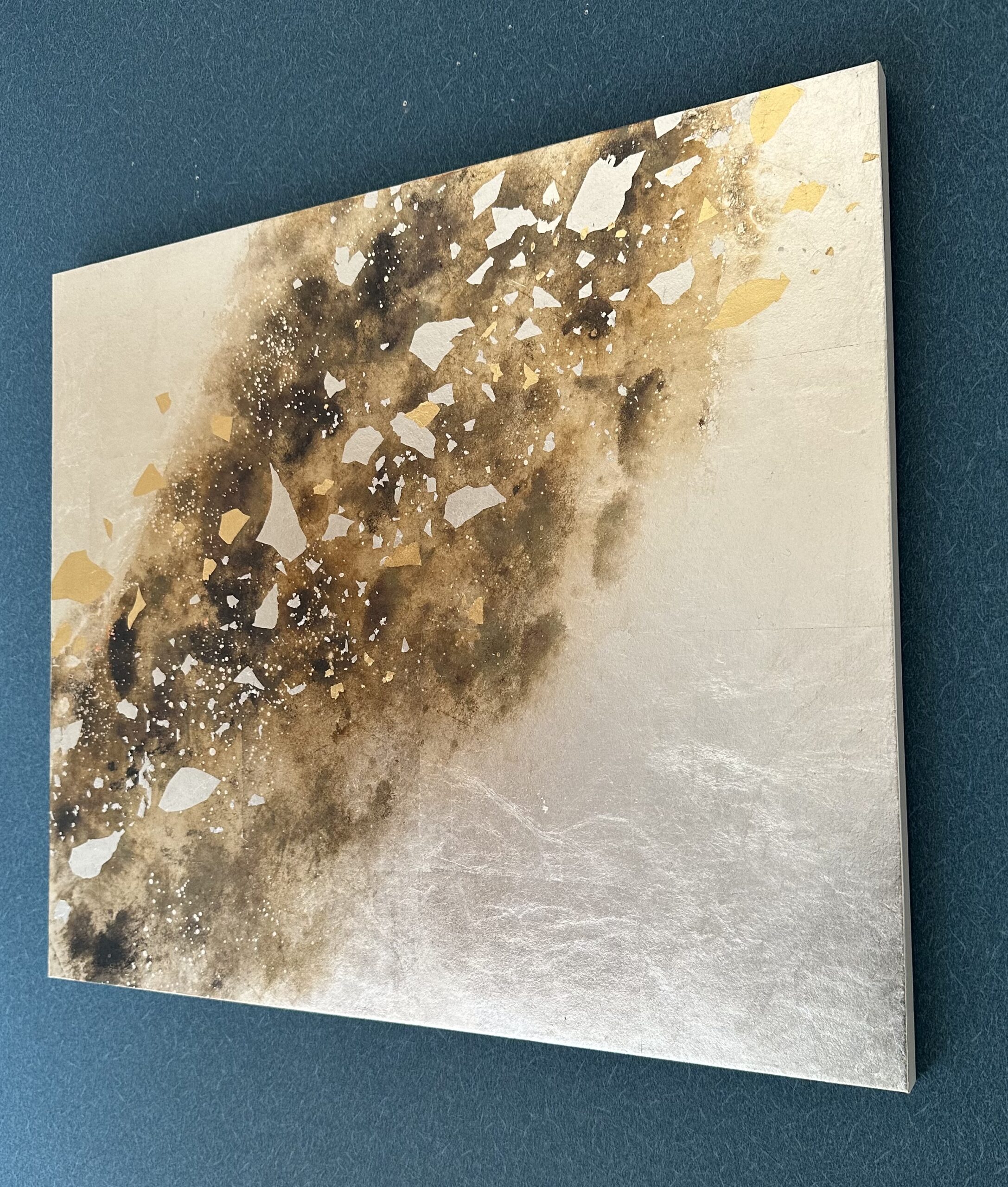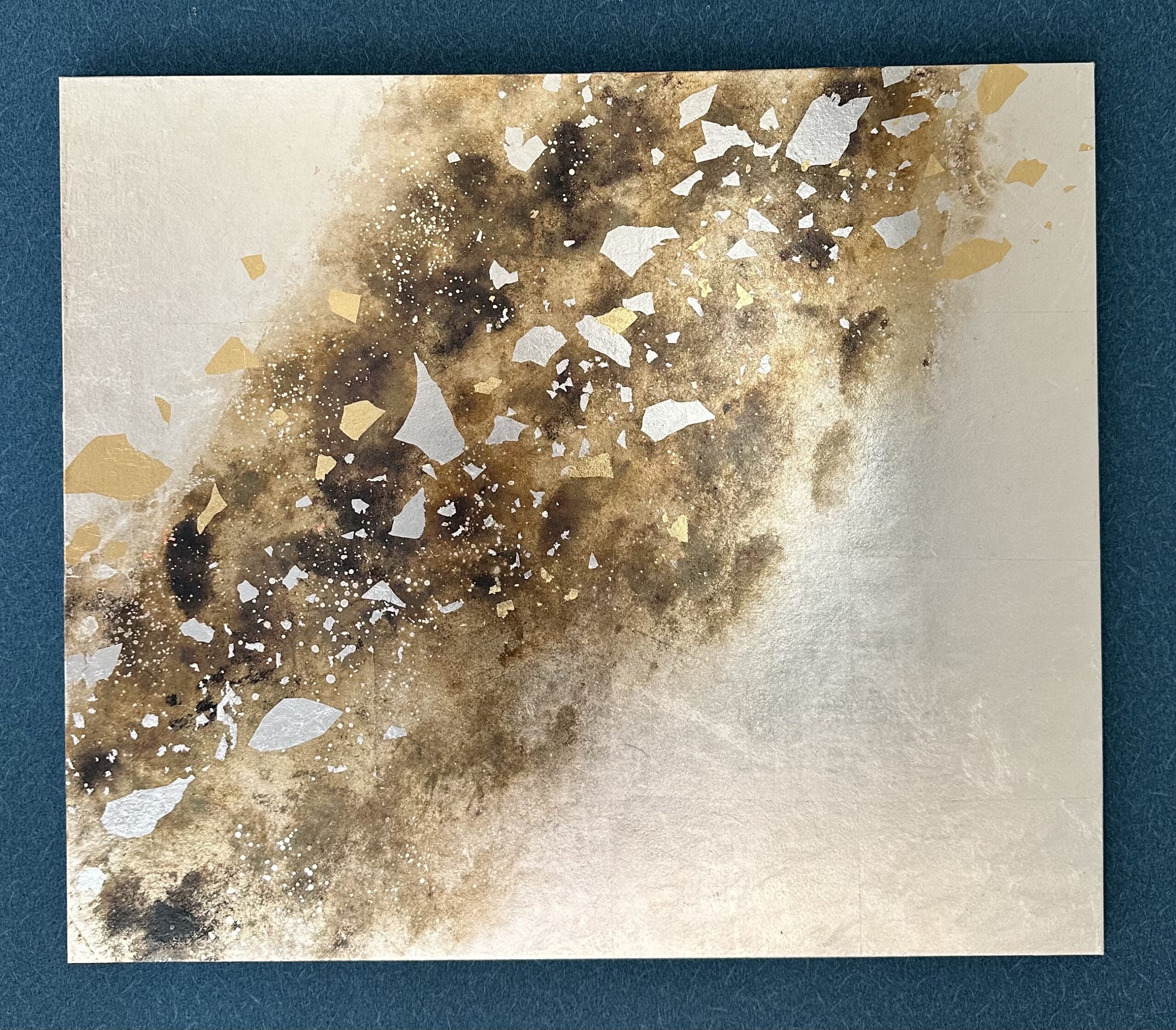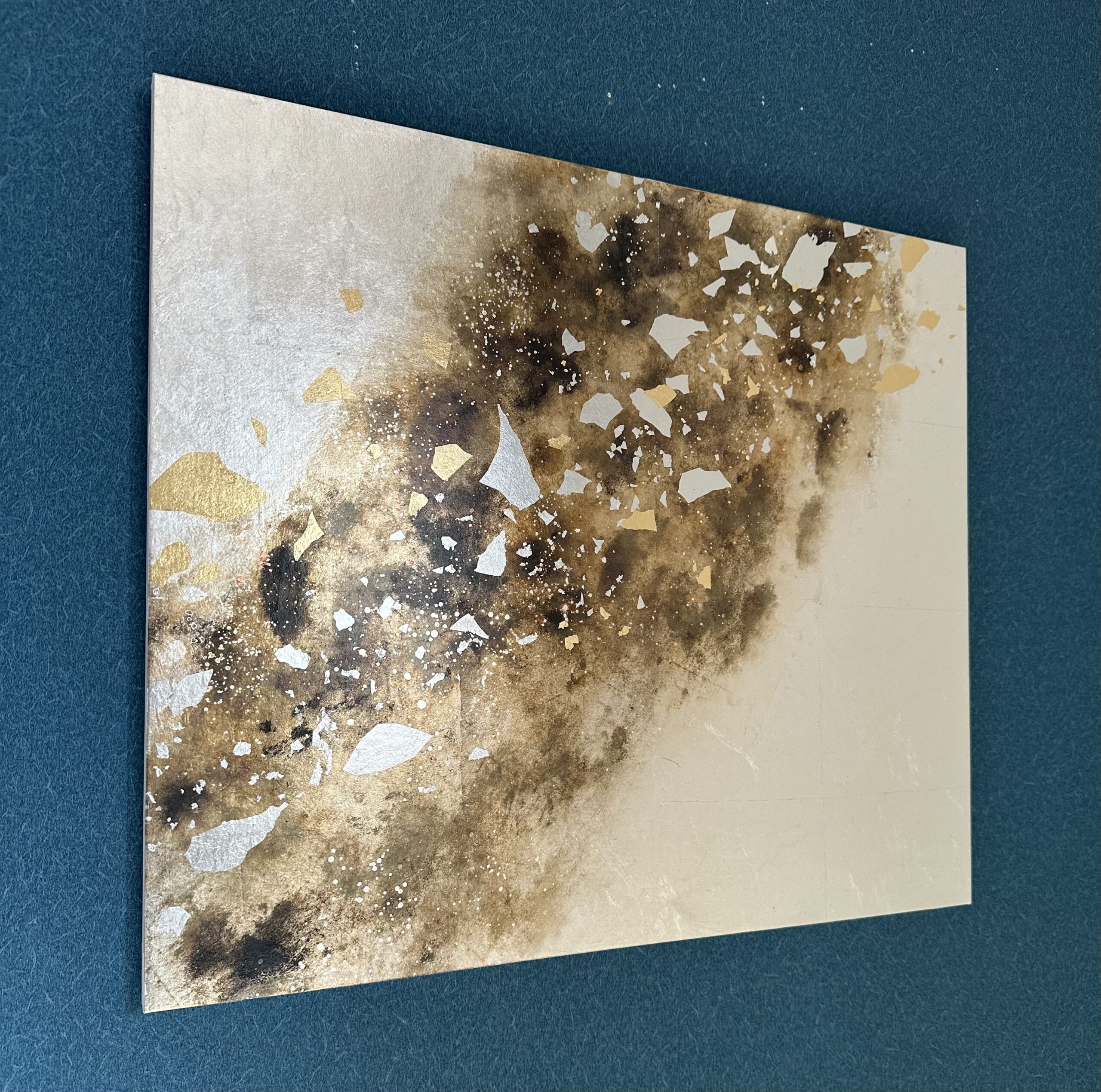 箔を使用した作品は、光のあたり方によって輝き方が変わります。日中の窓から入る自然光、夜の照明の光など、光の違いにより表情がかなり変わります。また、箔の変色を抑えるためのコーティングをしておりますが、時間経過とともに少しずつ色味が変化します。その変化もお楽しみいただけますと幸いです。