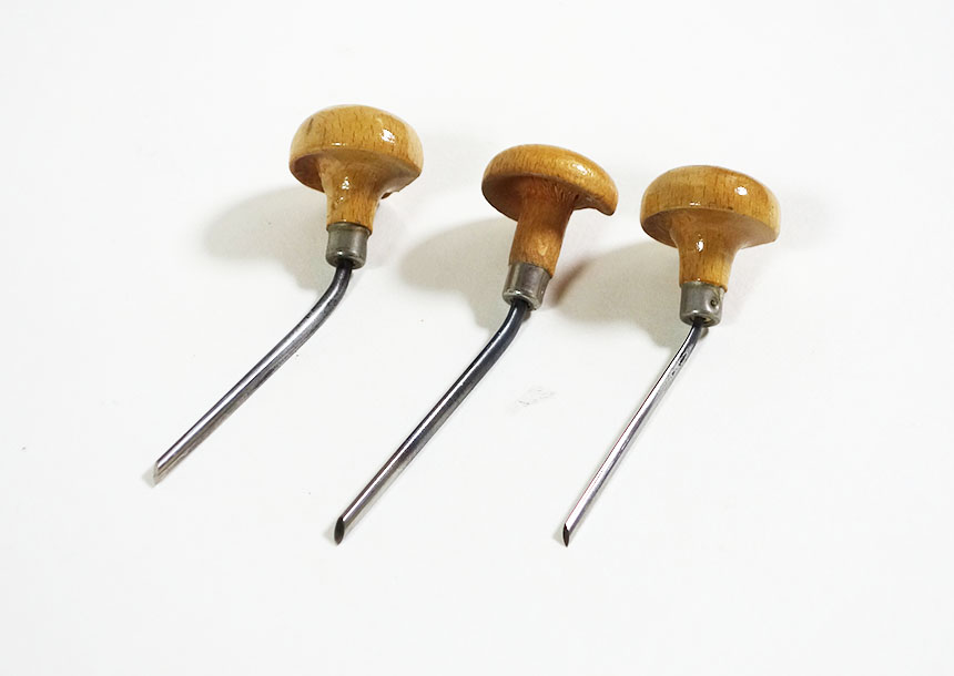 ビュランを用いたエングレーヴィング作品になります。参考画像にあるのが、この作品で三本の太さの異なる楕円ビュランを使用しています。楕円のビュランを使用することで滑らかな曲線を彫ることができます。参考画像の楕円ビュランは、彫刻見本と同じで、左から中、大、小の順です。見本の銅版はメッキを施しています。