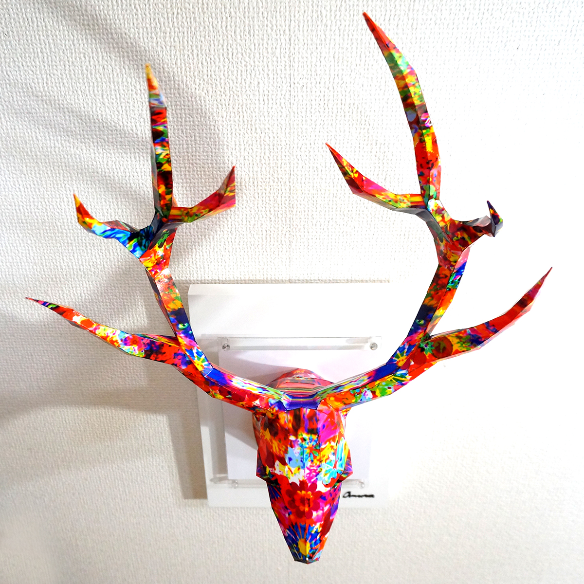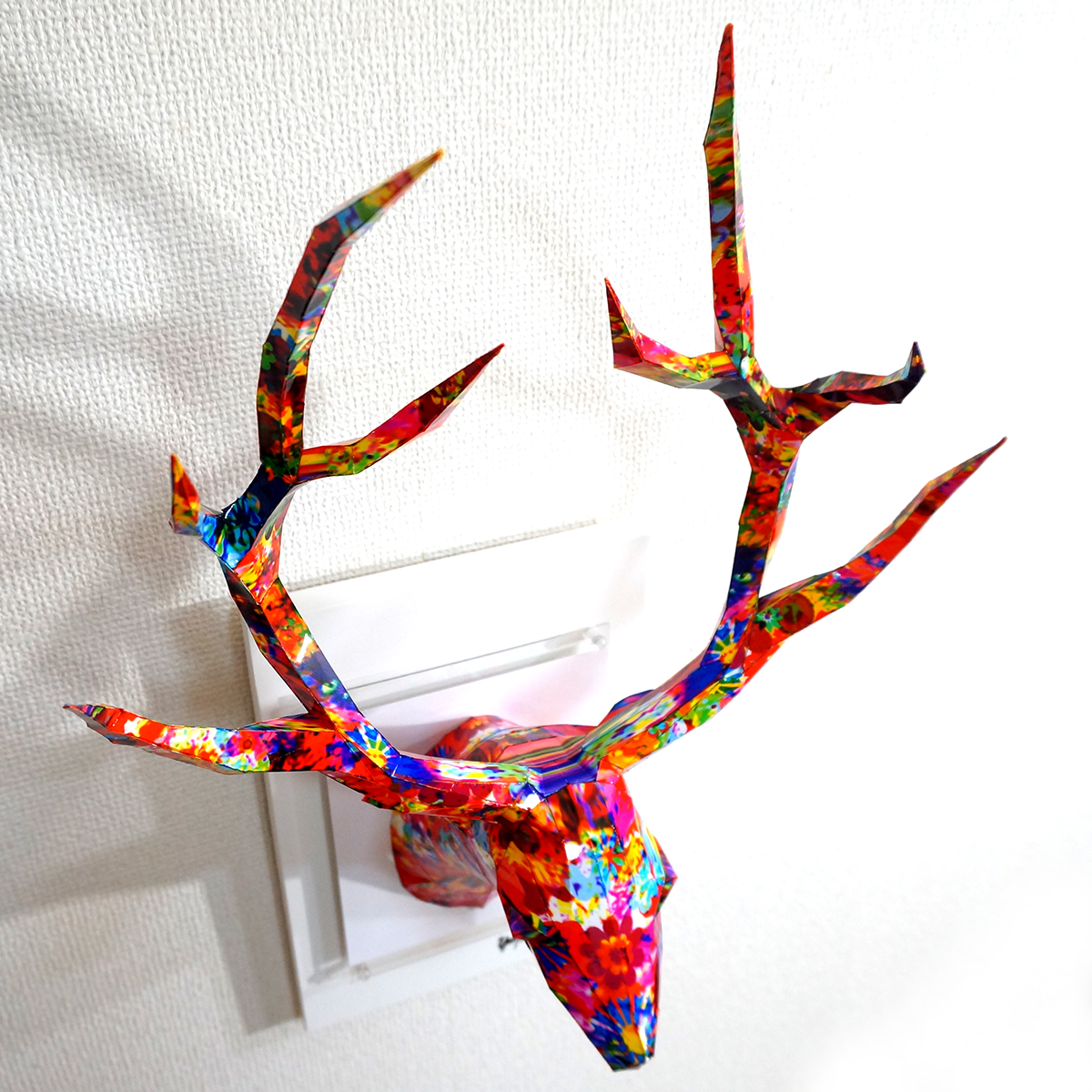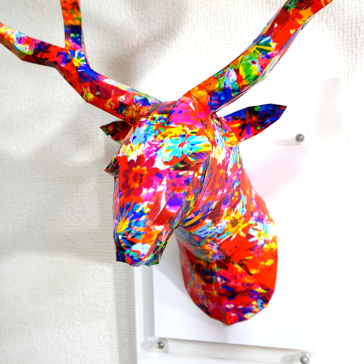 ペーパークラフト技術を用いて制作した鹿のハンティングトロフィーの作品です。