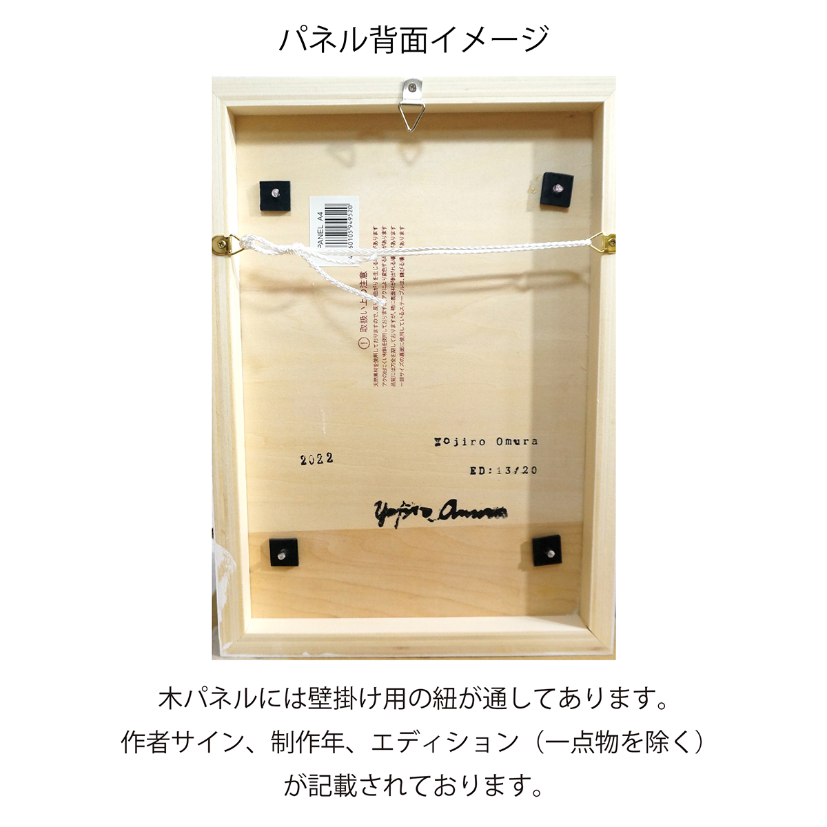 パネルの裏面には紐掛け用のフックを取り付け、制作年、作者サインを記しております。
