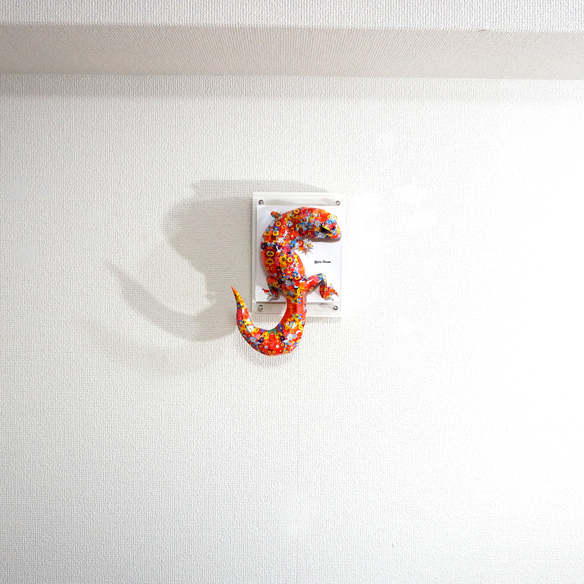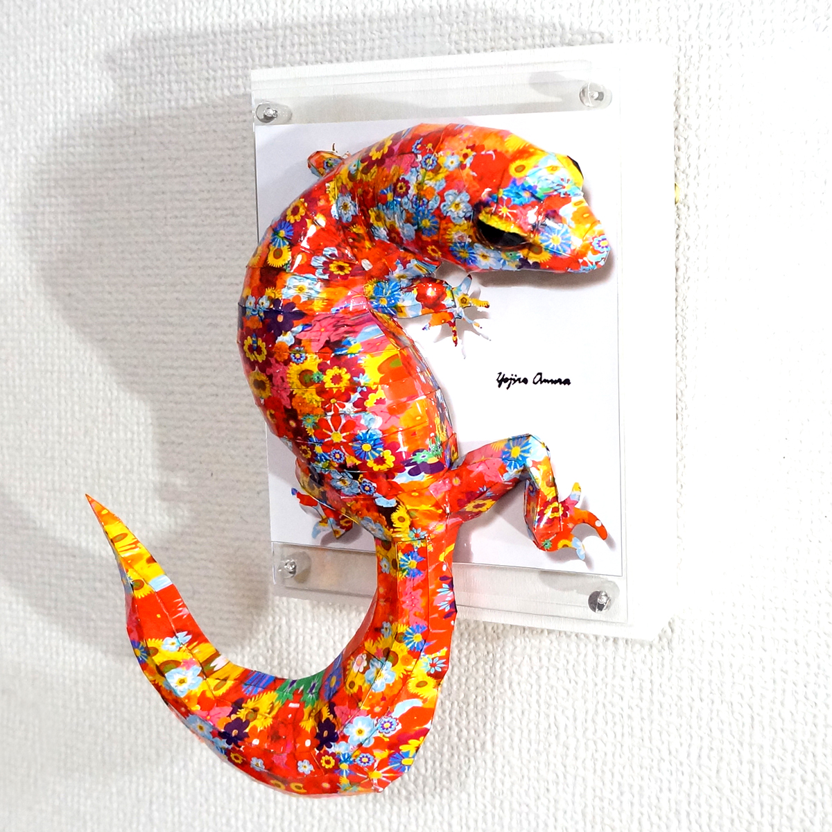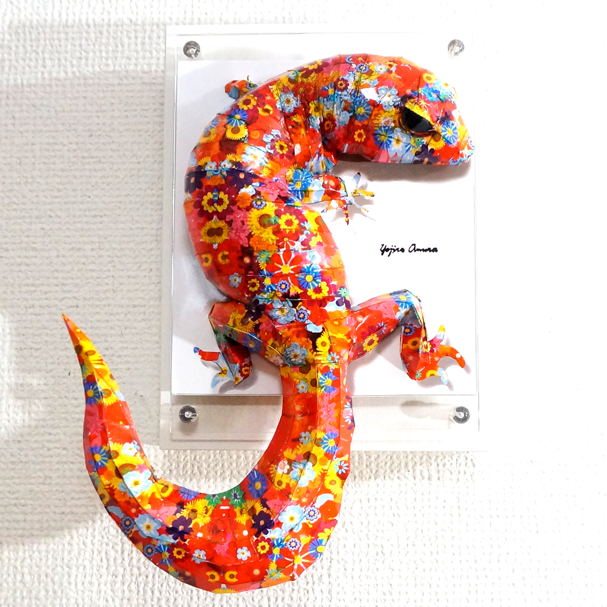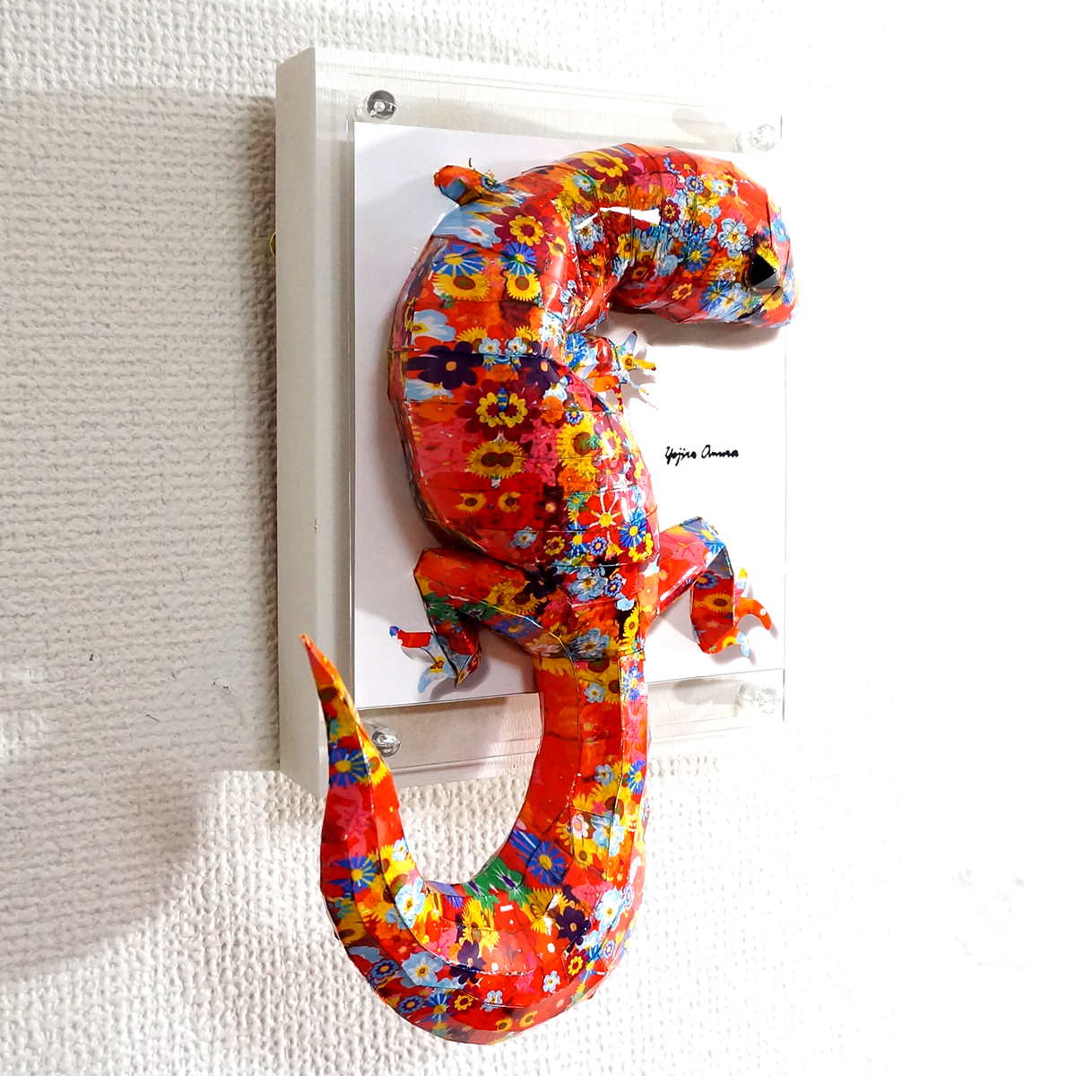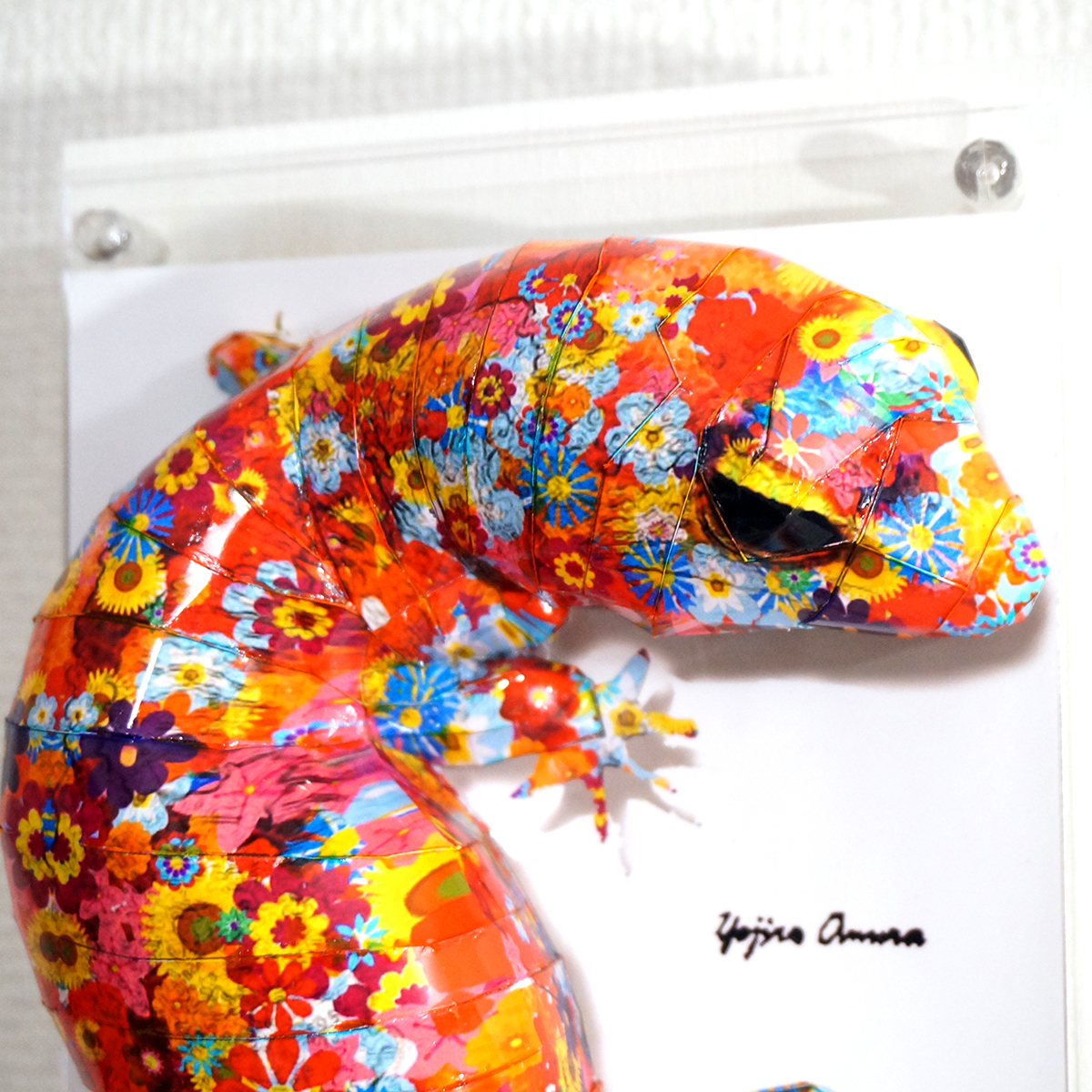 カラフルな花柄模様をトカゲ本来の表情と重ね合わせたデザインです。表面上は光沢紙の艶のある質感となっております。