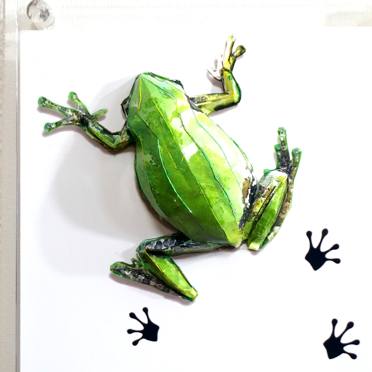 アマガエルのコラージュ画像を作成し、ペーパークラフト技術を用いて立体的に表現した作品です。