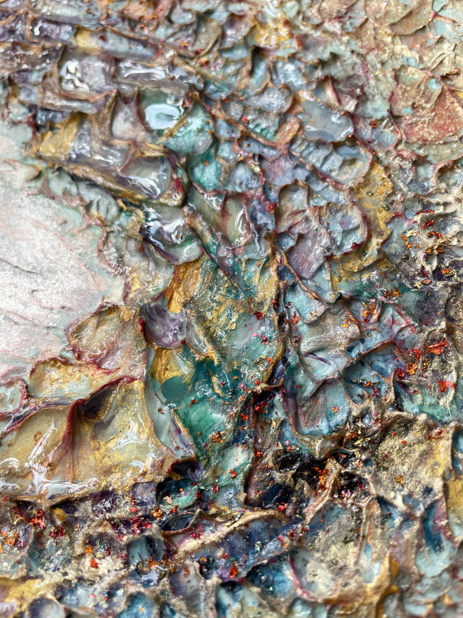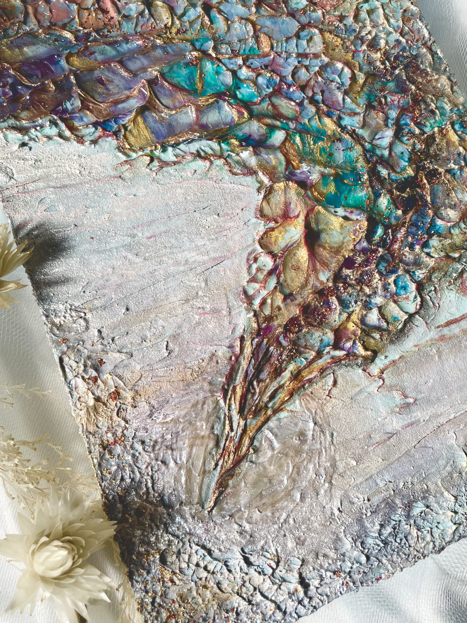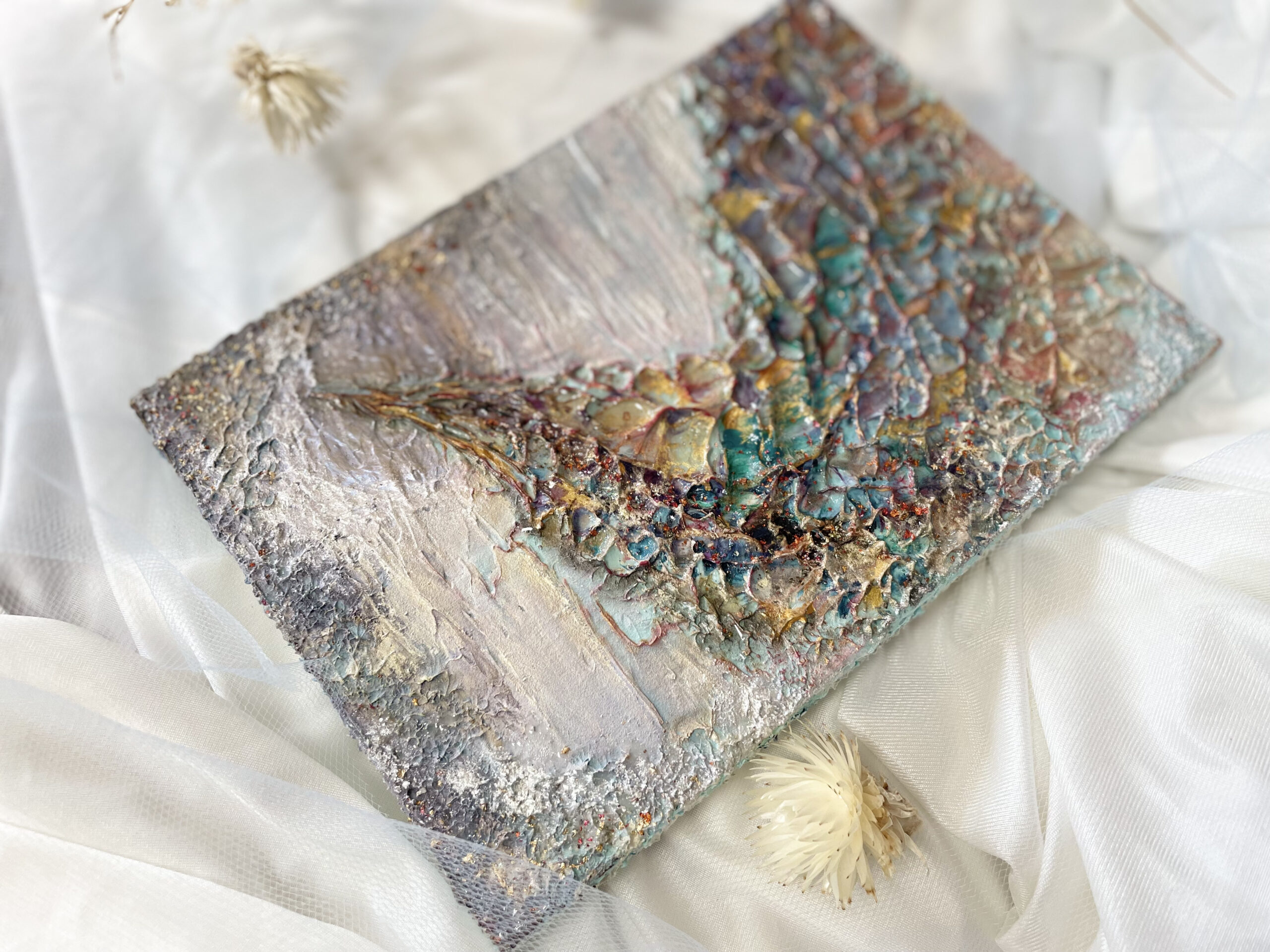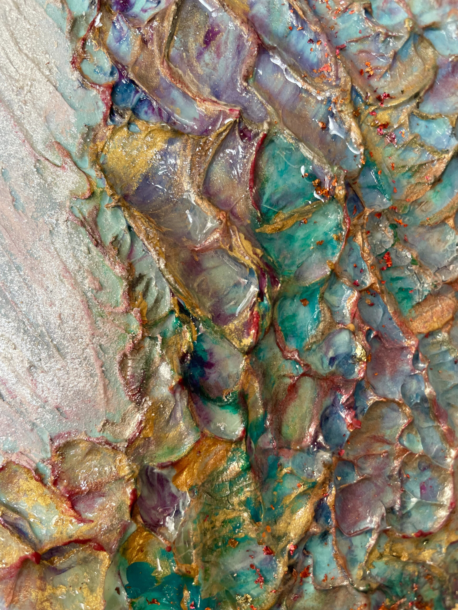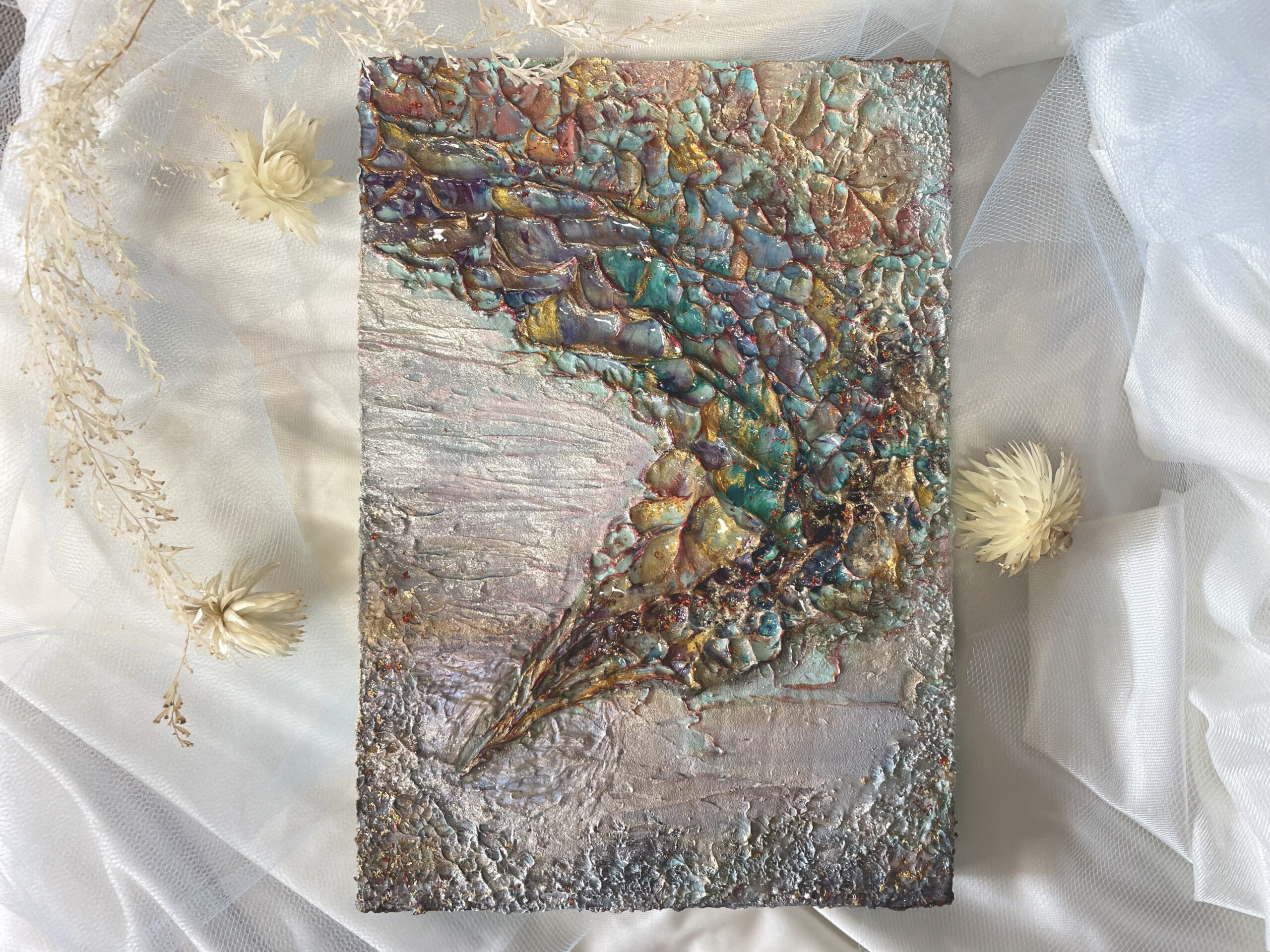 十二単の重なる色の層のように色鮮やかに、そして部分的にレジンを流し込み艶のある立体感を出しました。