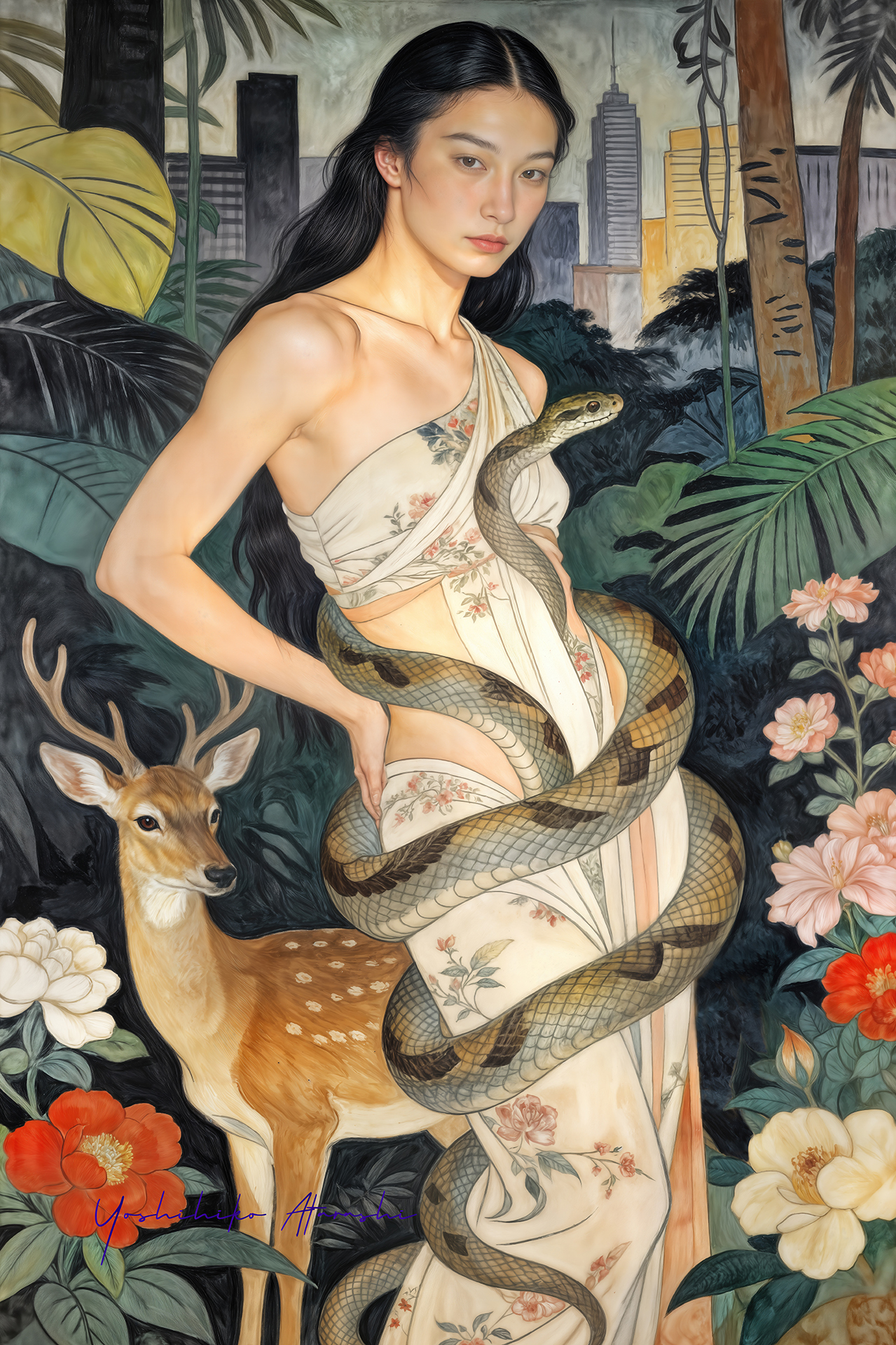 これらの作品は、自然と人、そして都市の気配が静かに重なり合う瞬間を描いています。蛇や植物、鹿といった象徴的なモチーフは、生命の循 環や内なる欲望、再生のイメージとして配置しました。曲線を強調した人体表現と装飾的な画面構成は、日本画や装飾絵画の影響を意識しつ つ、現代的な感性で再構成しています。見る人が物語を読み取るのではなく、時間や感情の揺らぎを画面の中で漂わせることを大切にしまし た。