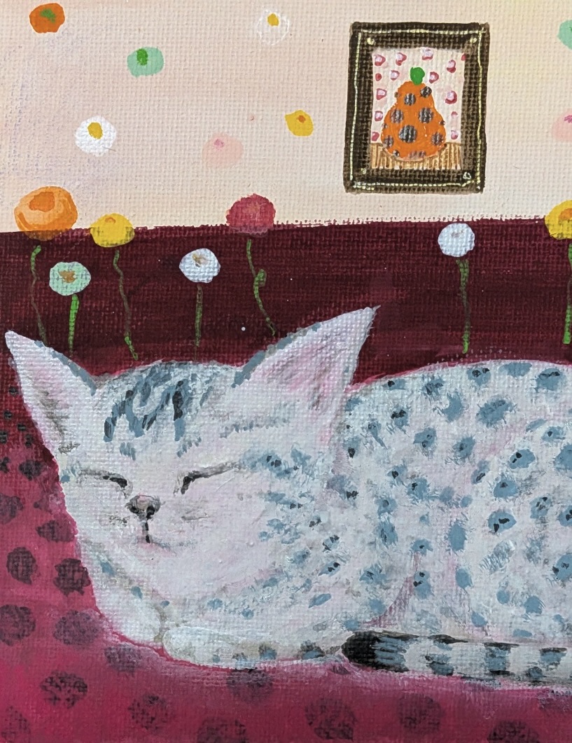 ミニキャンバスにスポット模様の子猫を描いてみました。床も背景も点々模様を描いて遊びっぽい絵にしてみました。遊び疲れてちょっとうたた寝しているところです。壁に飾れるように金具もお入れします。
