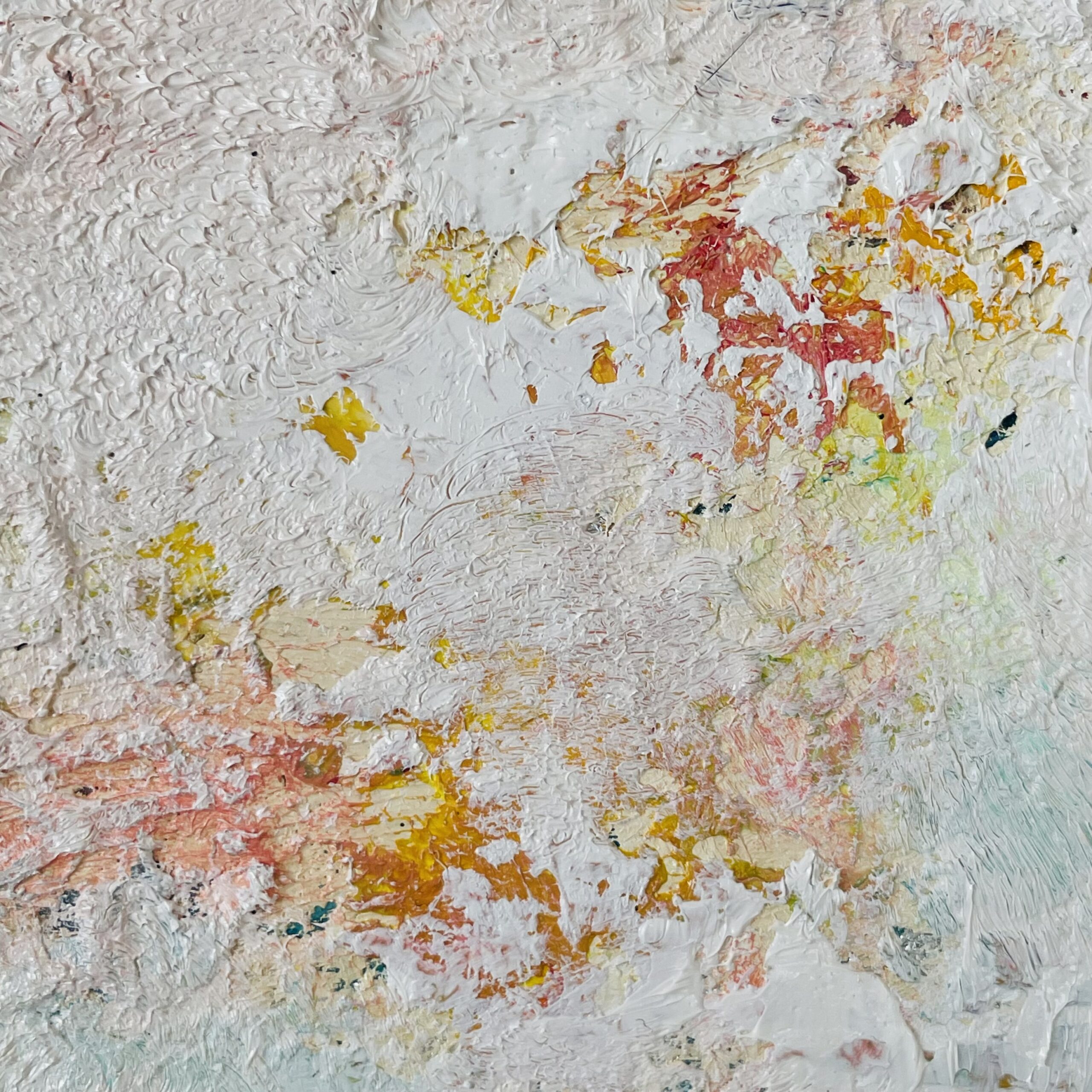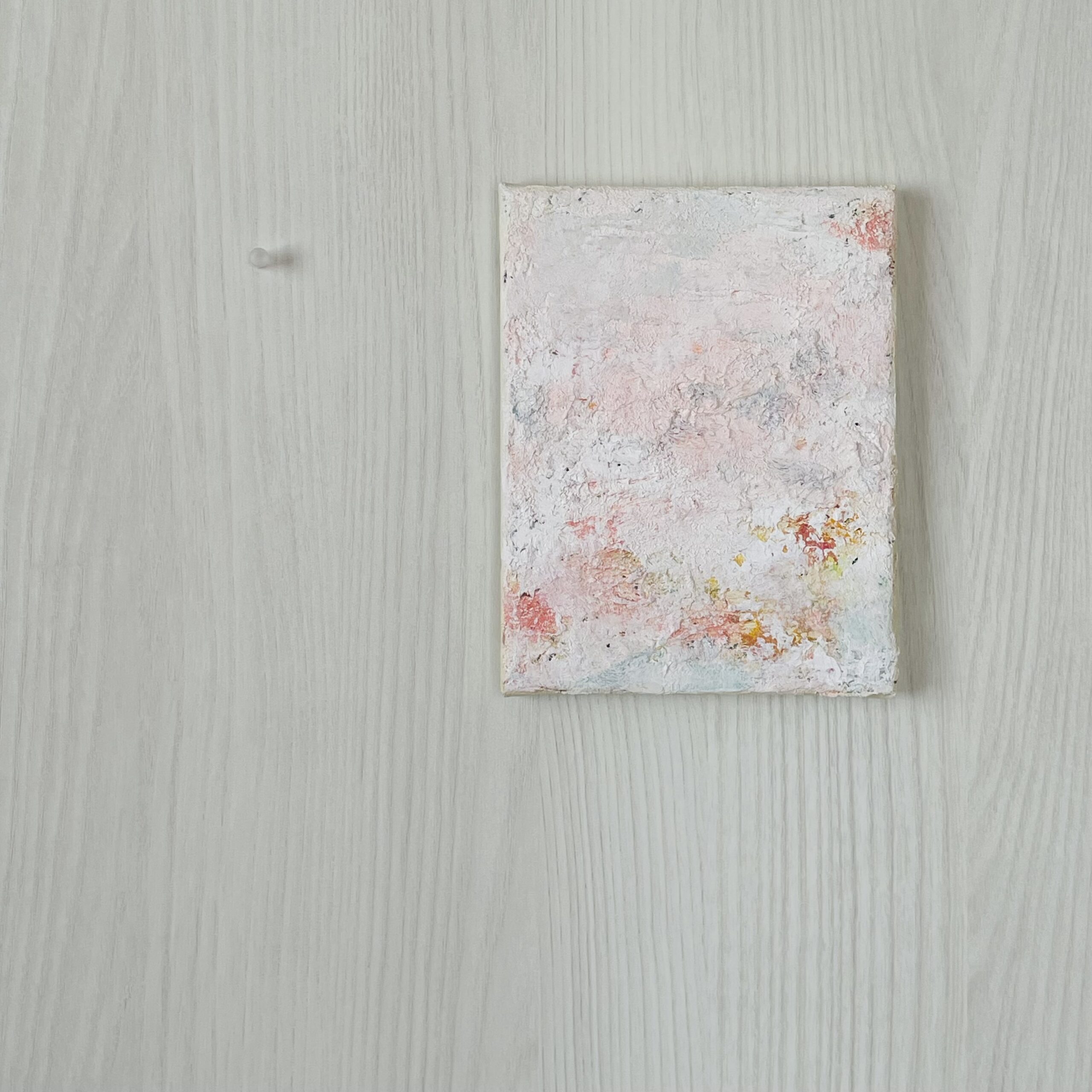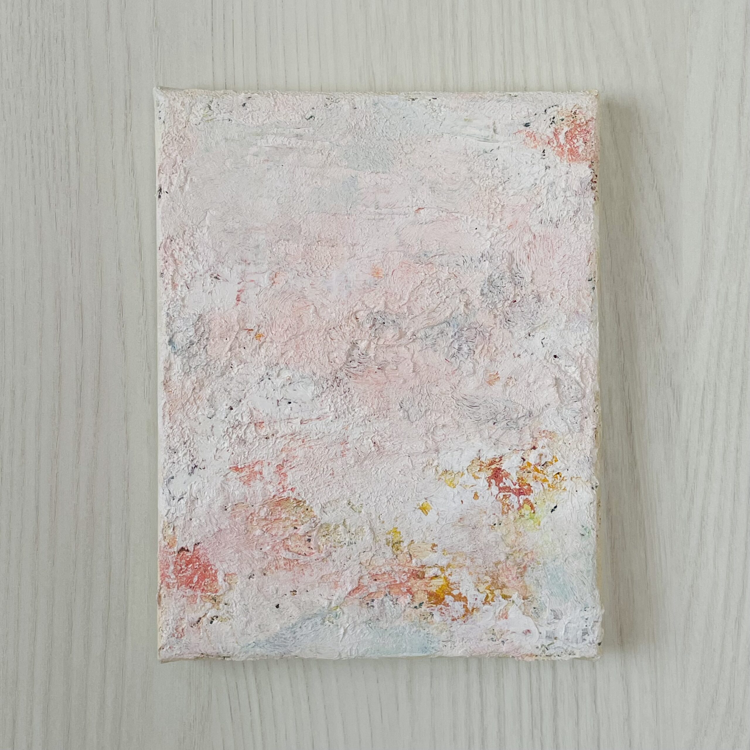乾いた盛り上げ剤の上にさまざまな色を重ねたあと、最後にほんのりと黄色みを帯びた白で覆うように仕上げた作品です。