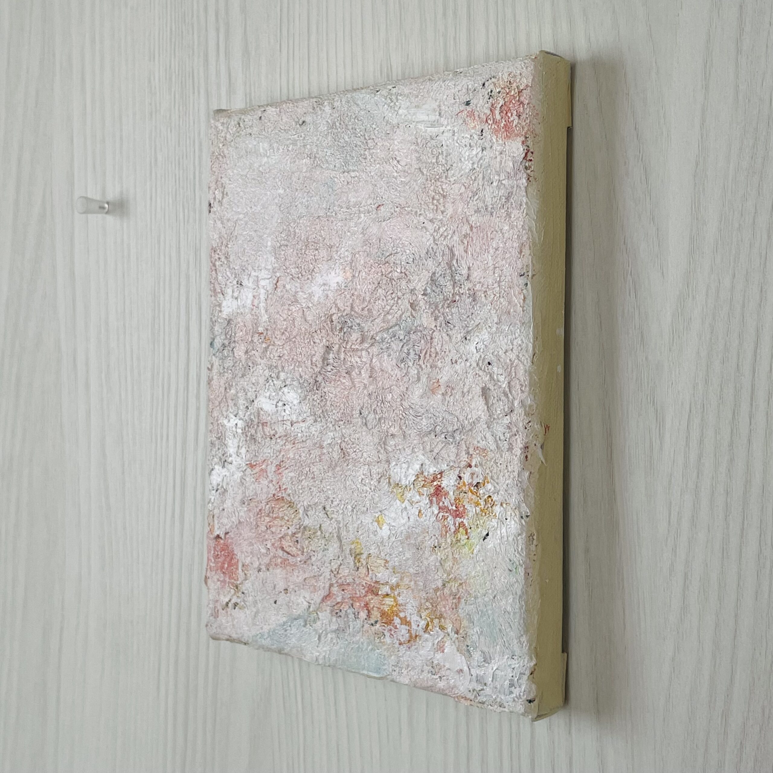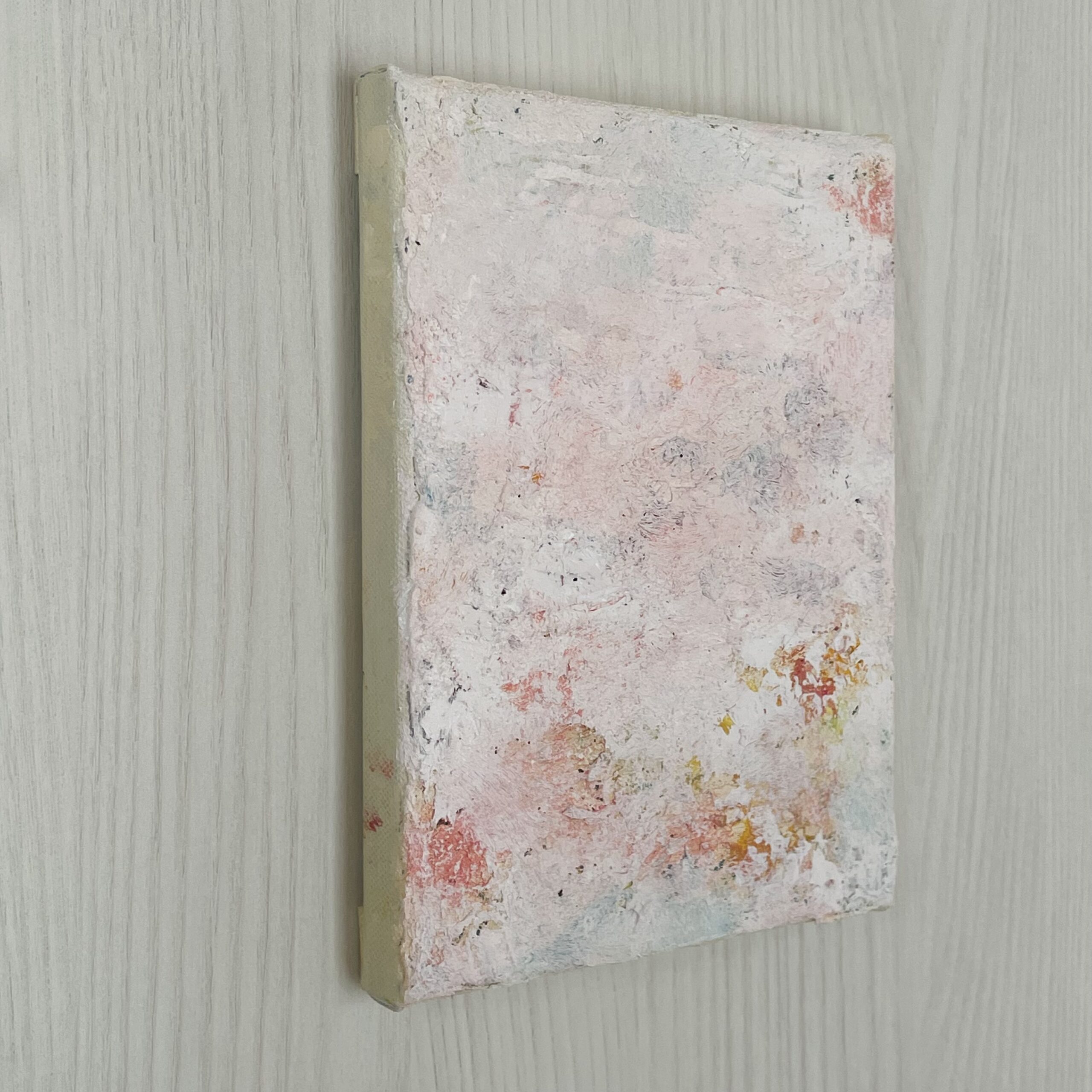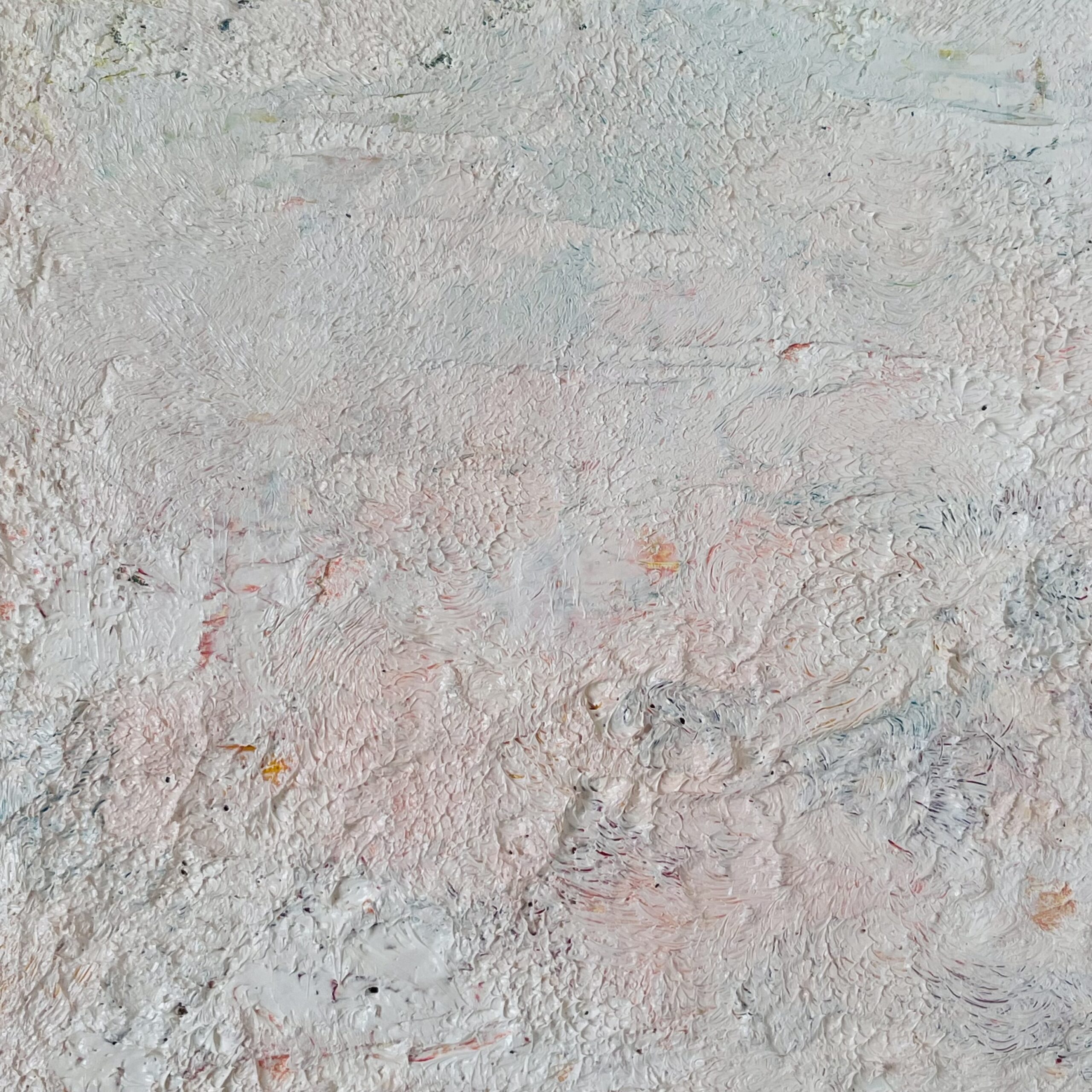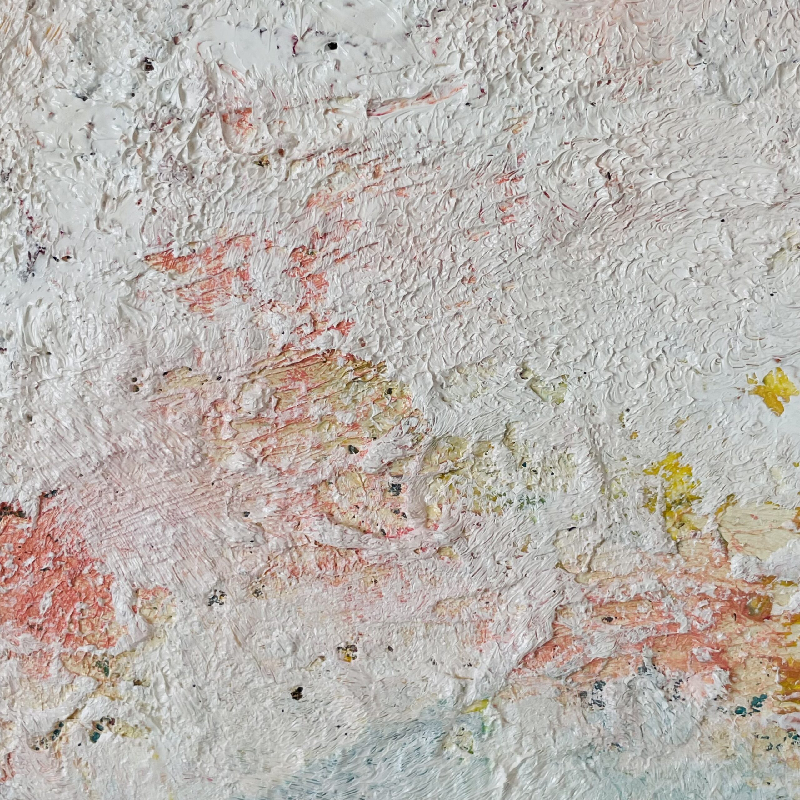 乾いた盛り上げ剤の上にさまざまな色を重ねたあと、最後にほんのりと黄色みを帯びた白で覆うように仕上げた作品です。