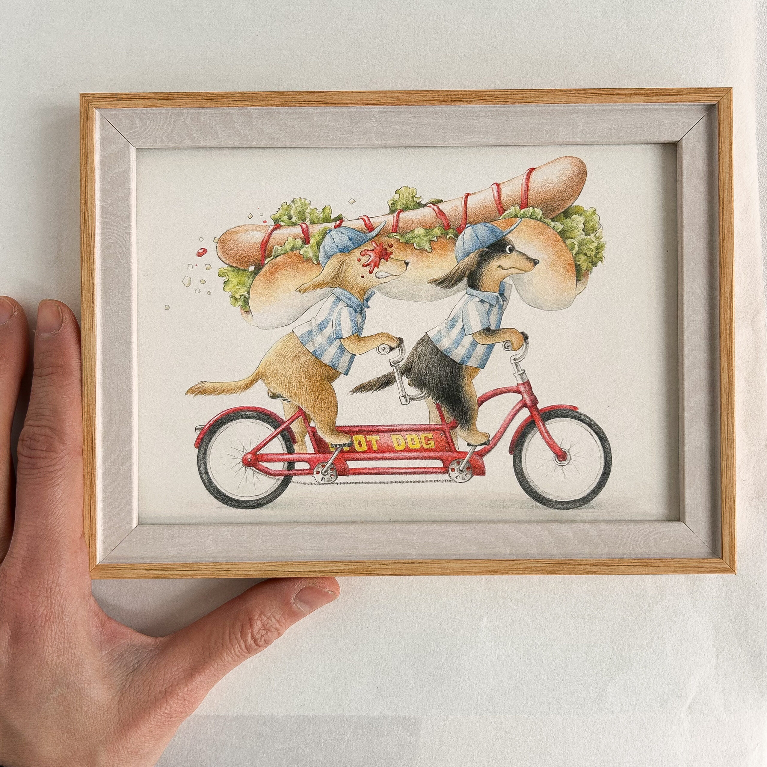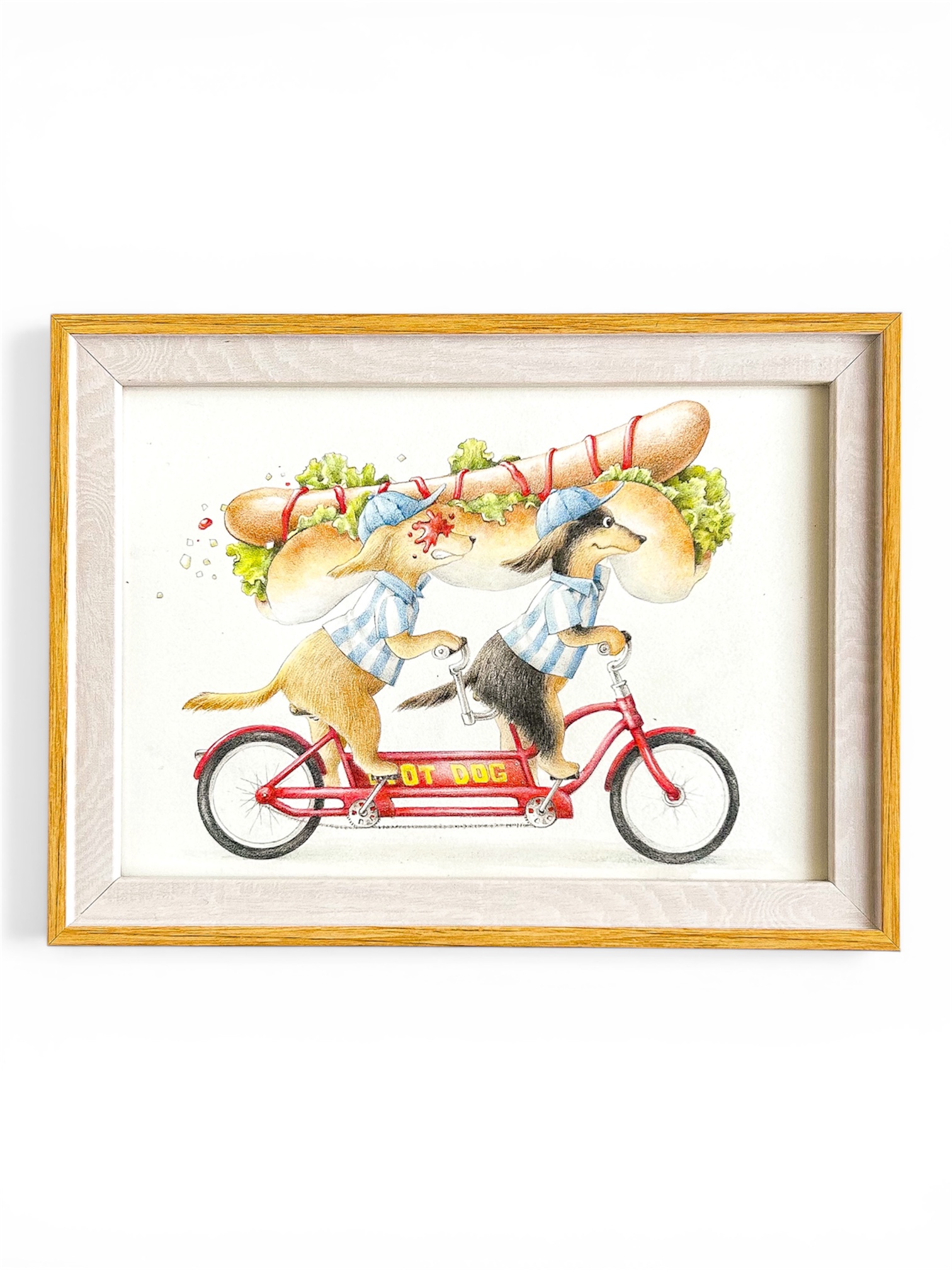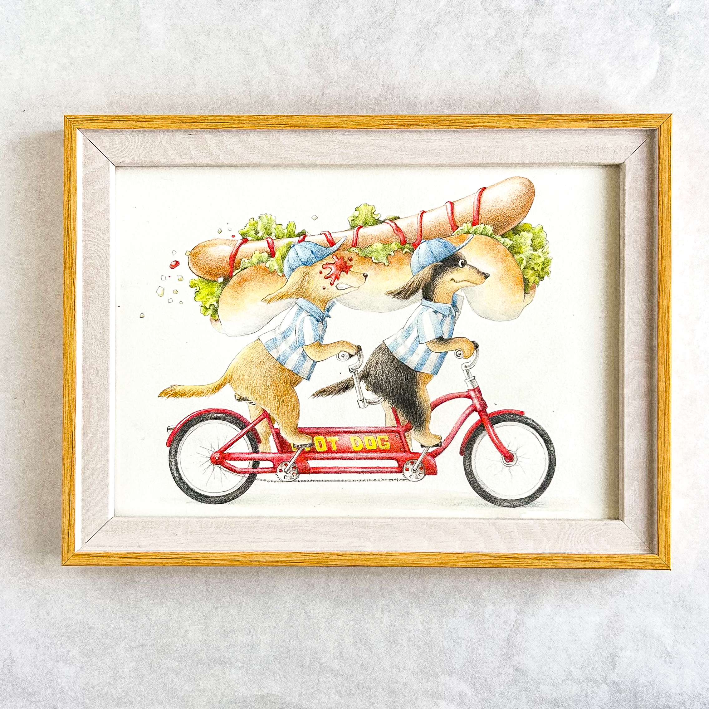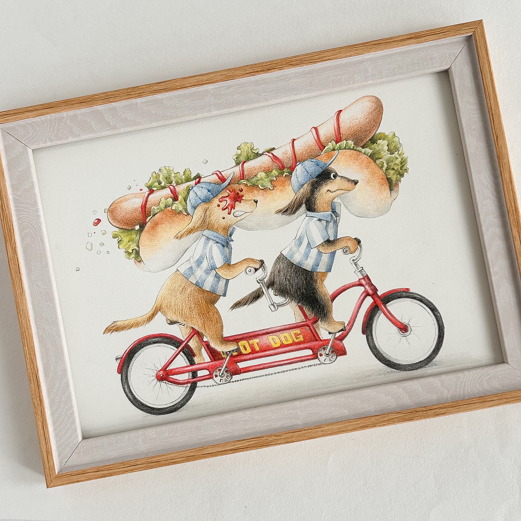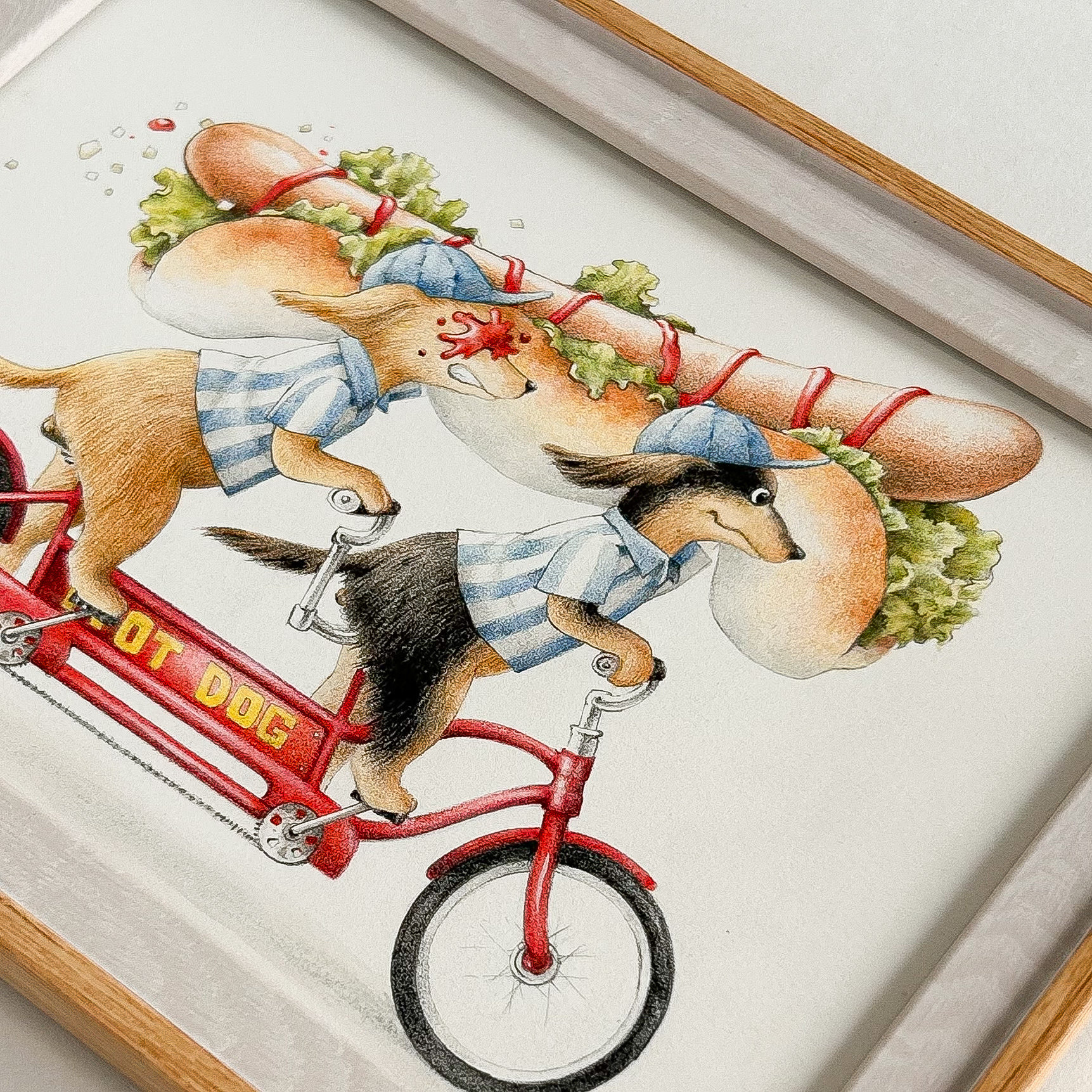 特大サイズのホットドッグを担ぎ、街を駆け抜ける二人のダックスフンド。