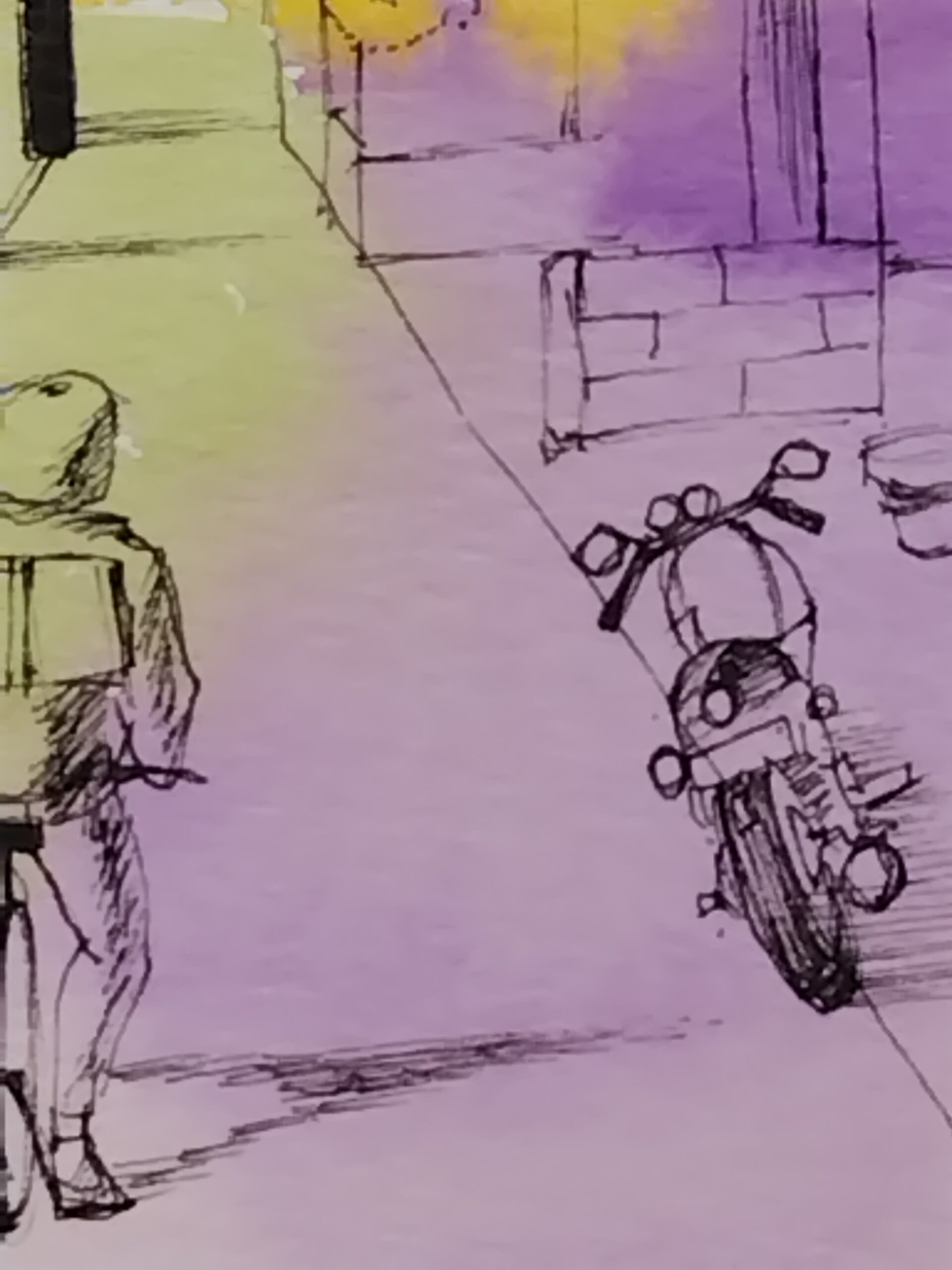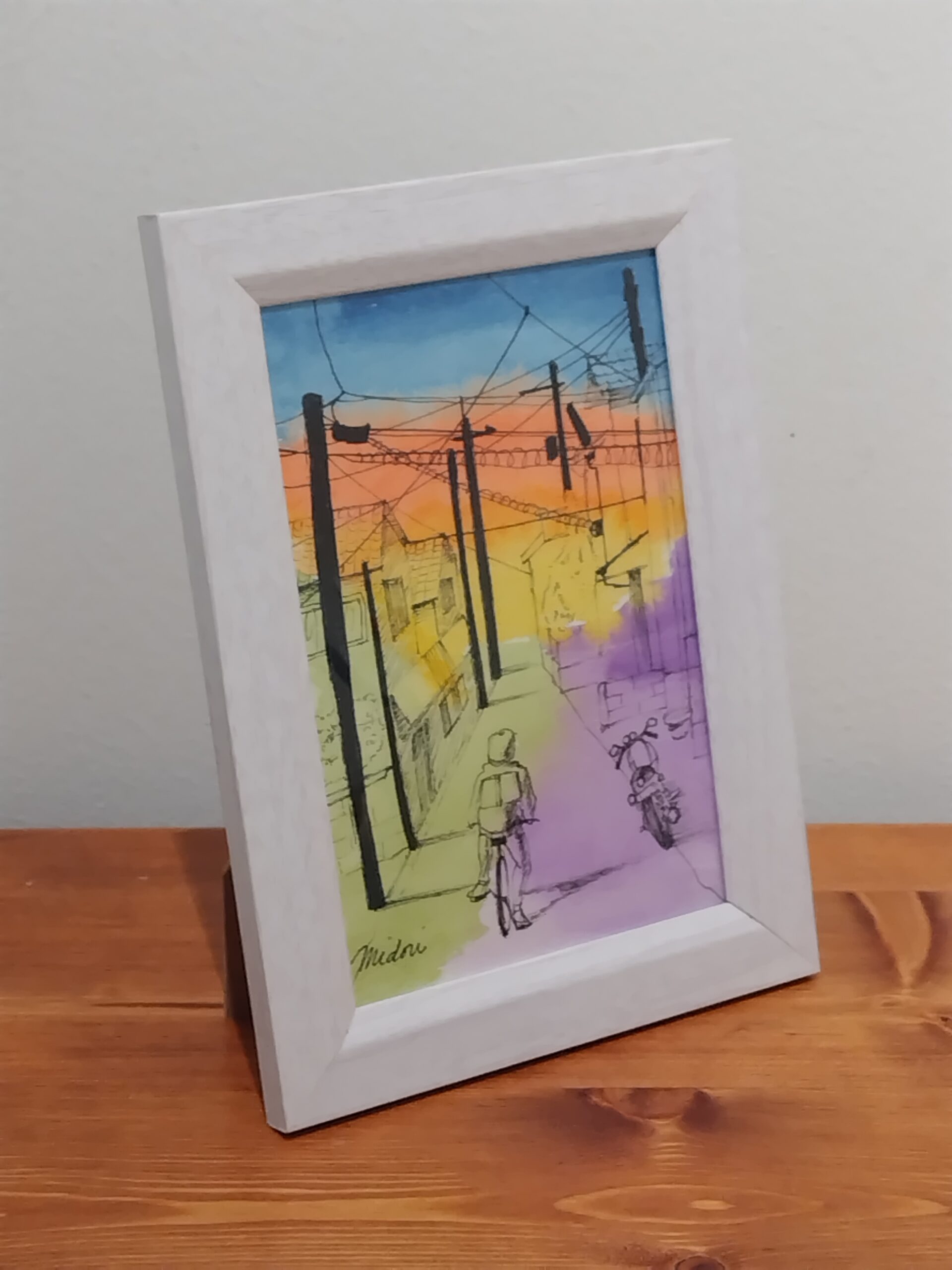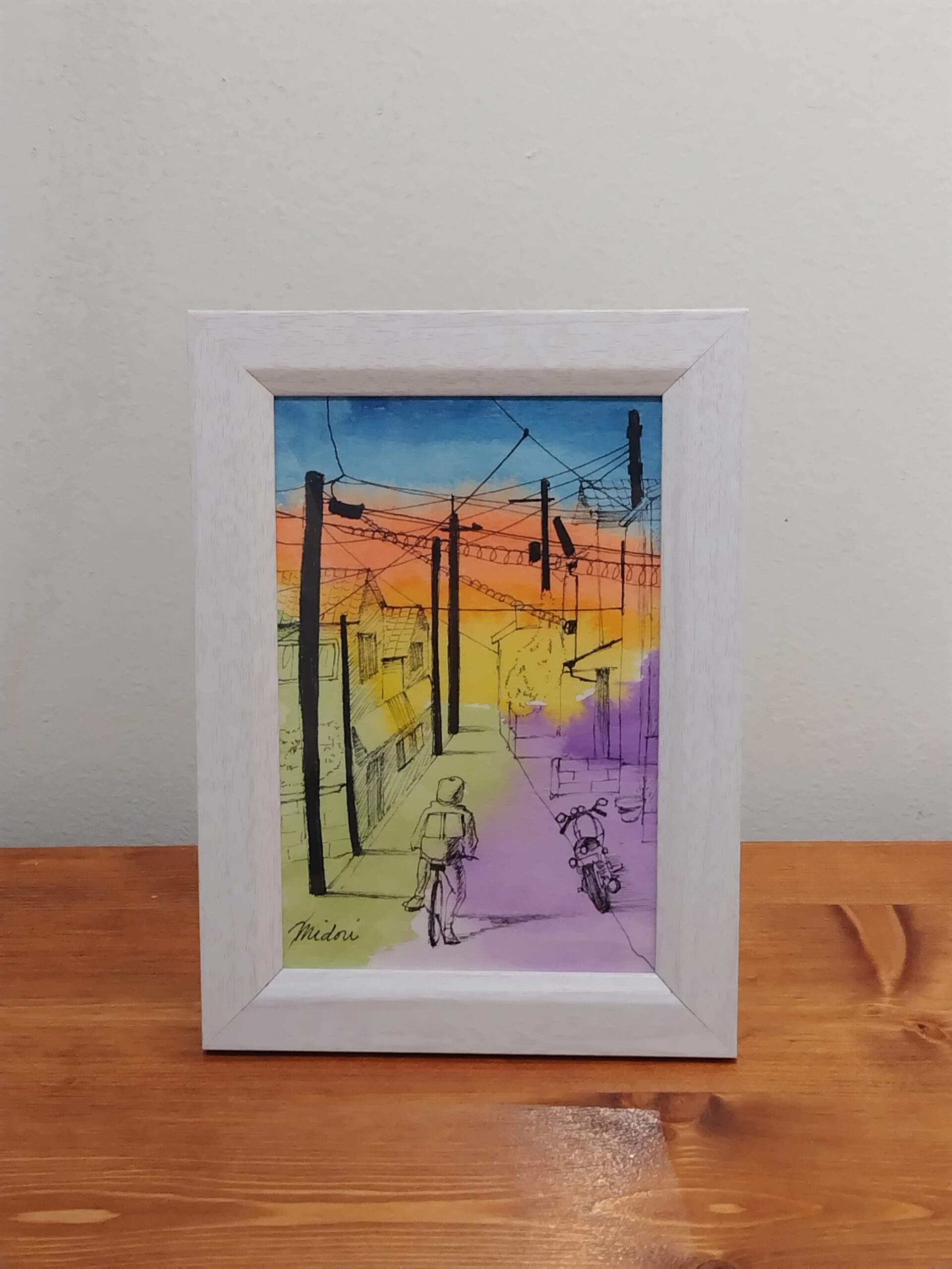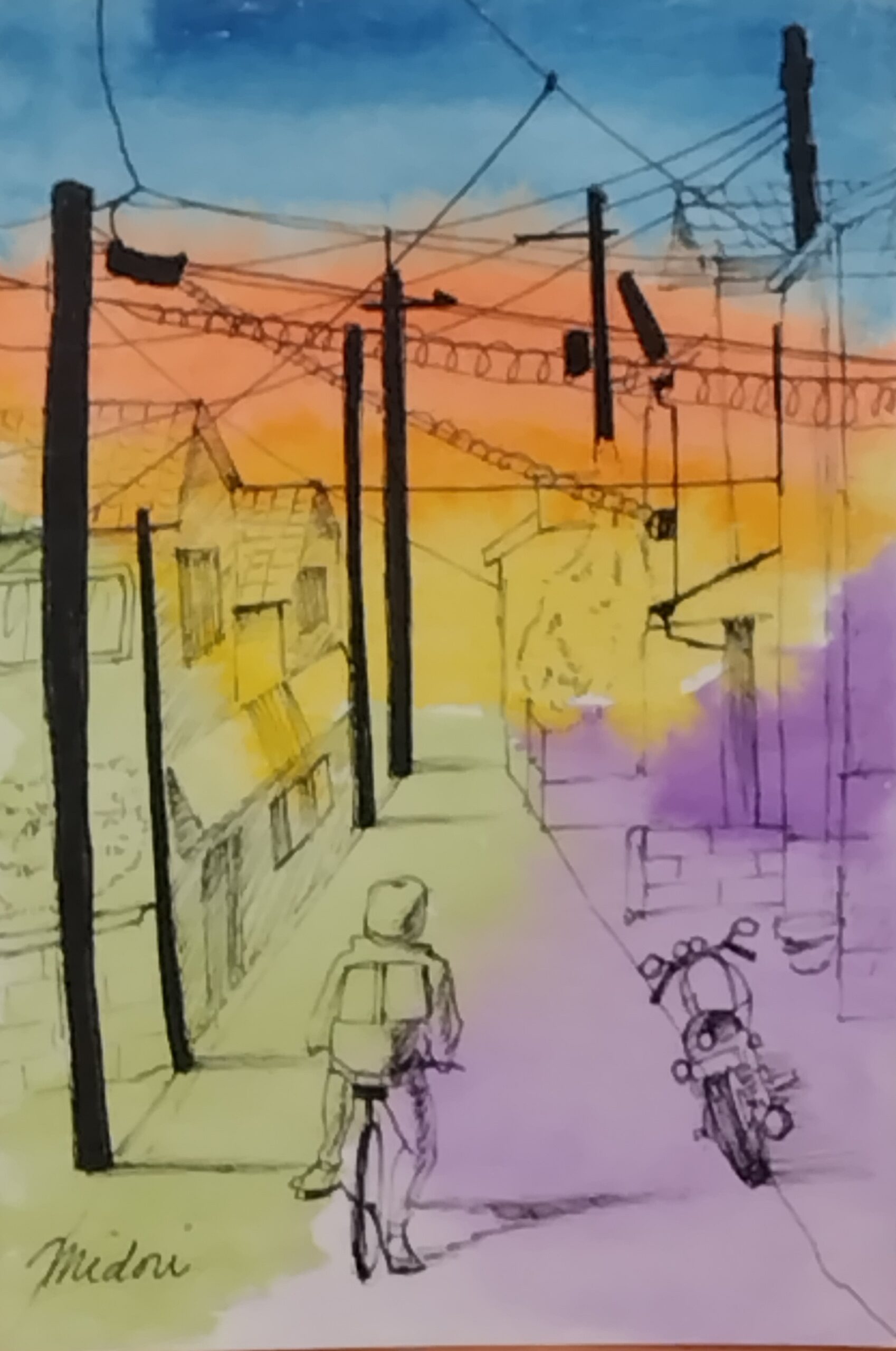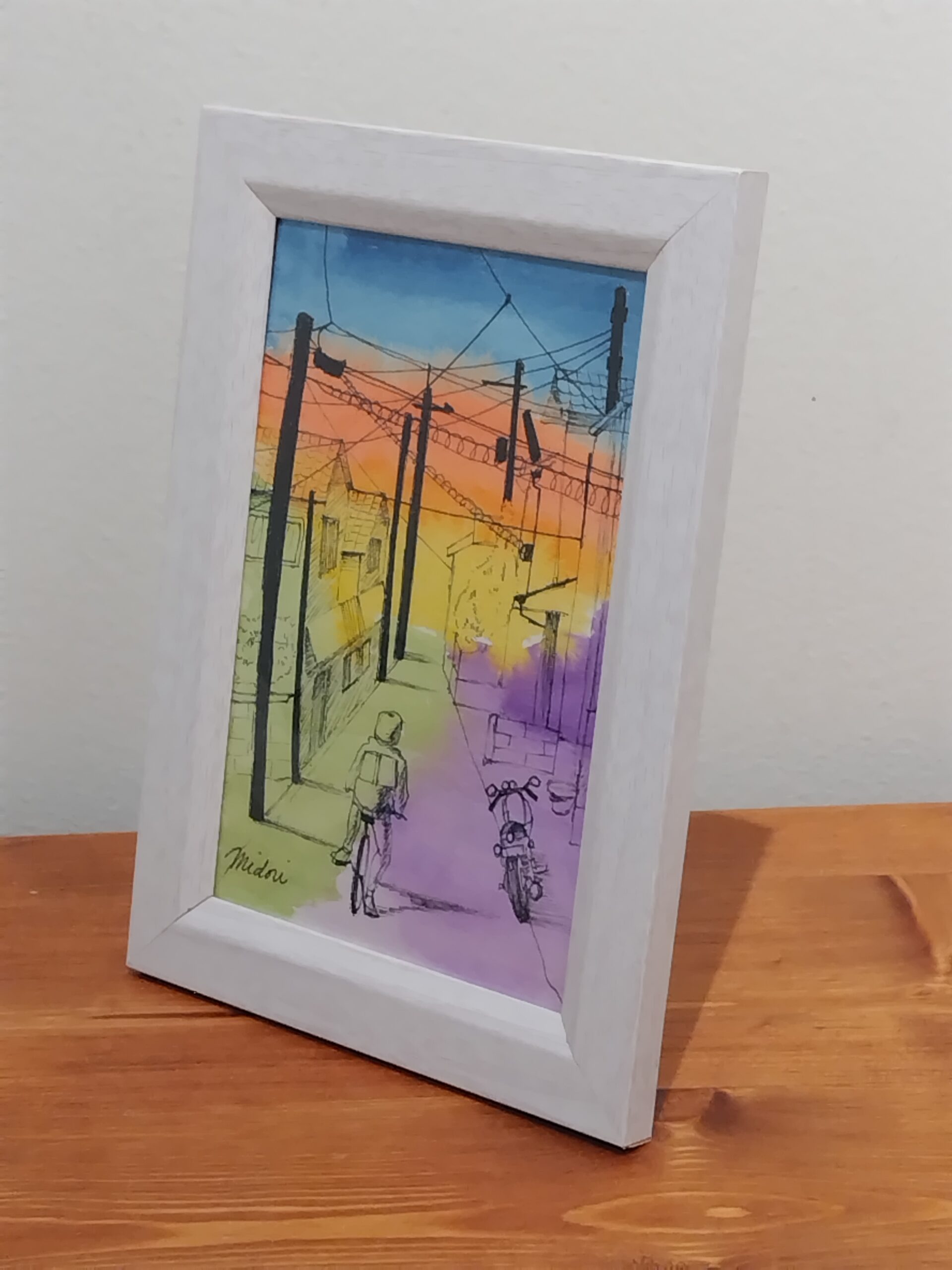 帰り道に見た夕焼けが美しく、スケッチしました。そこに街並みがあればもっと素敵かと思い、黒色のドローイングペンで描きました。水彩の鮮やかさとペンの黒色の対比をお楽しみいただければ嬉しいです。