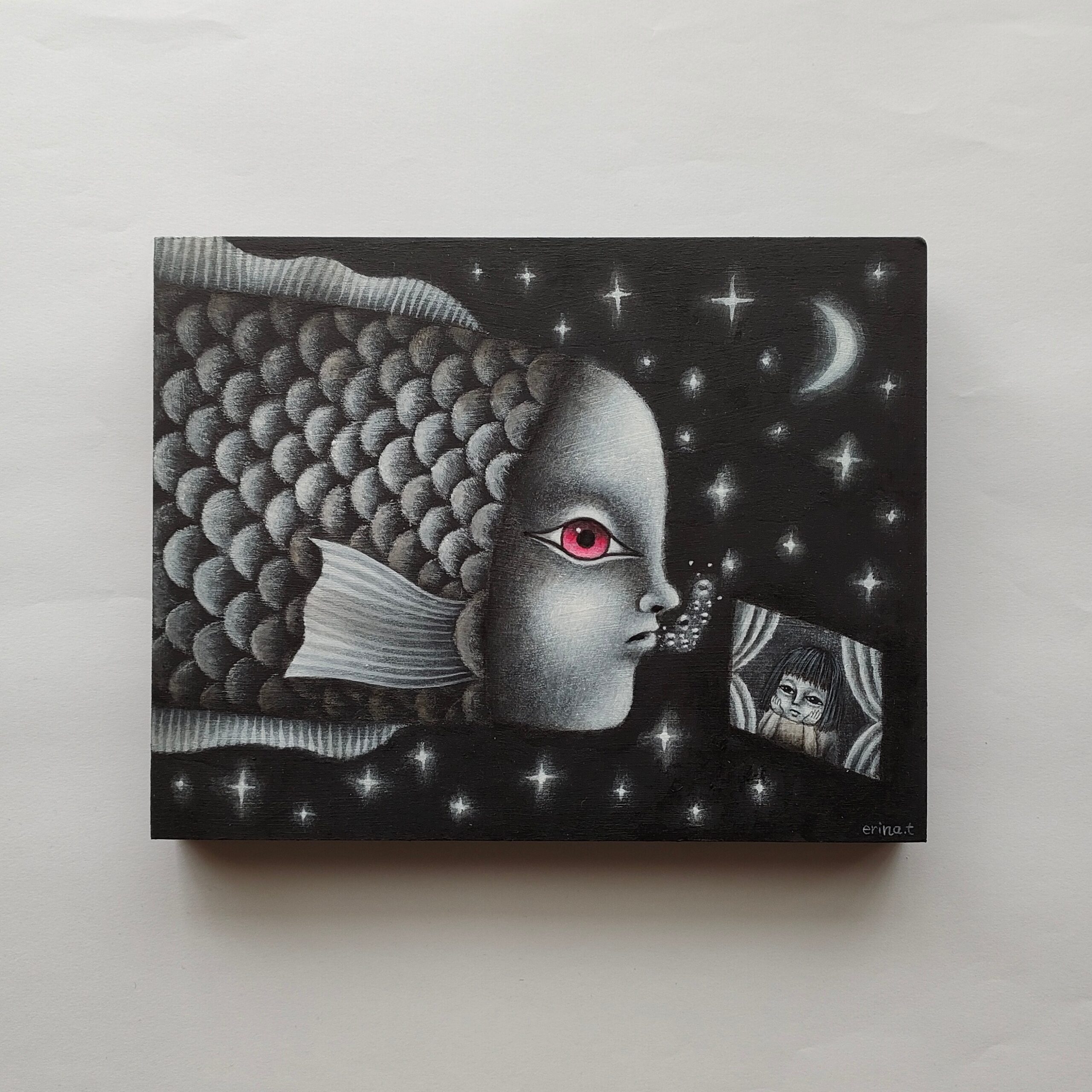 窓辺にいる小さな女の子に向かって、不思議な魚が夜空を泳いでくる場面を描きました。