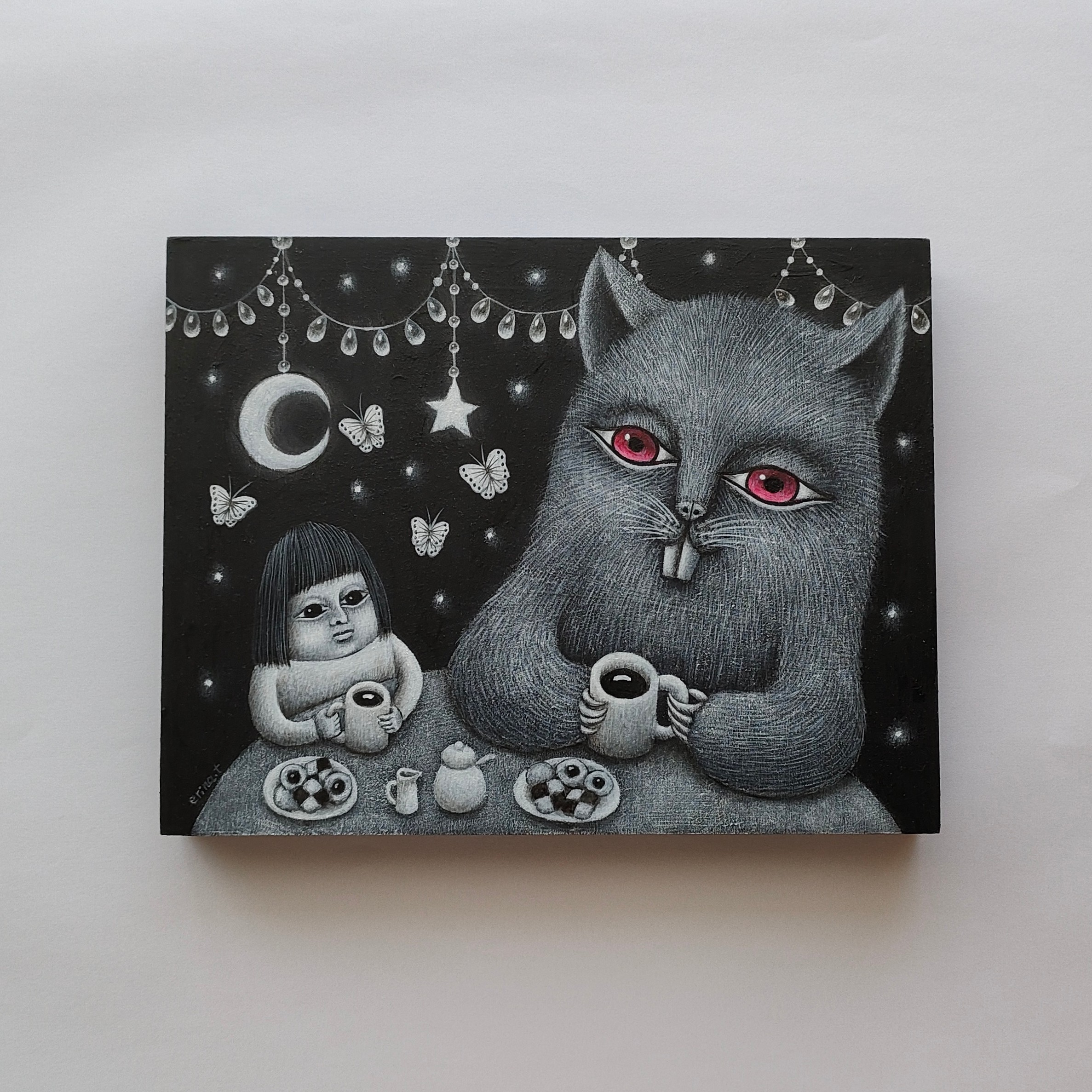 不思議な生き物と小さな女の子が、夜のカフェで一緒にコーヒーを飲んでいる場面を描きました。