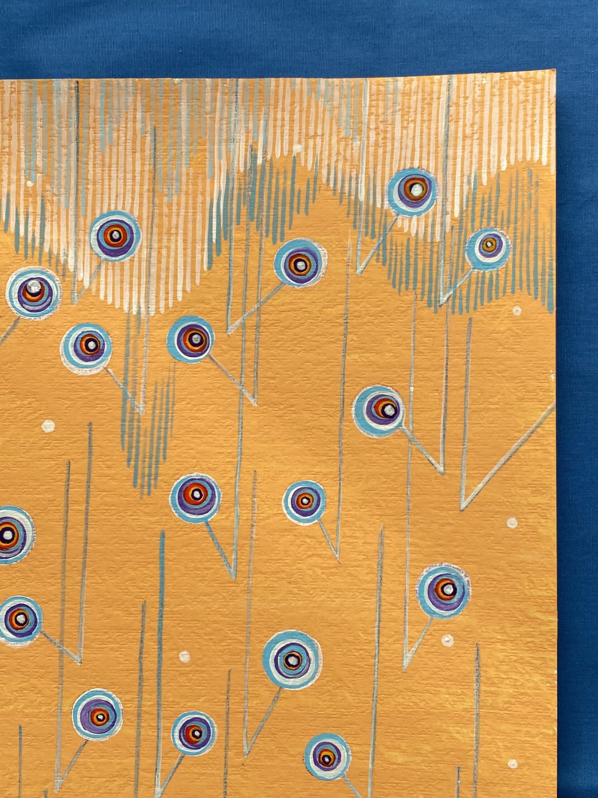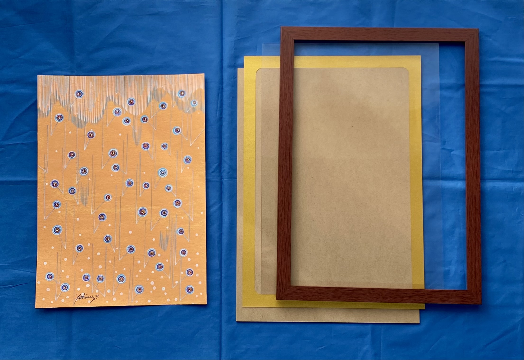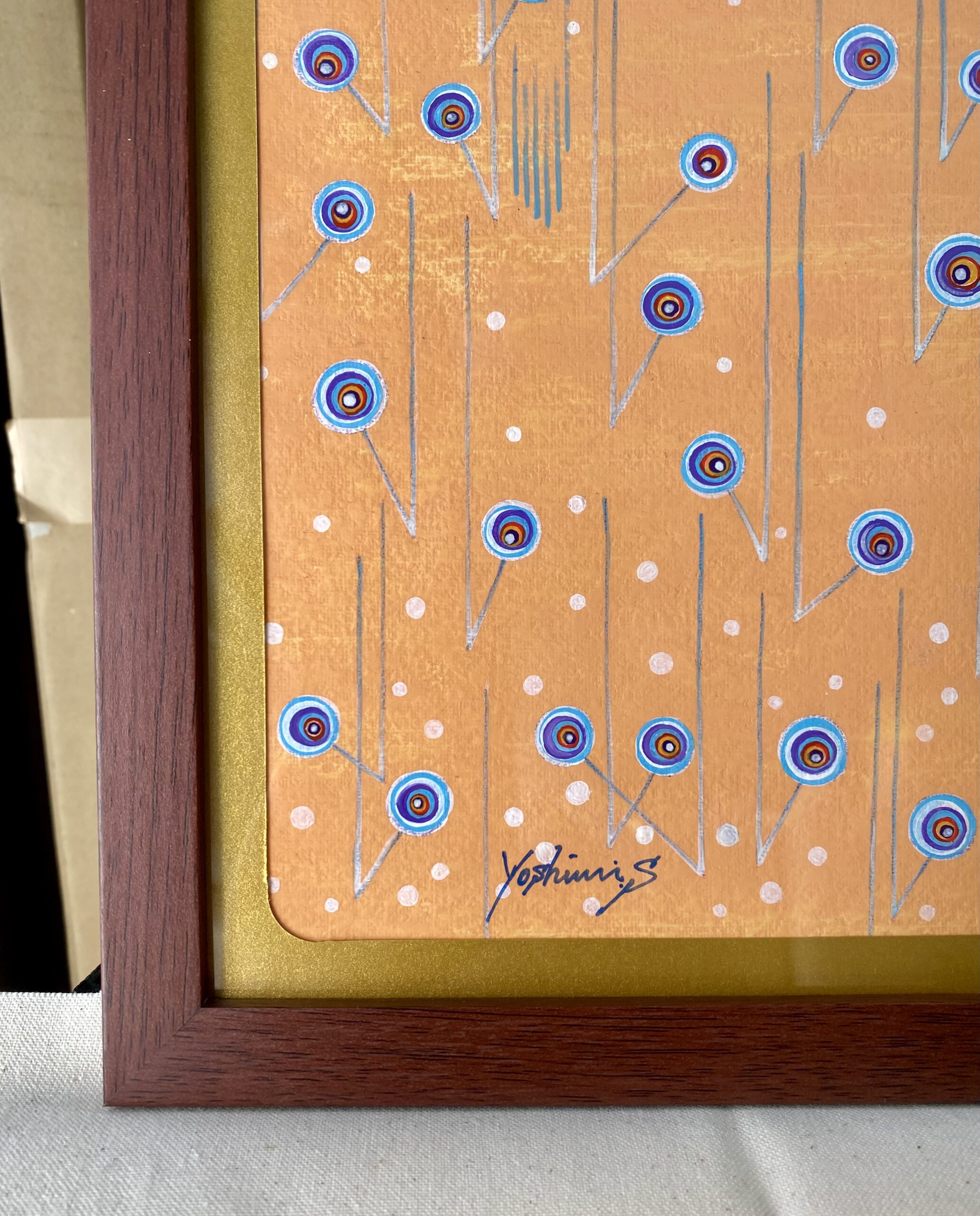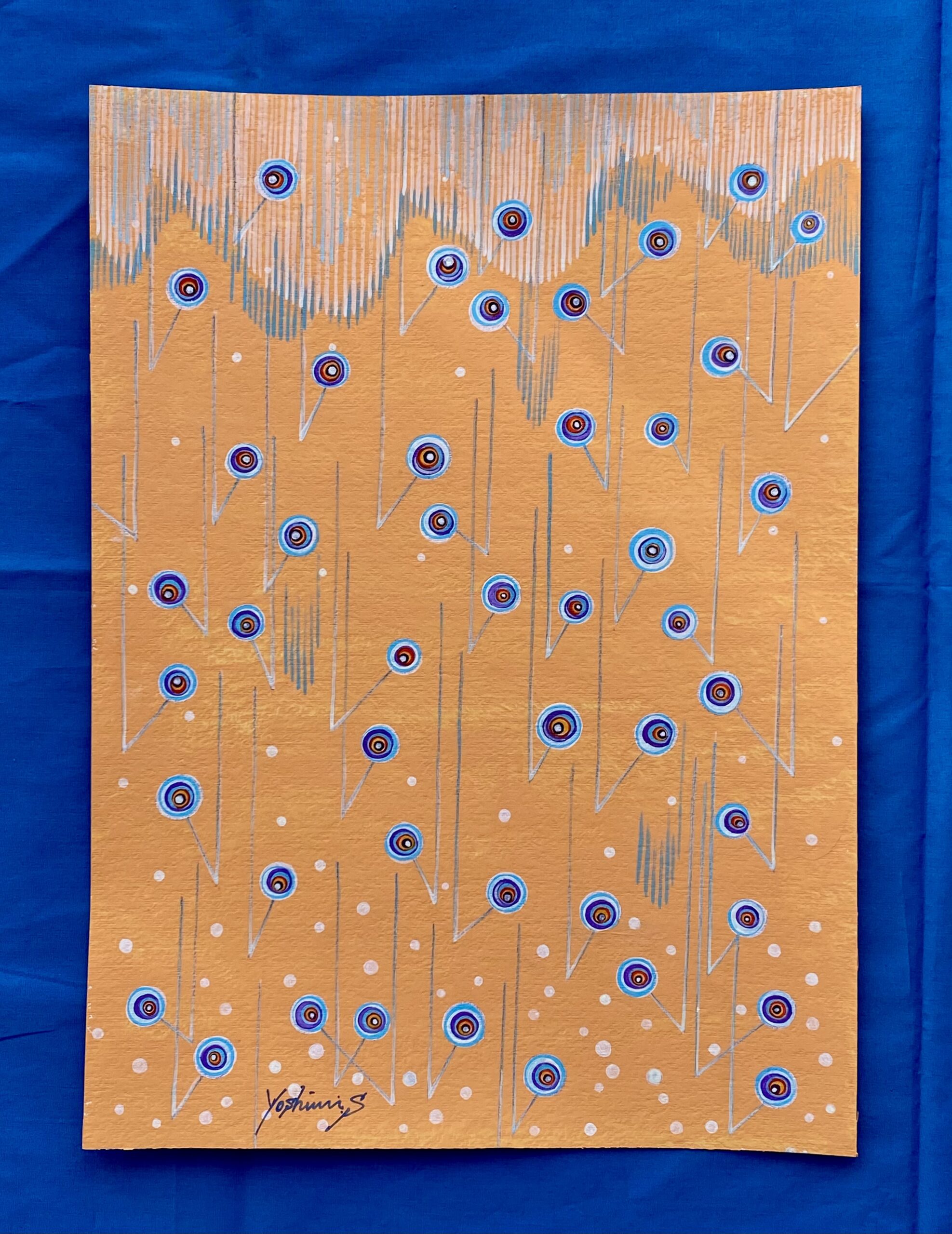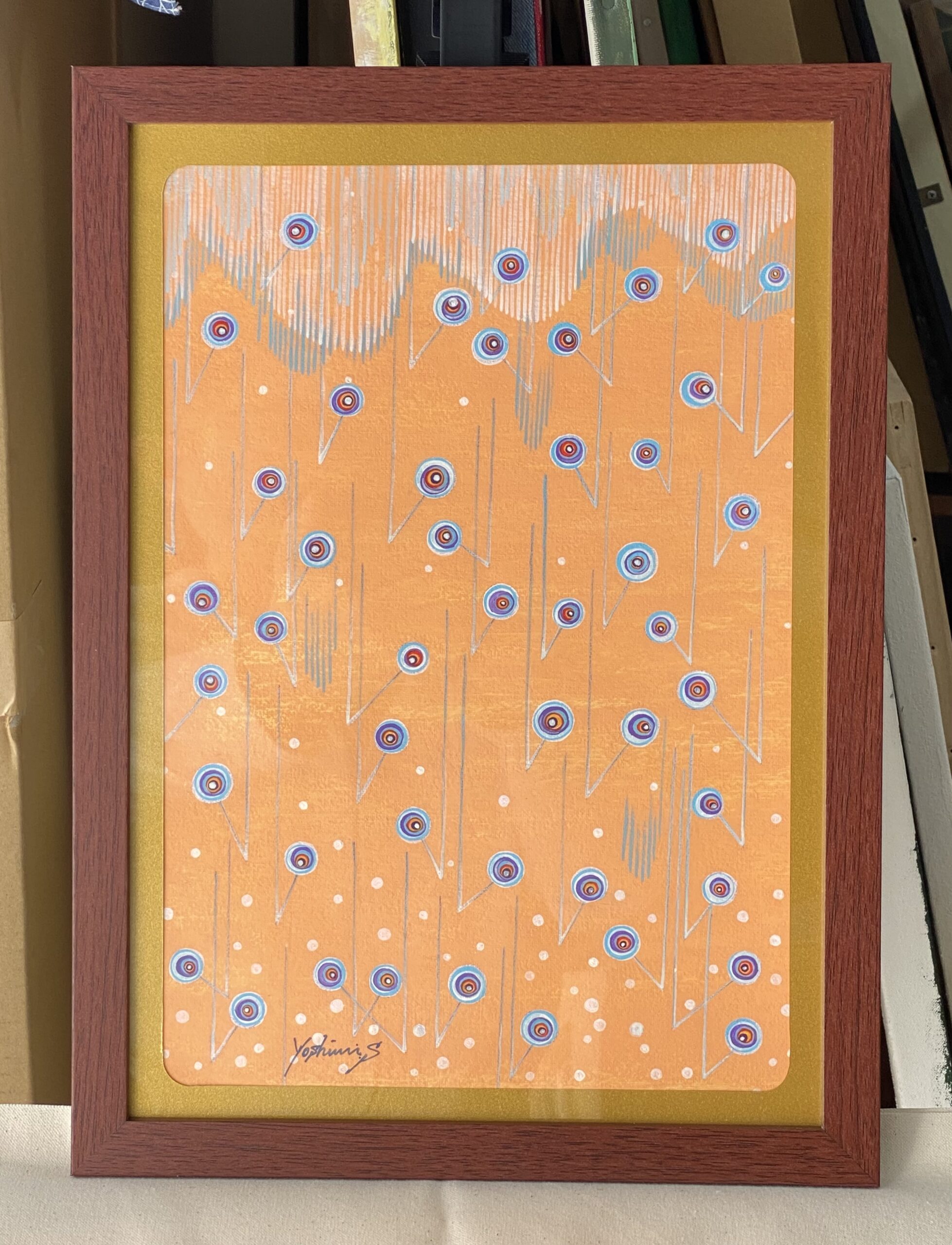 南国のスコールをイメージした作品。突然降り出す雨は大粒で、楽しく弾むような音がする。キャンバスペーパーに描いています。画像の額装でのお届けになります。