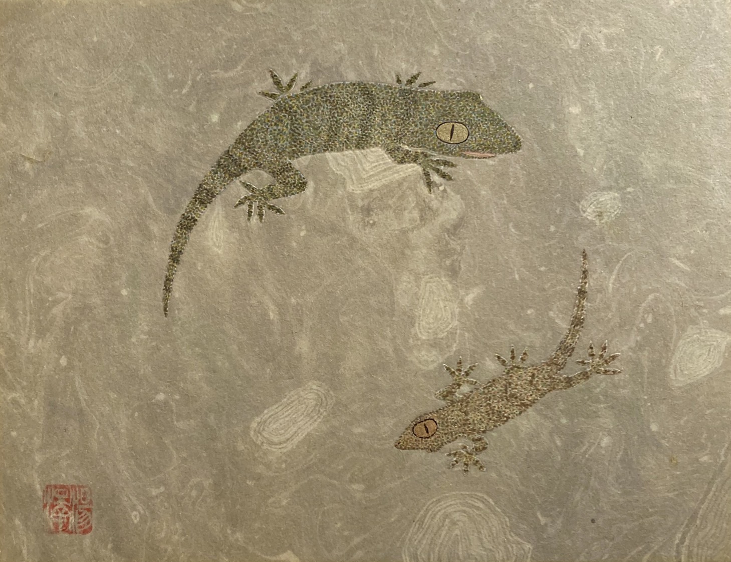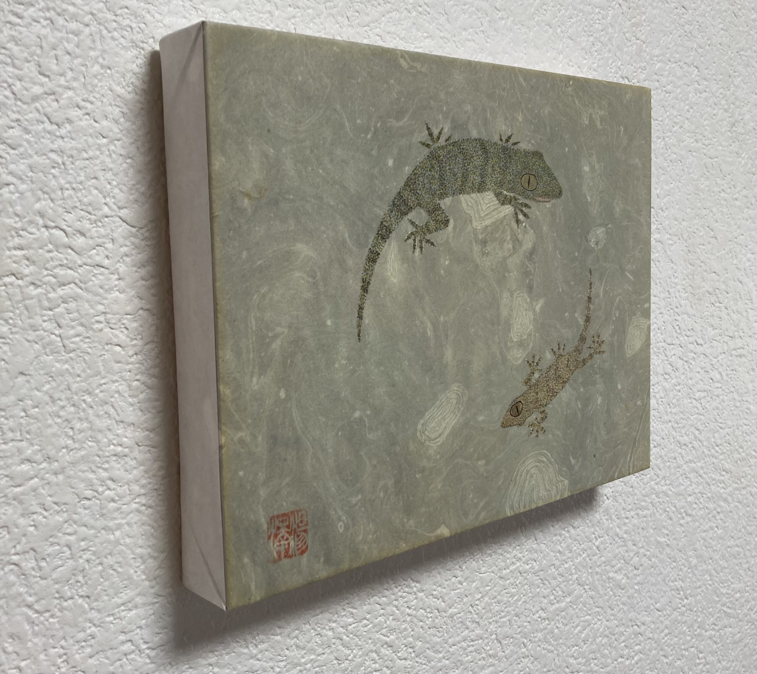 2匹のヤモリがぐるりと円を描いてるイメージで描きました。
