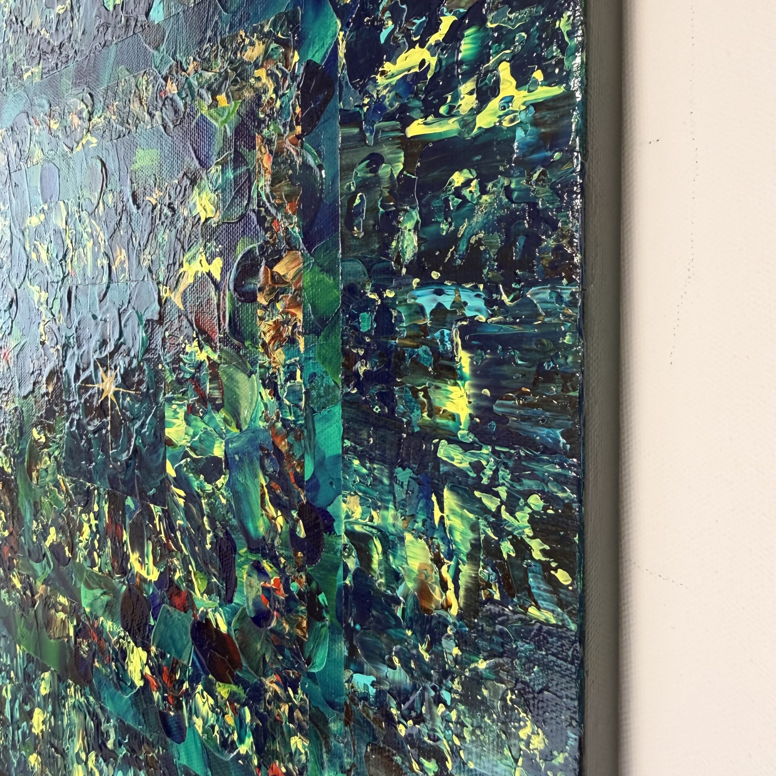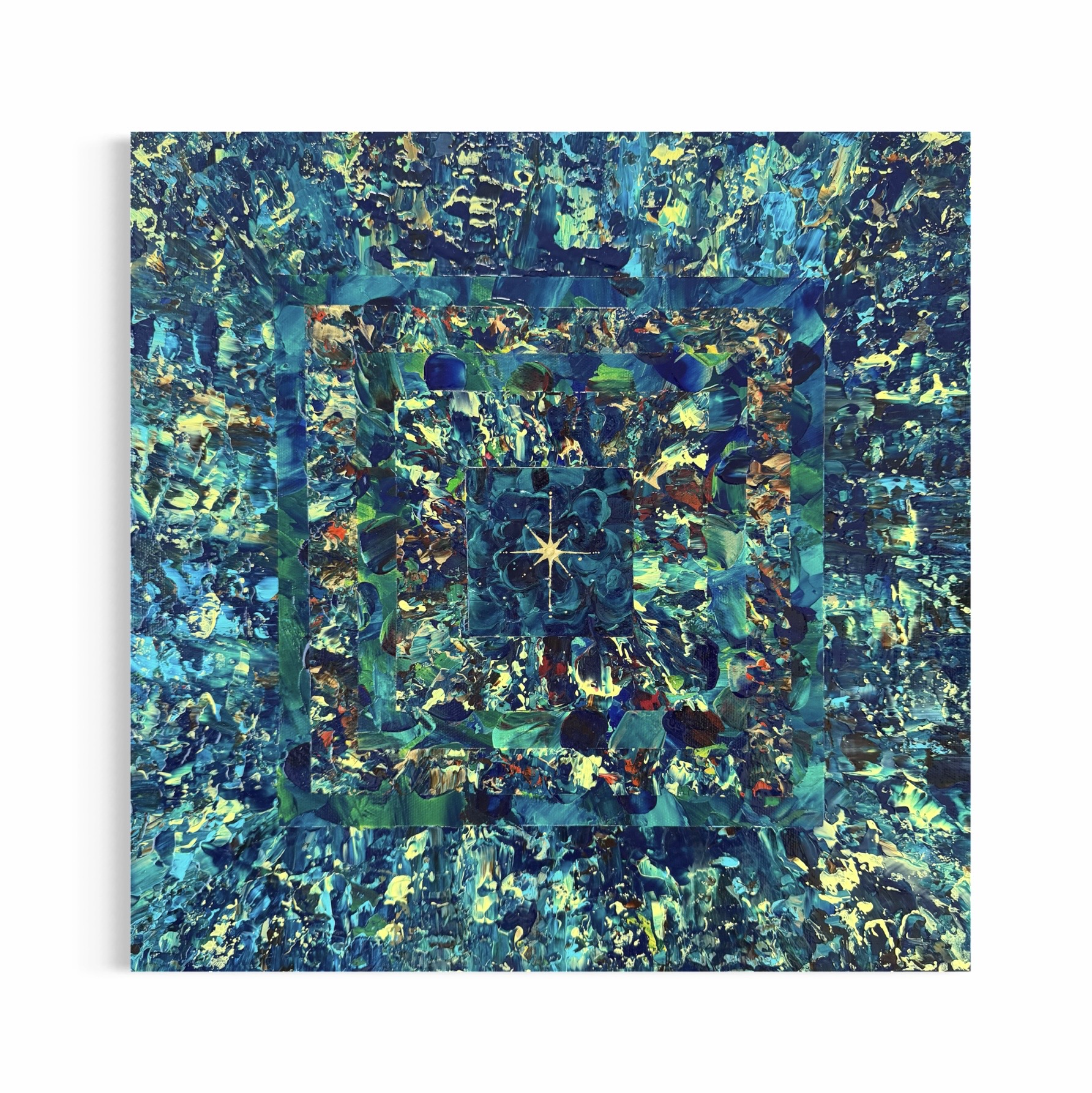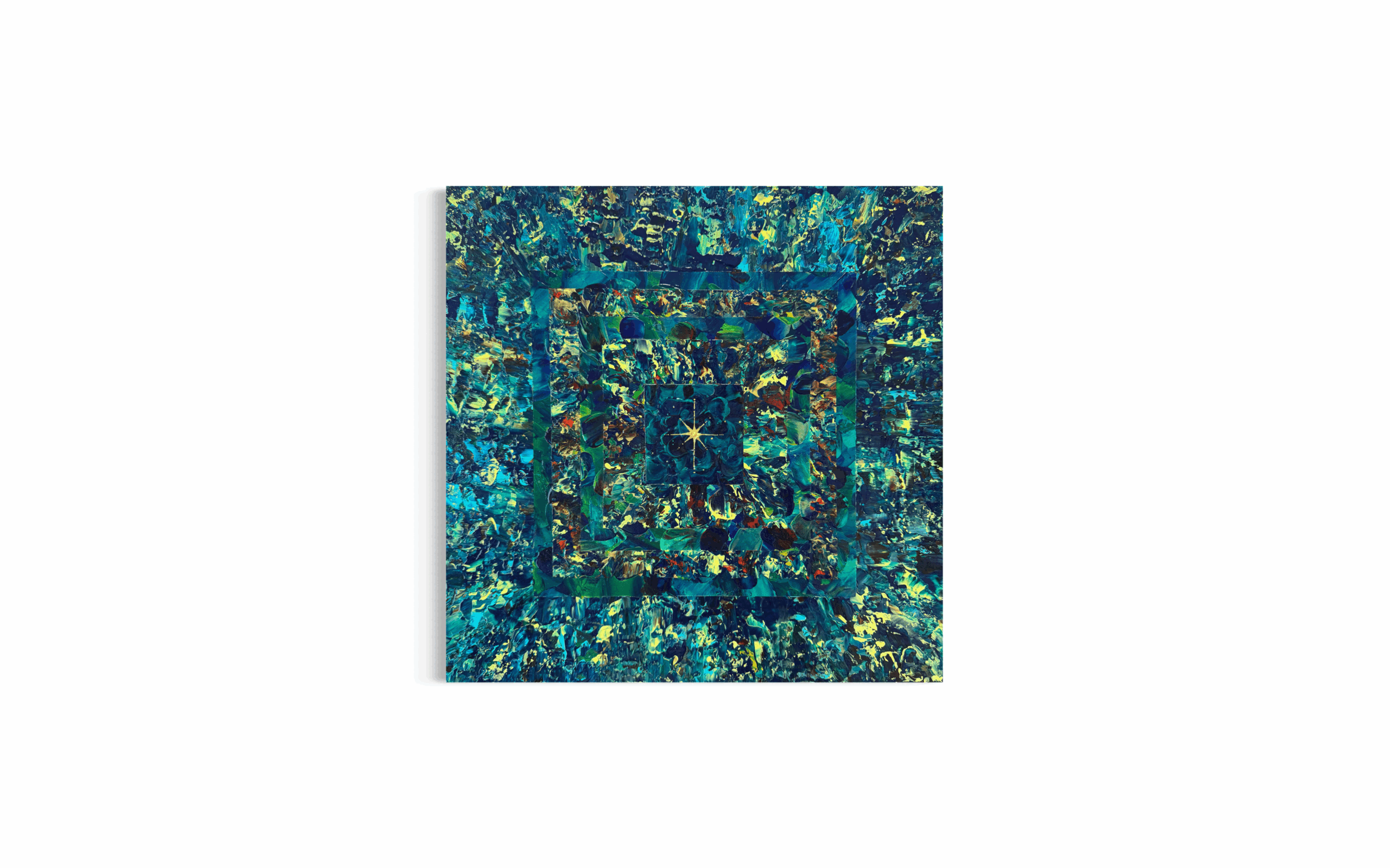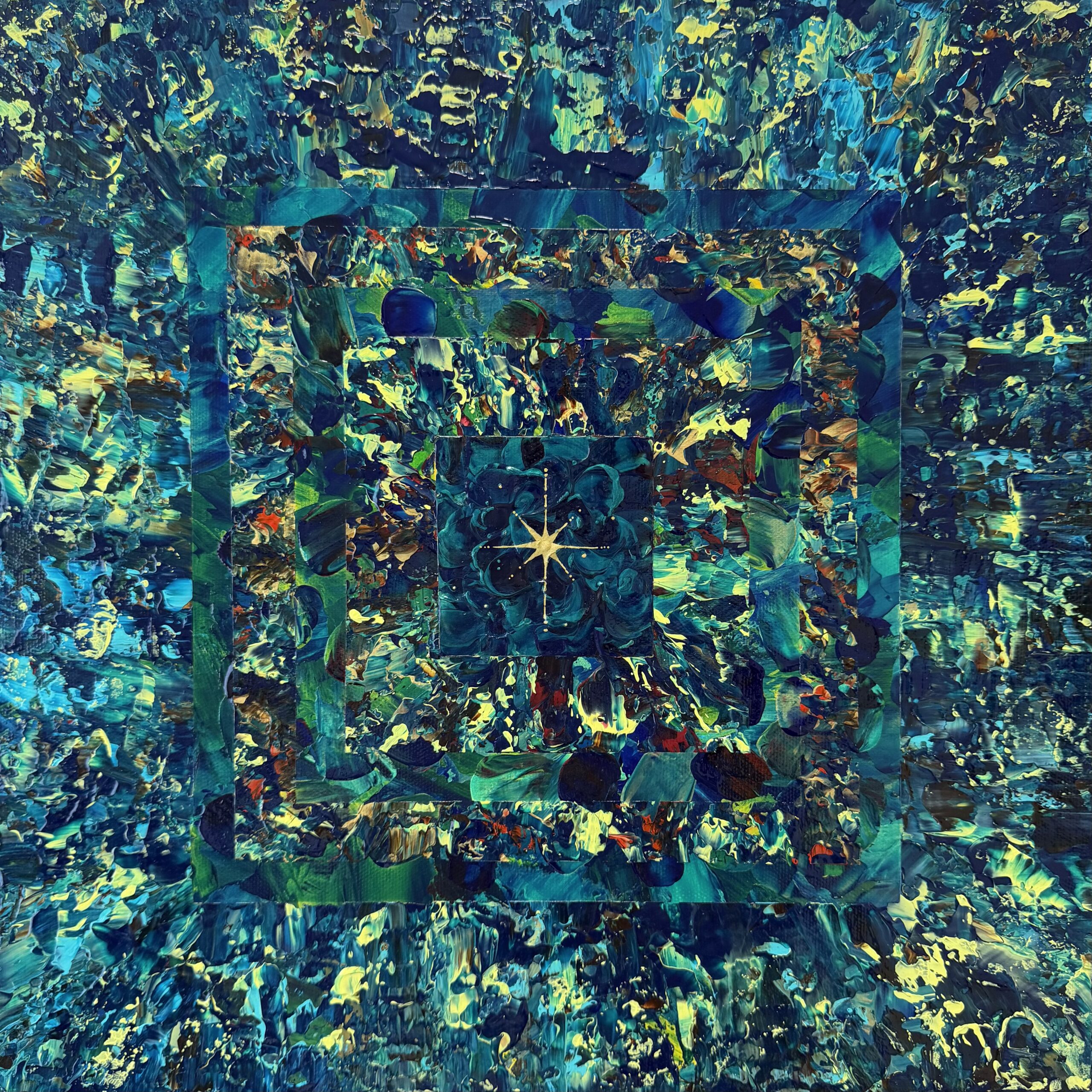 たくさんの色を幾層にも重ねたくなり、目的地を決めずに描き始めました。色を重ね描くうちに、ジャングルのピラミッドのように見え、命の源である水の回廊を通しました。そして、最後に命の光をひとつ灯しました。