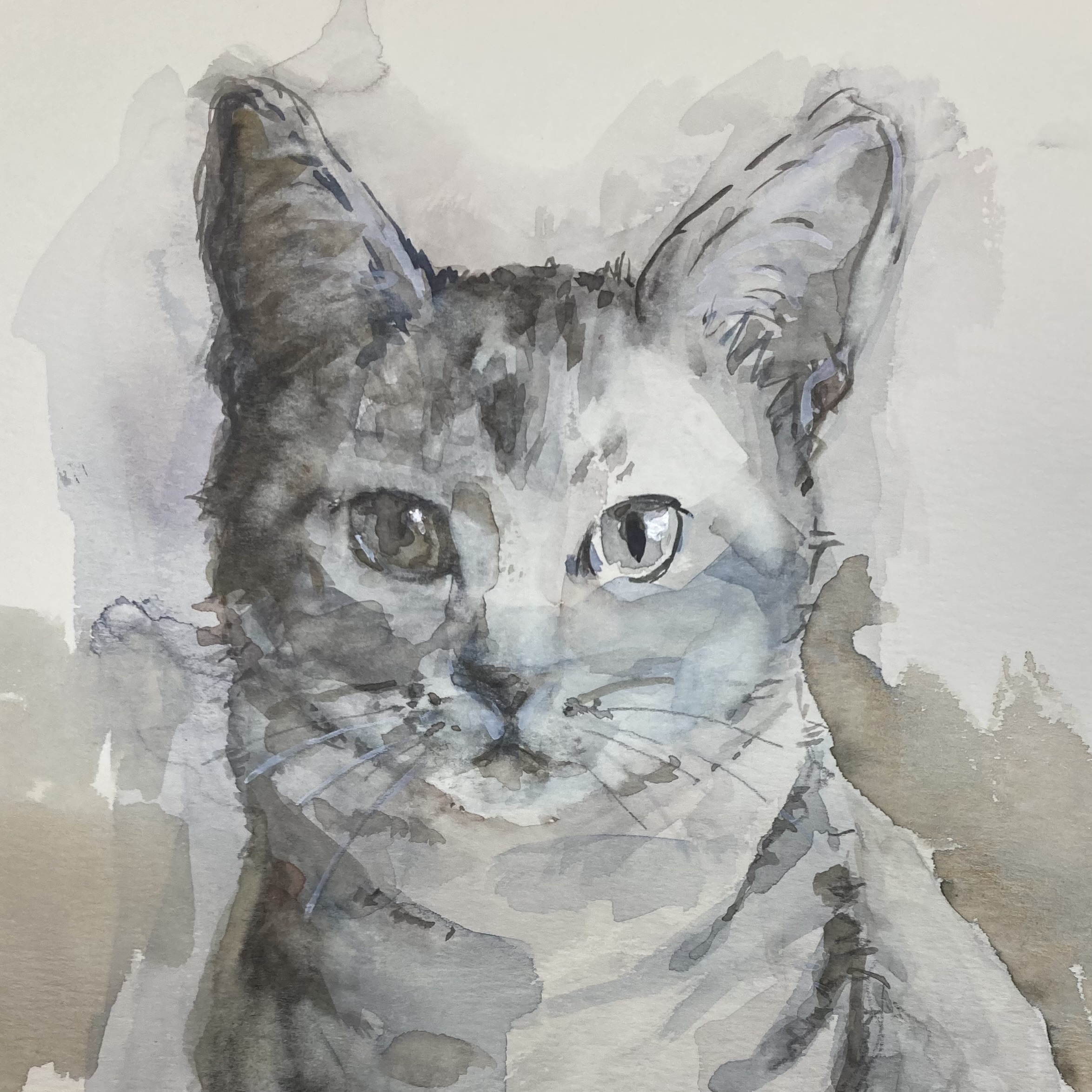 柔らかな空気感と、猫の繊細な眼差しを丁寧に描き出した水彩画です。