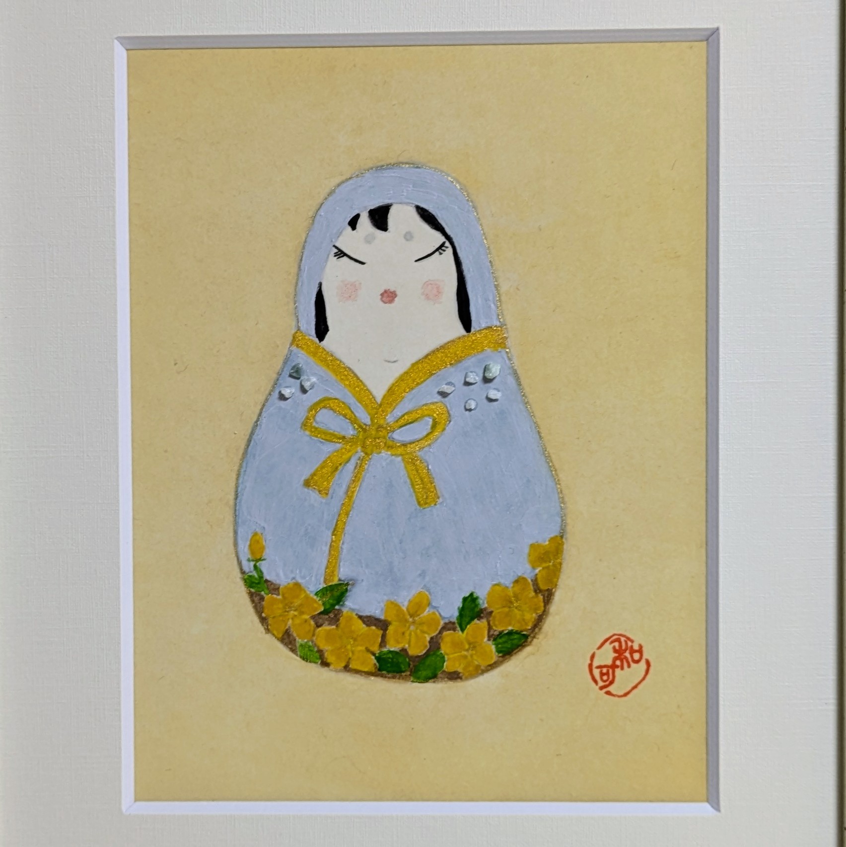 🌸縁起物の花だるまをソーダライトを使って描きました。胸元には5月の誕生石 翡翠(ヒスイ)の小さなさざれ石を飾り、裾に山吹の花を描きました。