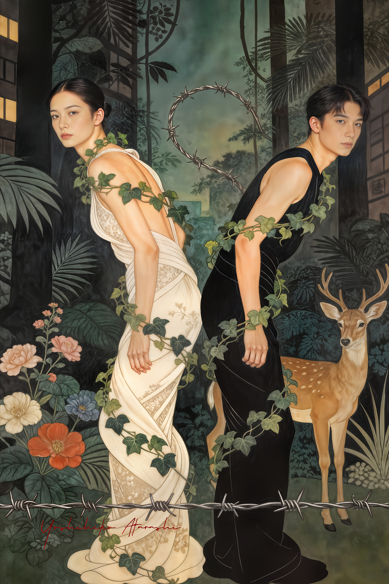 これらの作品は、自然と人、そして都市の気配が静かに重なり合う瞬間を描いています。蛇や植物、鹿といった象徴的なモチーフは、生命の循 環や内なる欲望、再生のイメージとして配置しました。曲線を強調した人体表現と装飾的な画面構成は、日本画や装飾絵画の影響を意識しつ つ、現代的な感性で再構成しています。見る人が物語を読み取るのではなく、時間や感情の揺らぎを画面の中で漂わせることを大切にしまし た。