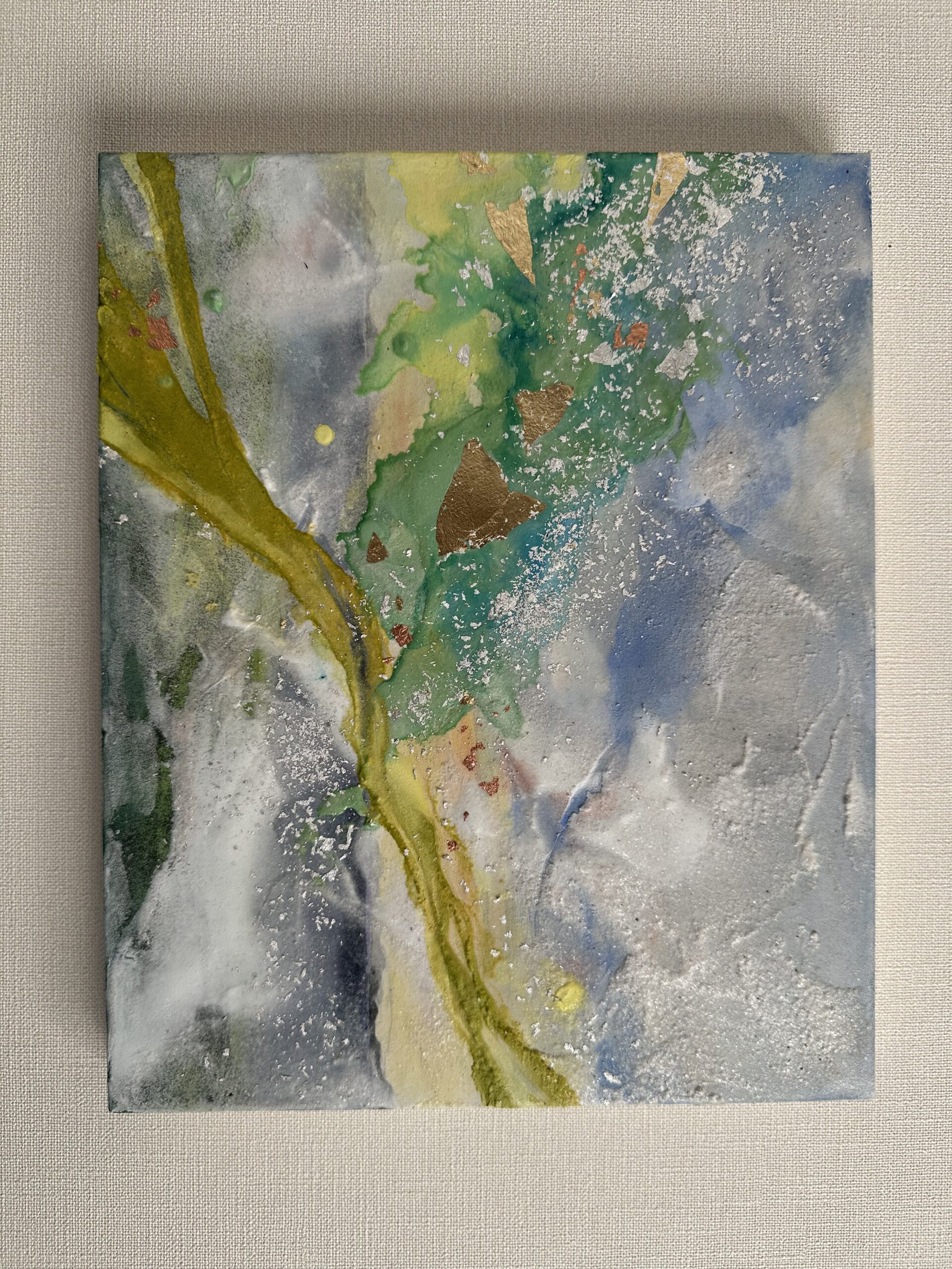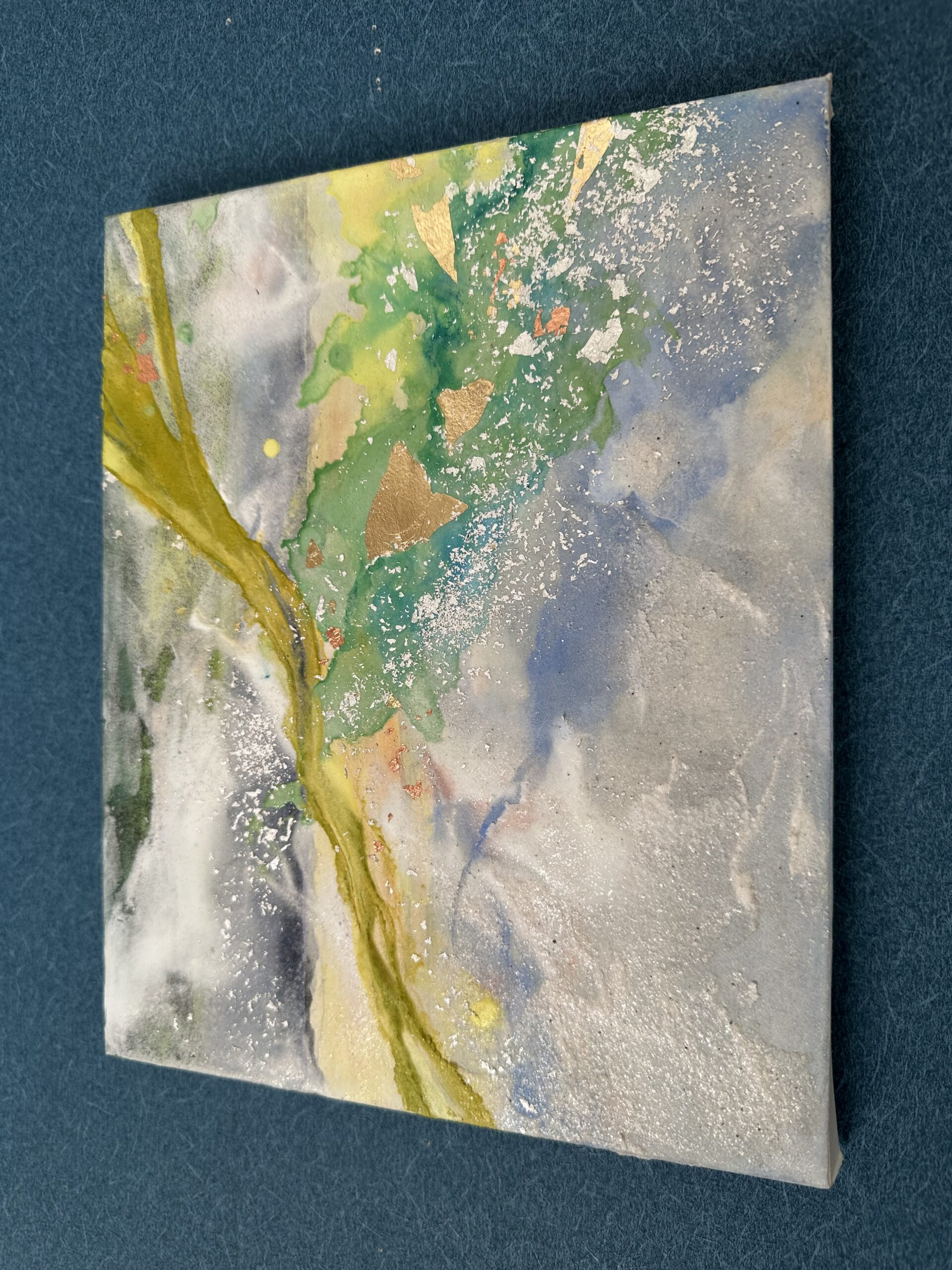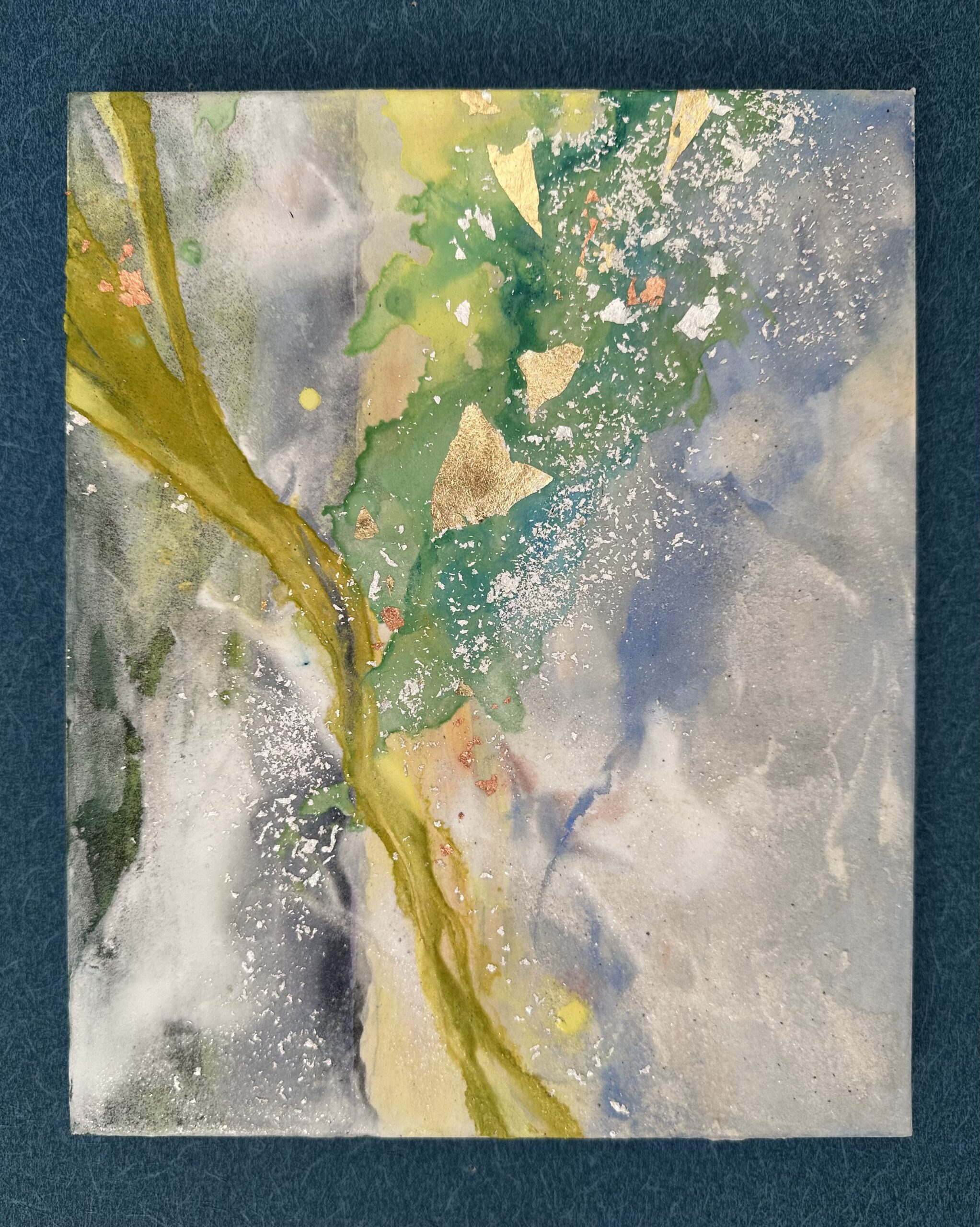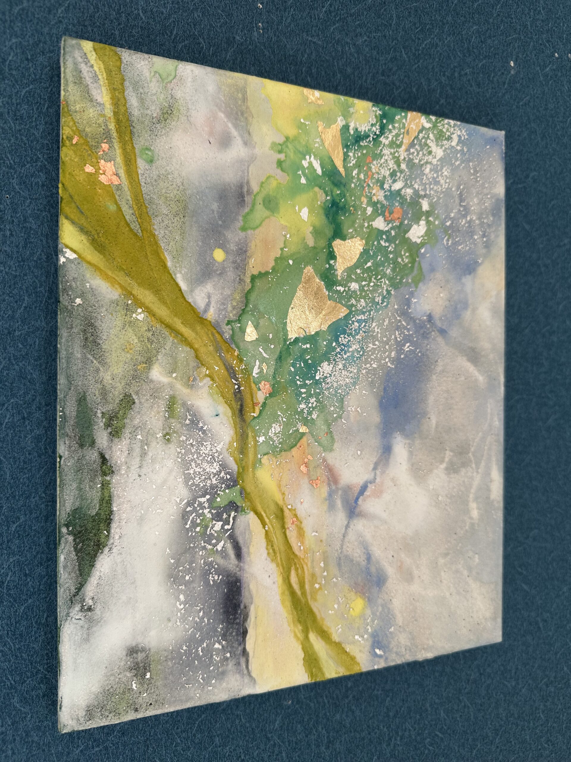箔を使用した作品は、光のあたり方によって輝き方が変わります。日中の窓から入る自然光、夜の照明の光など、光の違いにより表情がかなり変わります。また、箔の変色を抑えるためのコーティングをしておりますが、時間経過とともに少しずつ色味が変化します。その変化もお楽しみいただけますと幸いです。