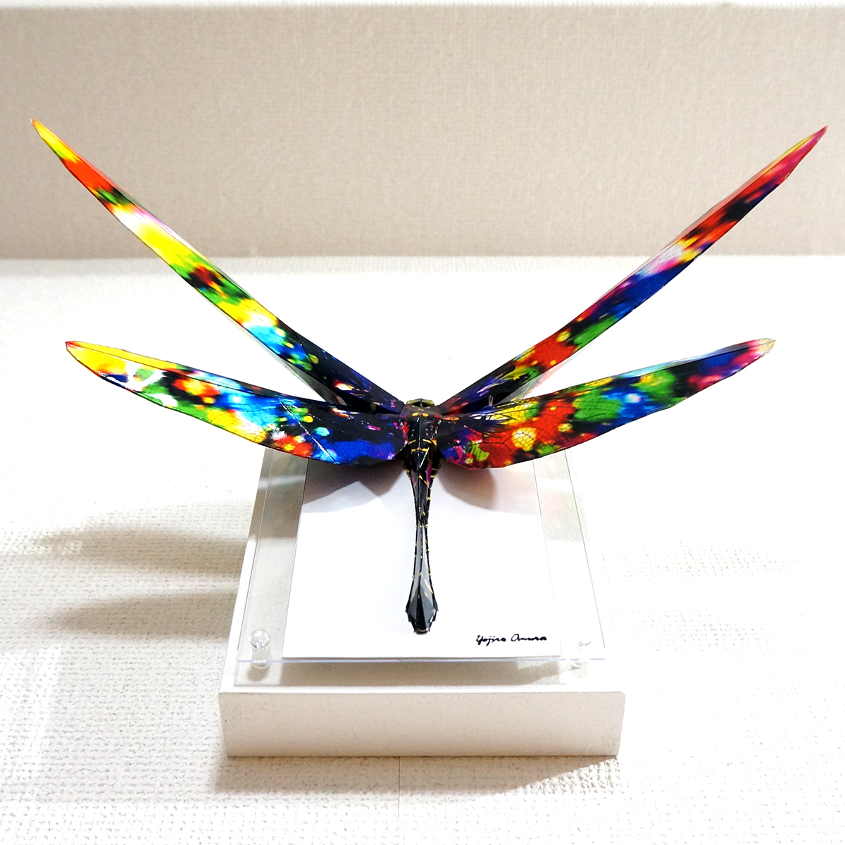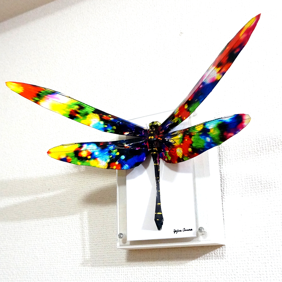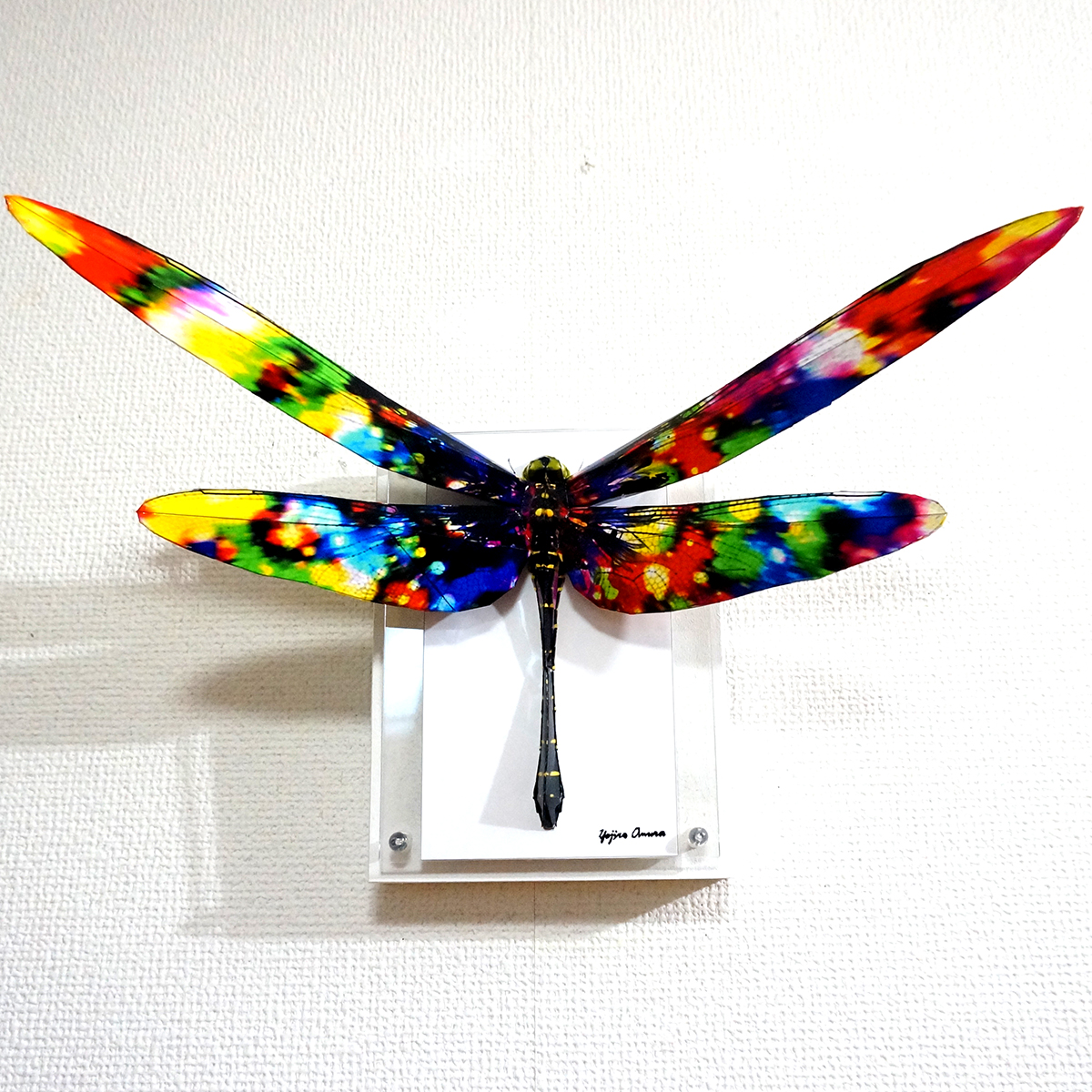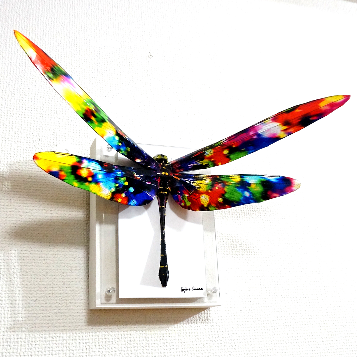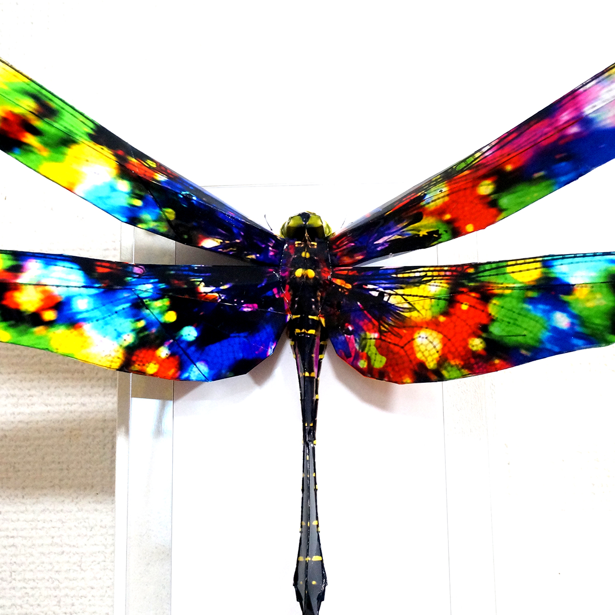 トンボのコラージュ画像を作成し、ペーパークラフト技術を用いて立体的に表現した作品です。