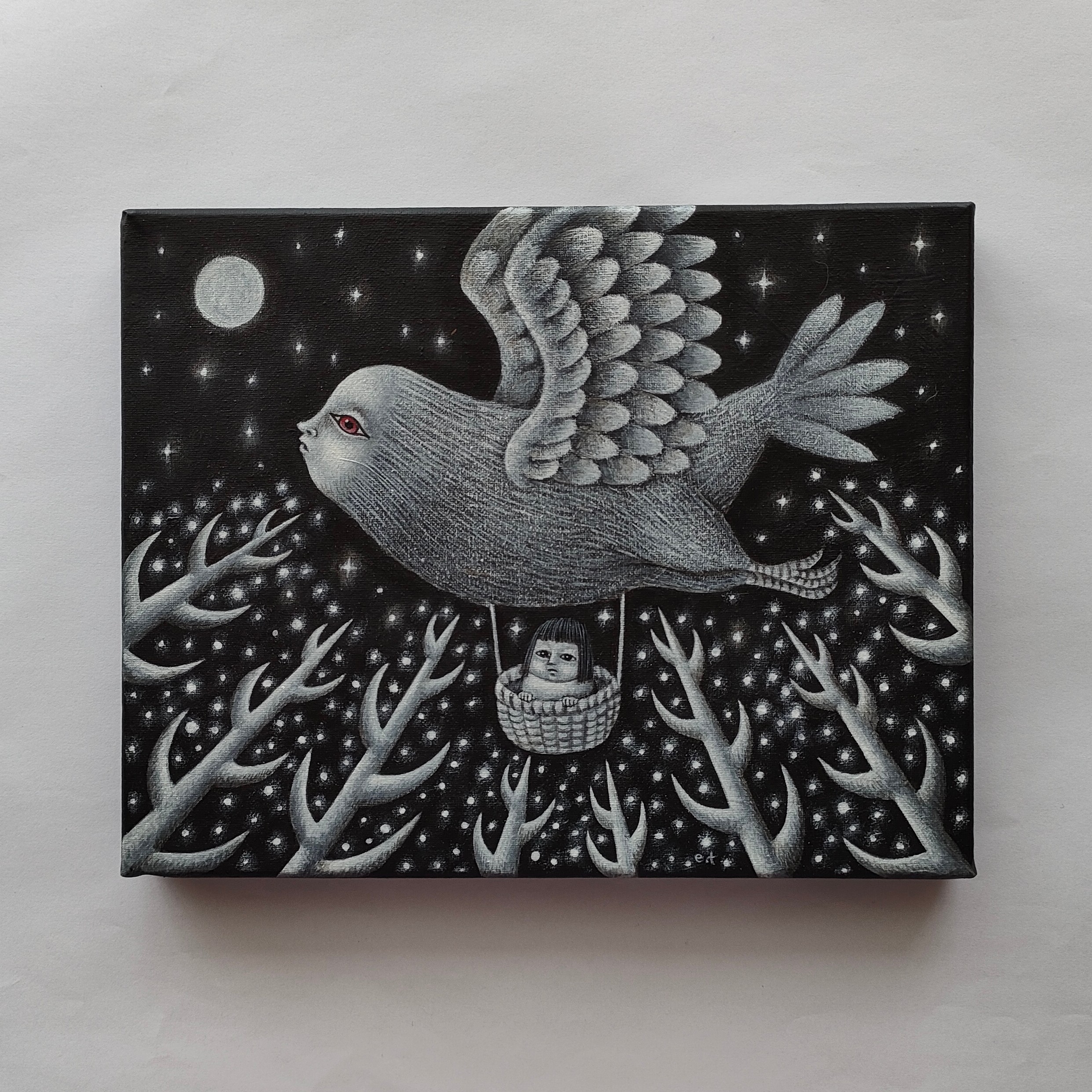 不思議な鳥が女の子を連れて夜空を飛んでいる場面を描きました。