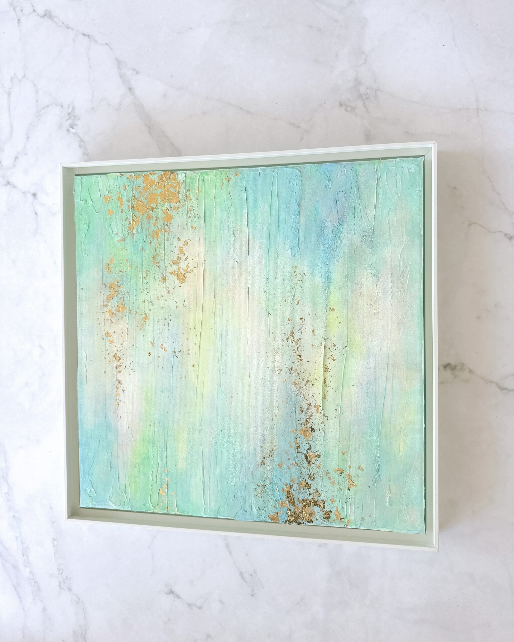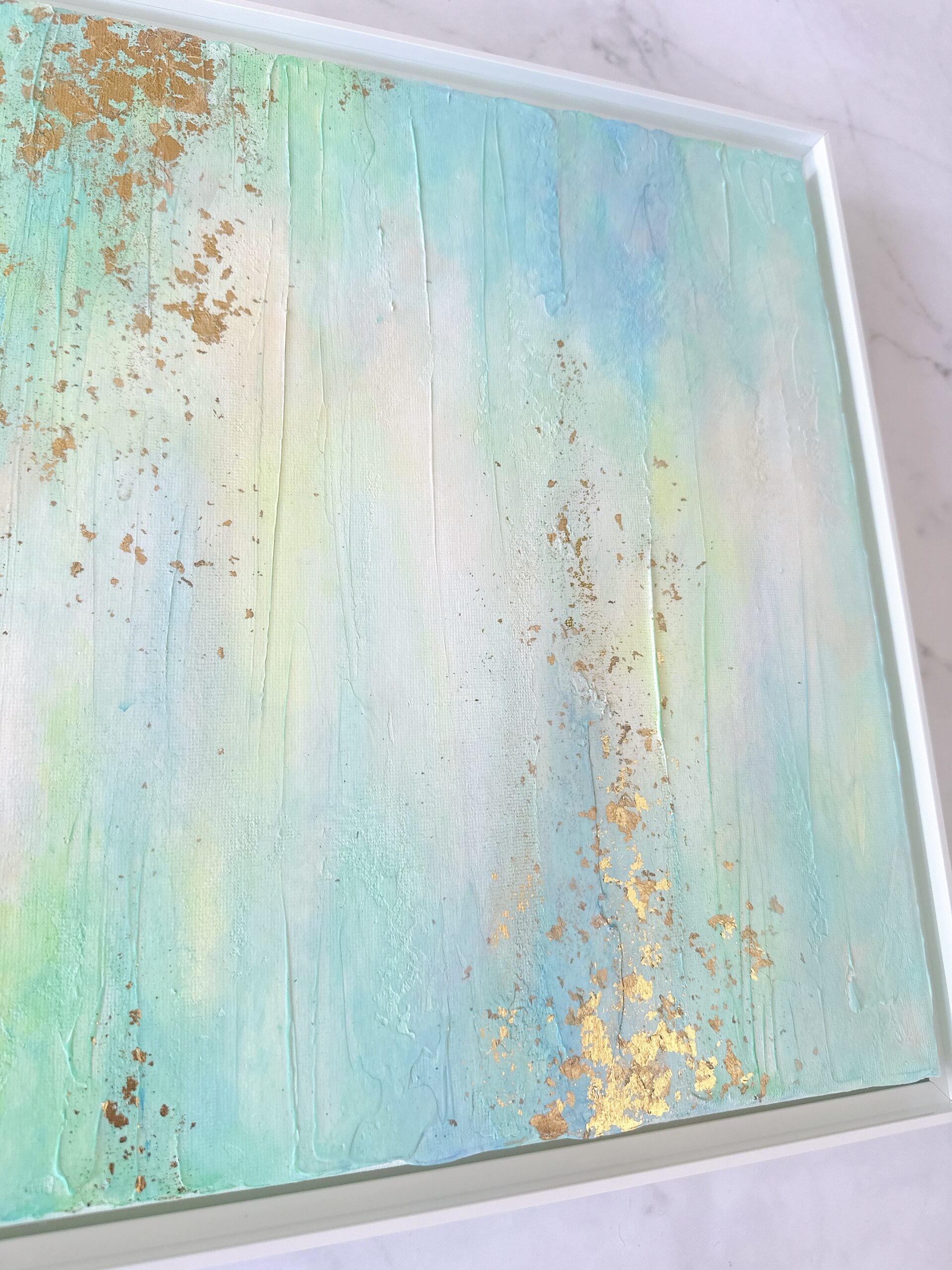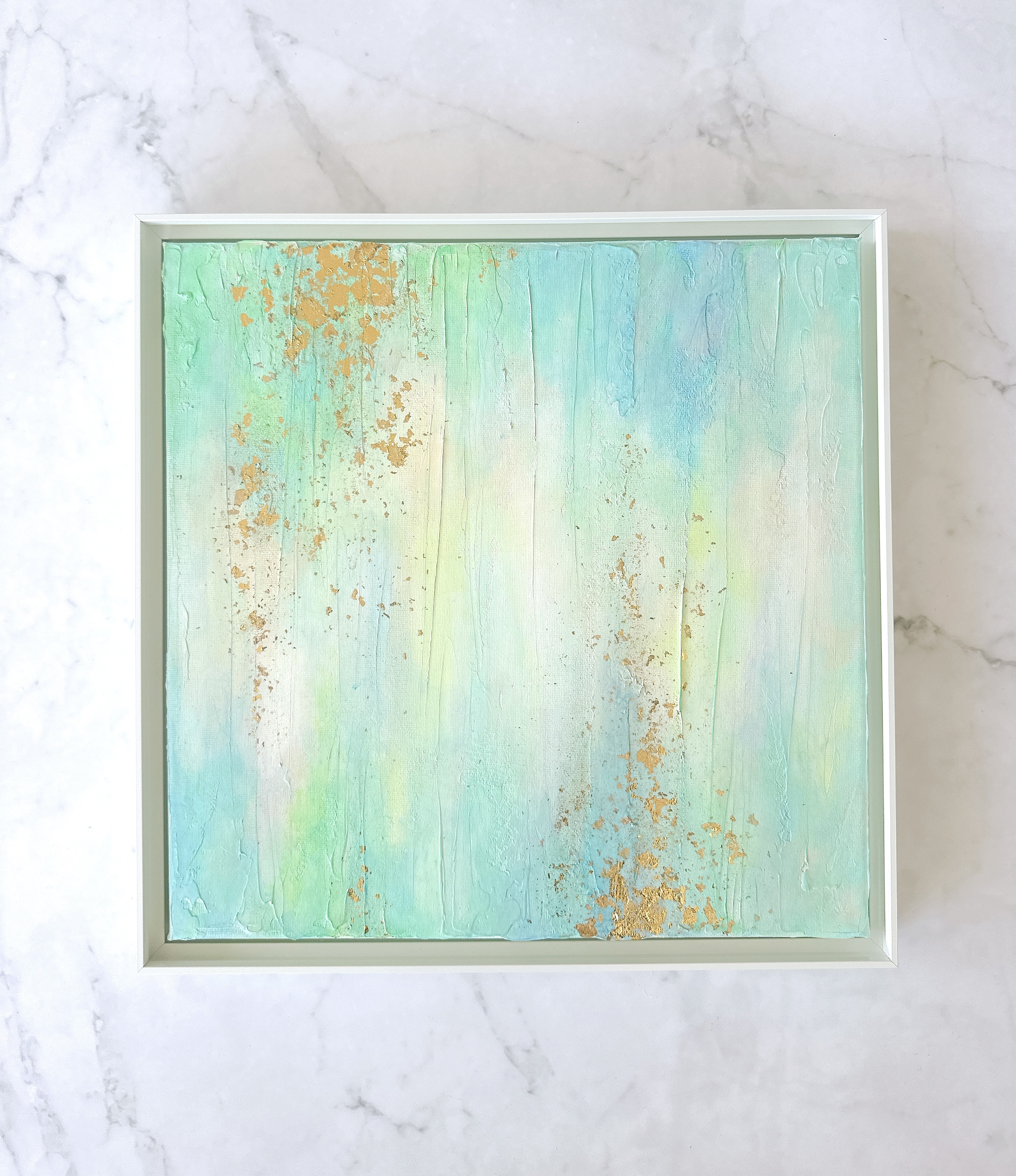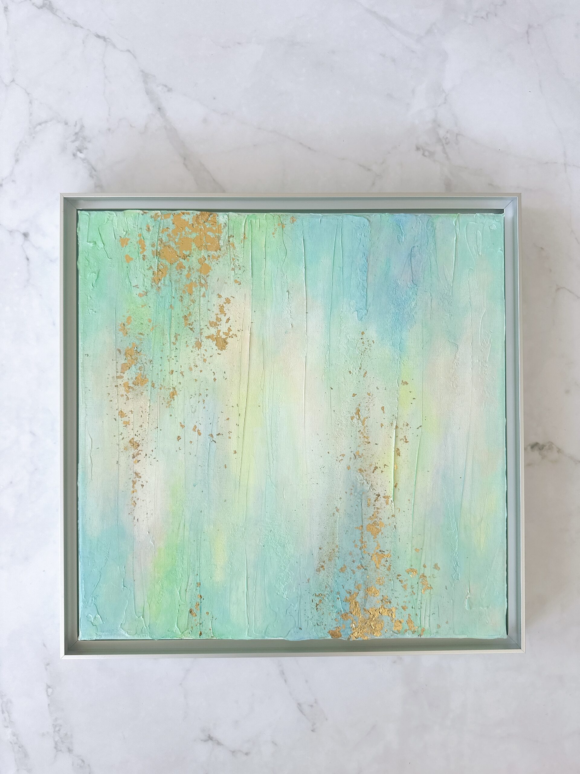 モデリングペーストで下地を作っていますので、見る角度により色彩に表情があります。 全体的に淡い色彩の中に箔を散りばめていますので、穏やかで上品な作品になっています。