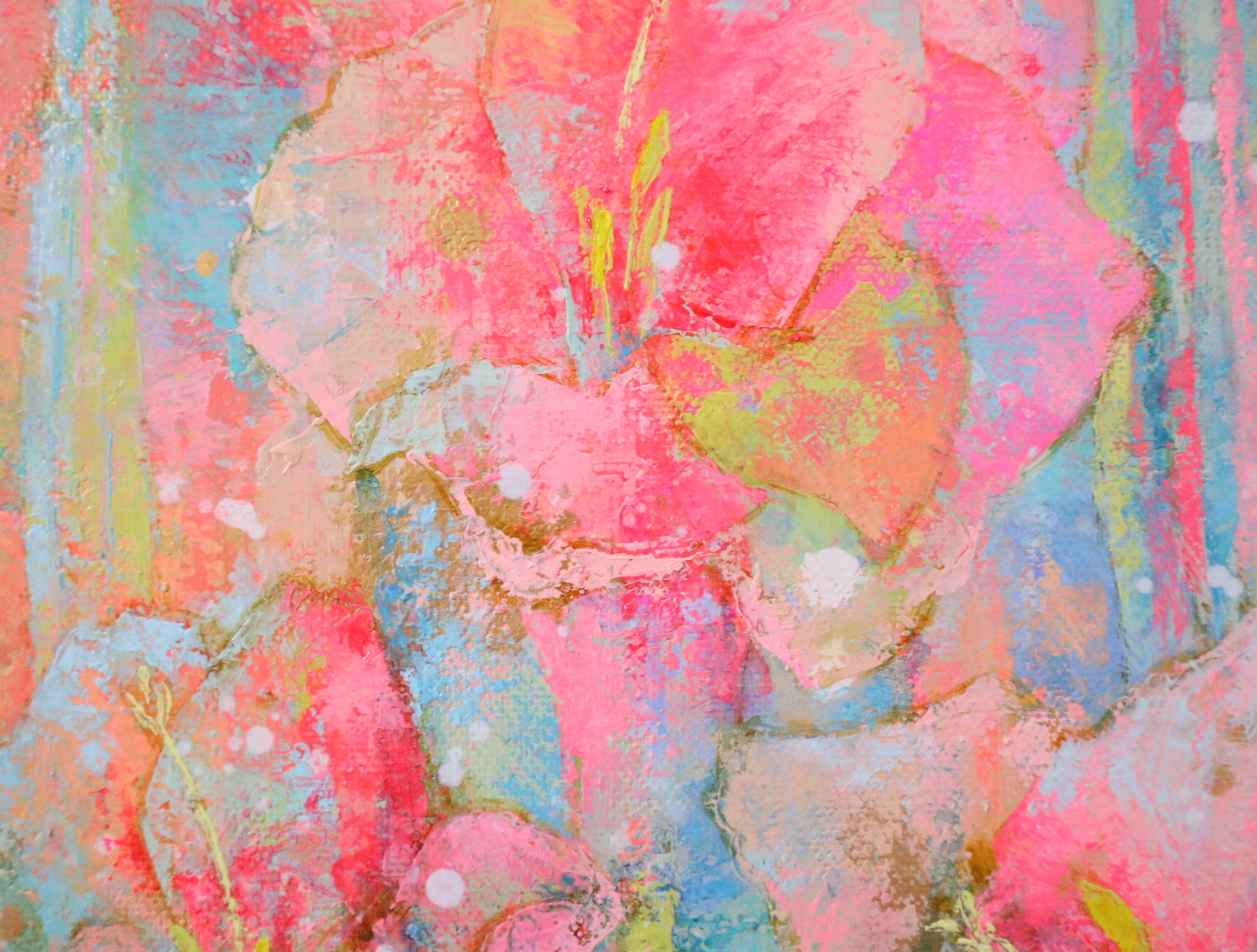薄く溶いた油絵具を何層にも重ねて描き、最後にローラーを使い色を重ねて深みを出しました。色の重なりの美しさを感じていただけたら、嬉しいです。