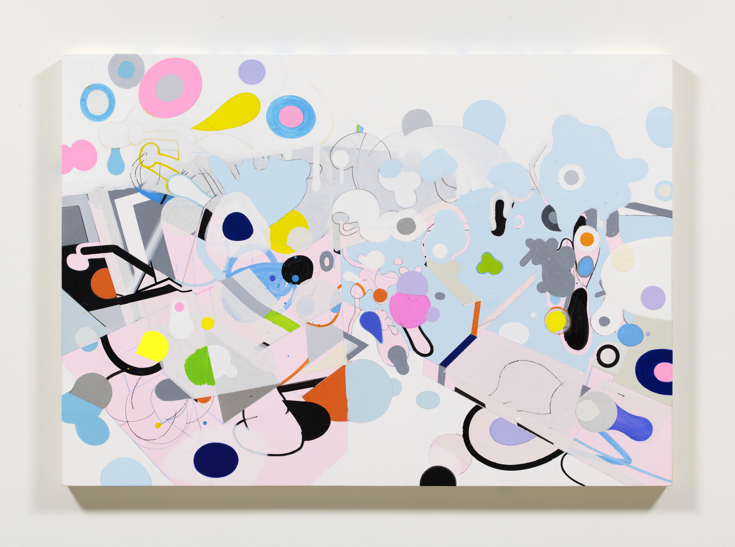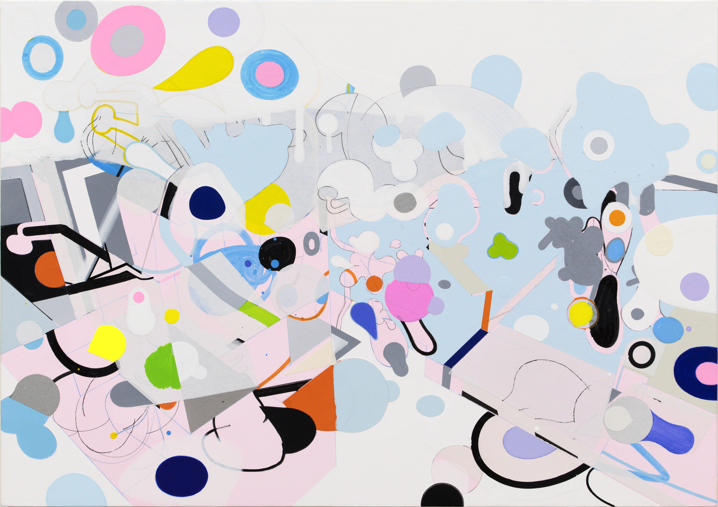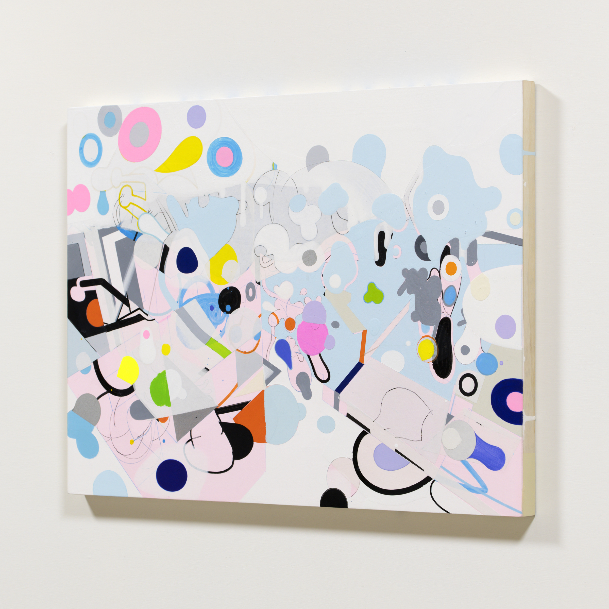 木製パネルにアクリル絵具、アクリルマーカー、鉛筆、紙のコラージュ