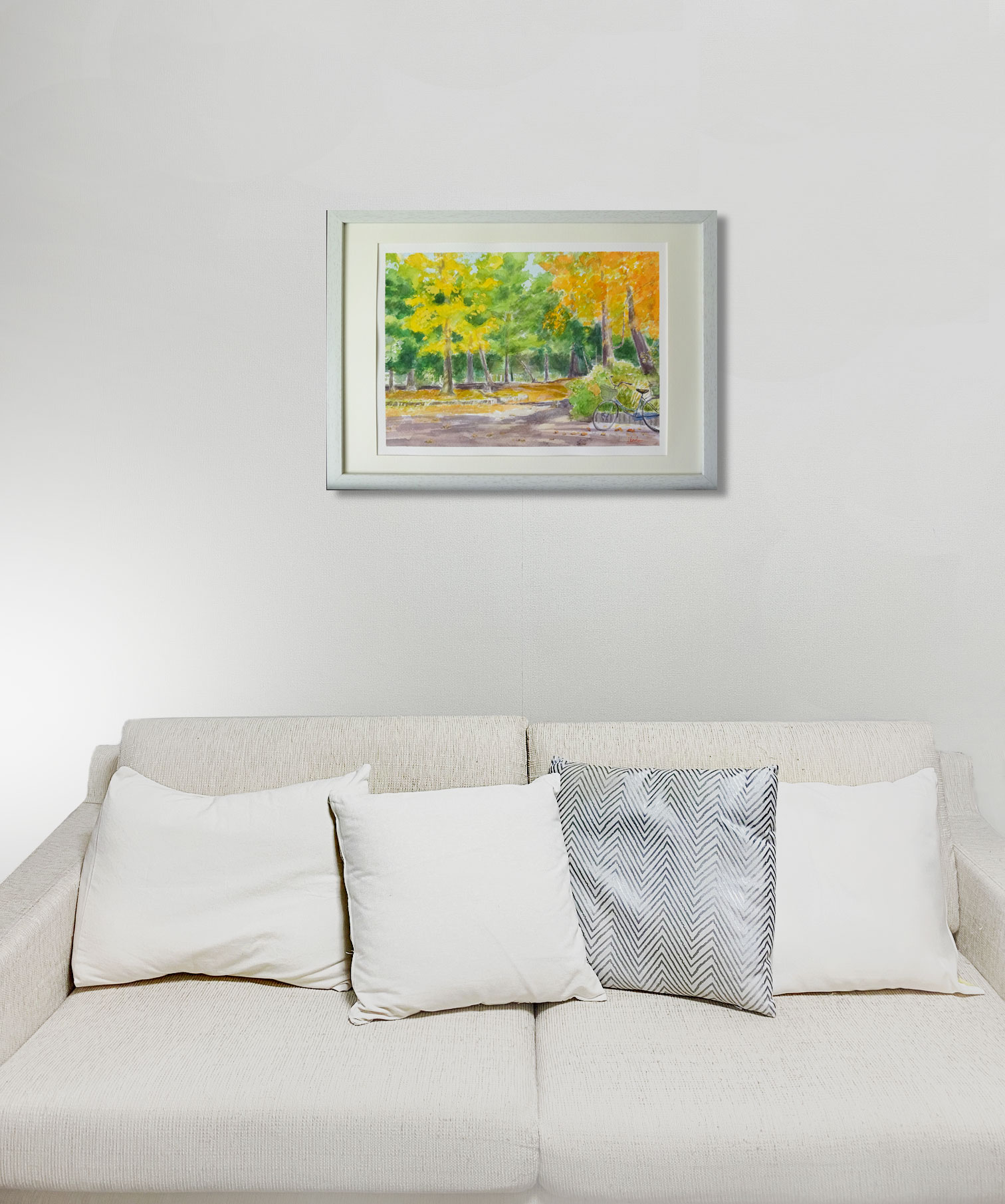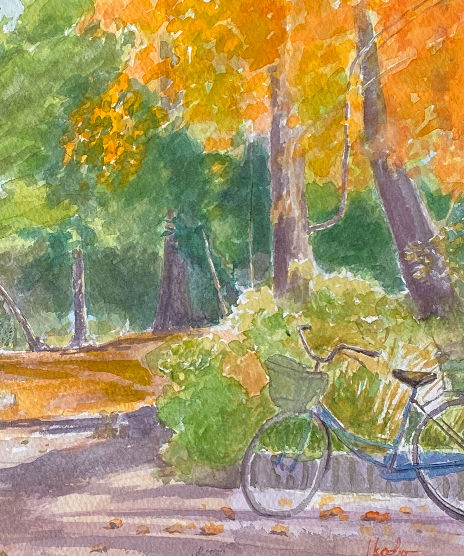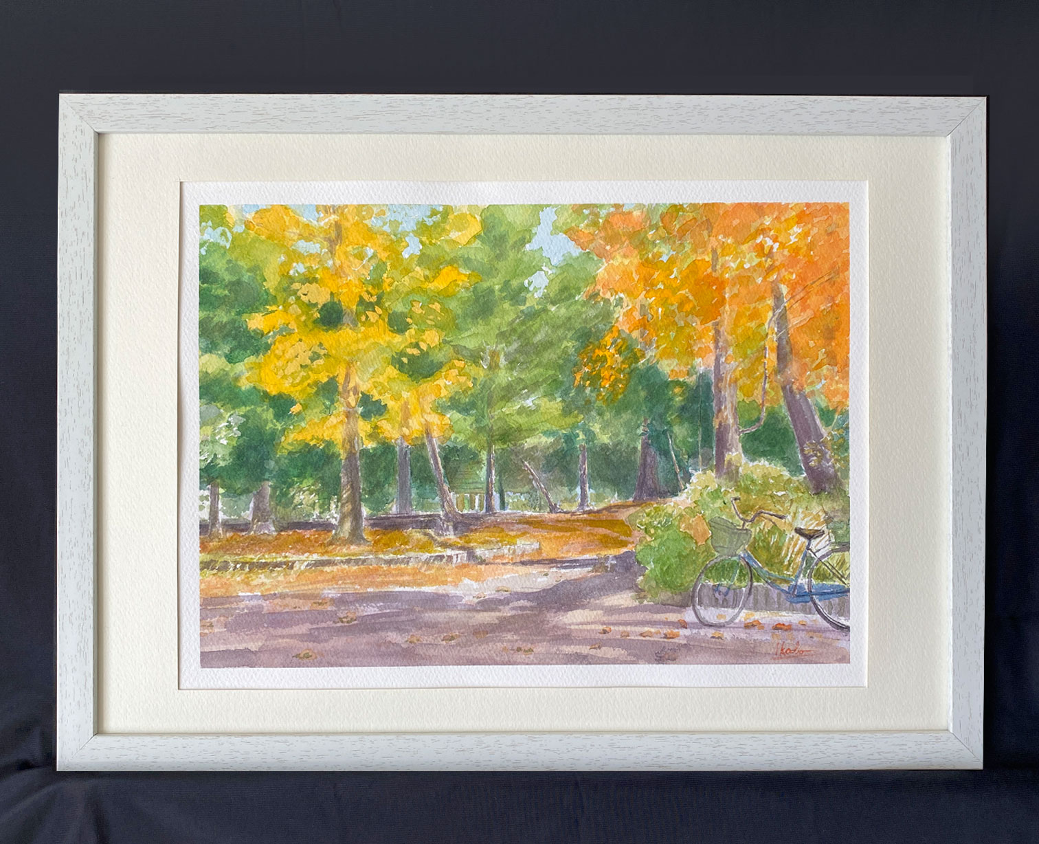 11月の初秋の紅葉の時期、自転車を走らせていて思わず見とれた木々の色と影を描いてみました。