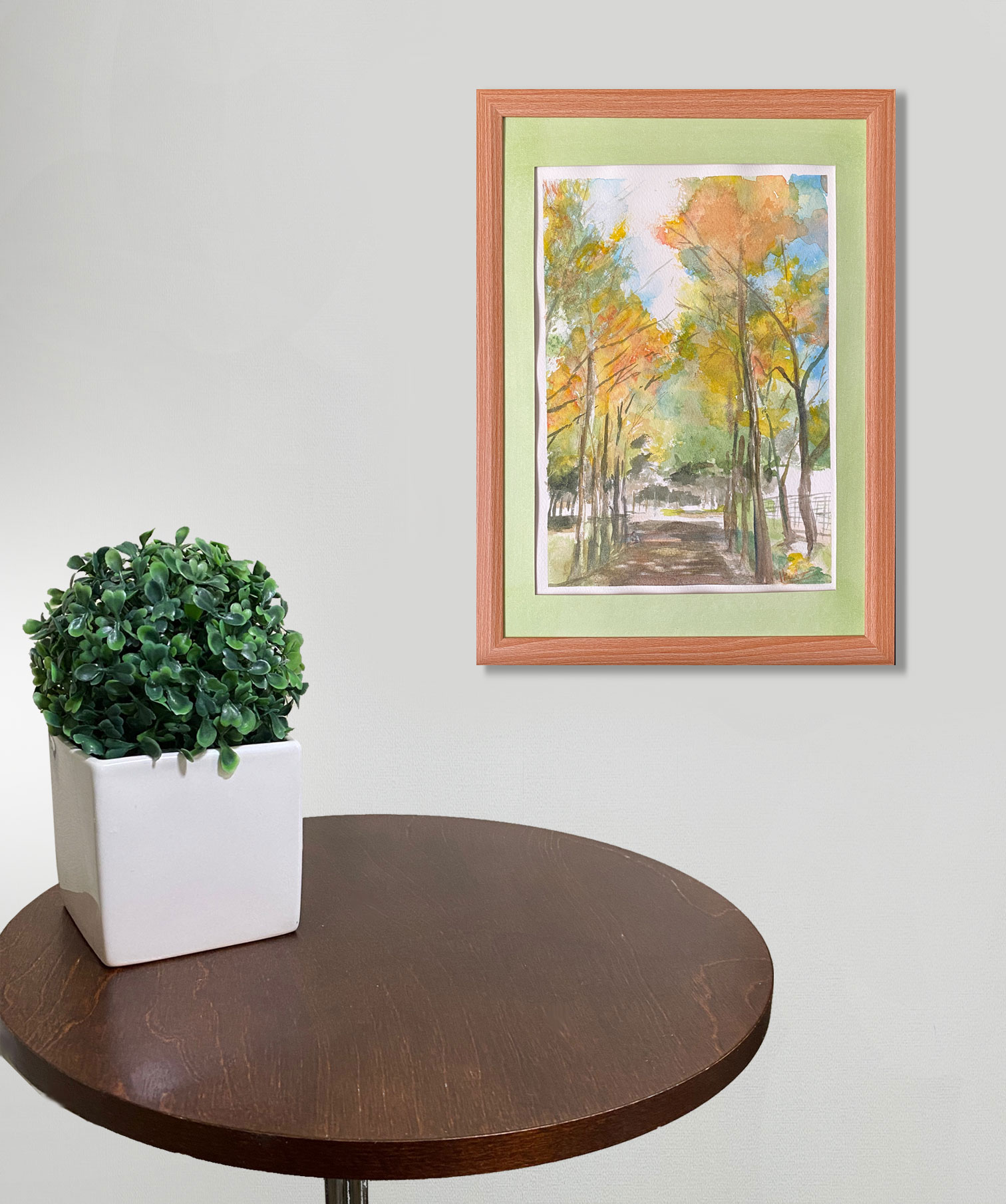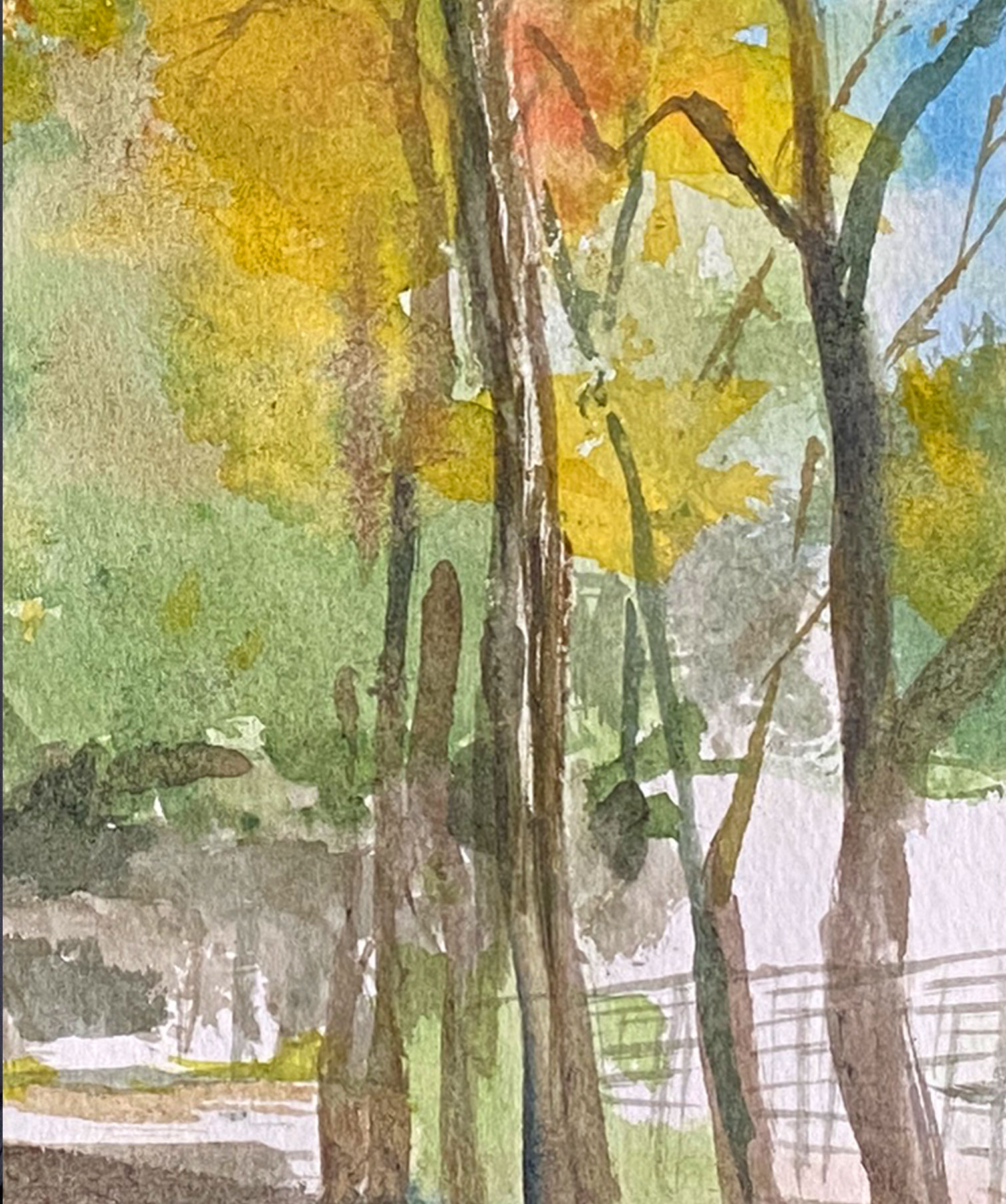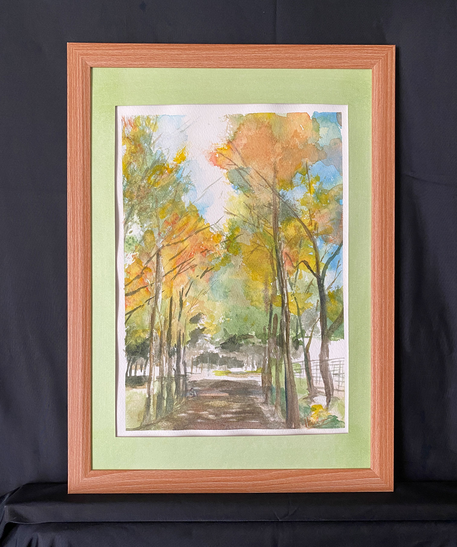 公園の並木道を見上げると、真っ青な空が見えました。紅葉の黄色との対比が美しく感動して描いてみました。