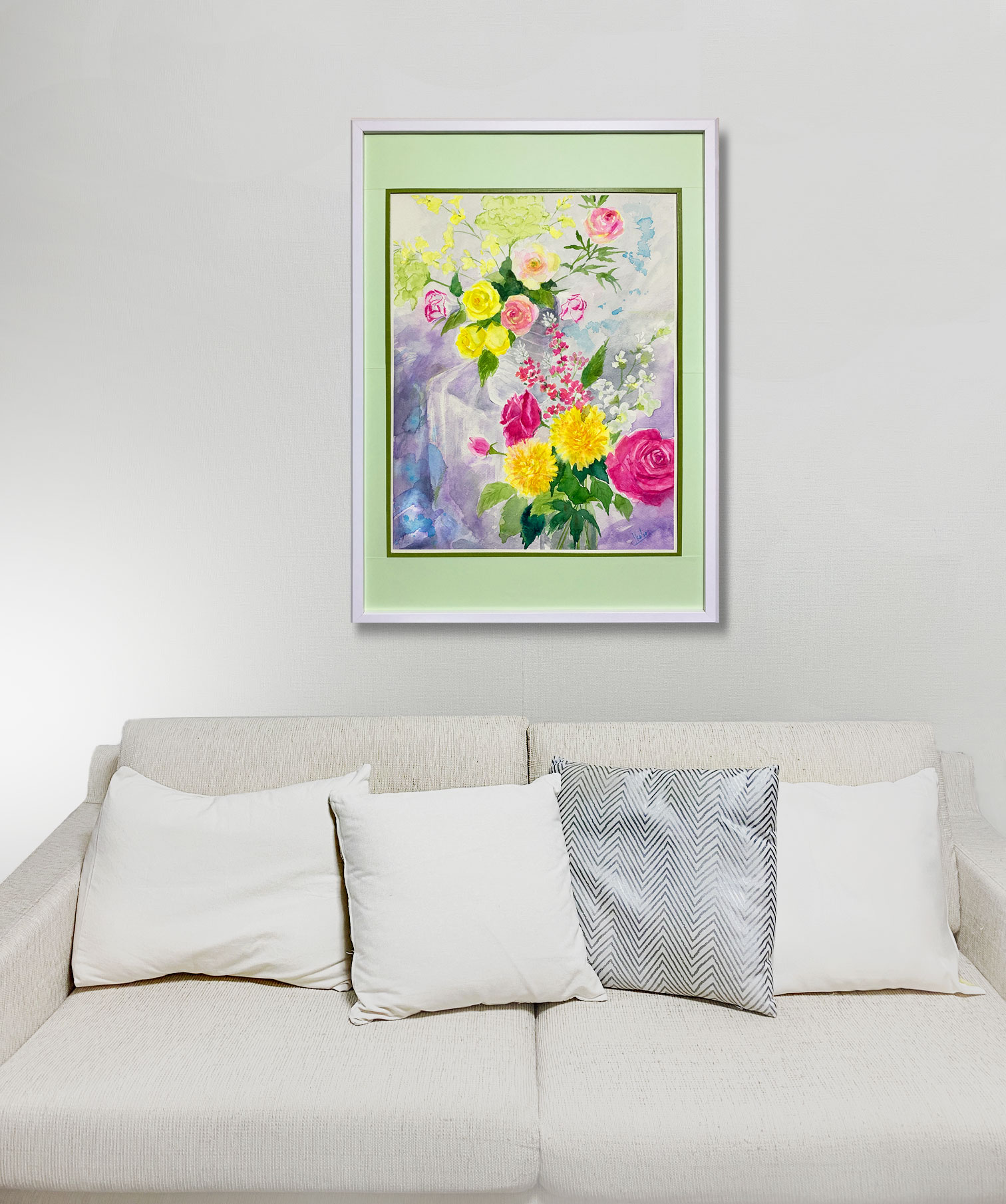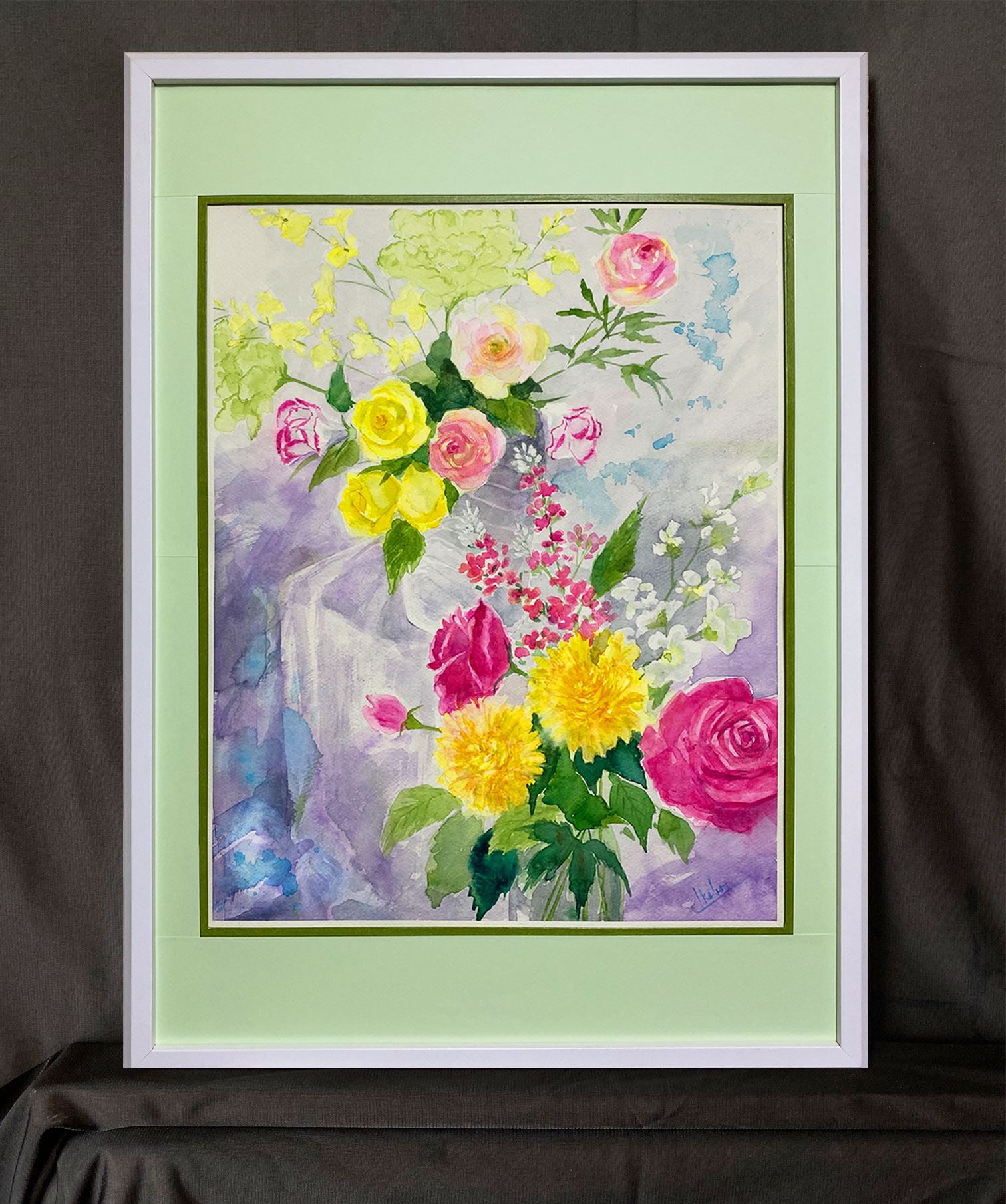 沢山の花々が楽し気に歌っているように見え、それを描きました。2色のグリーンのダブルマットを合わせました。