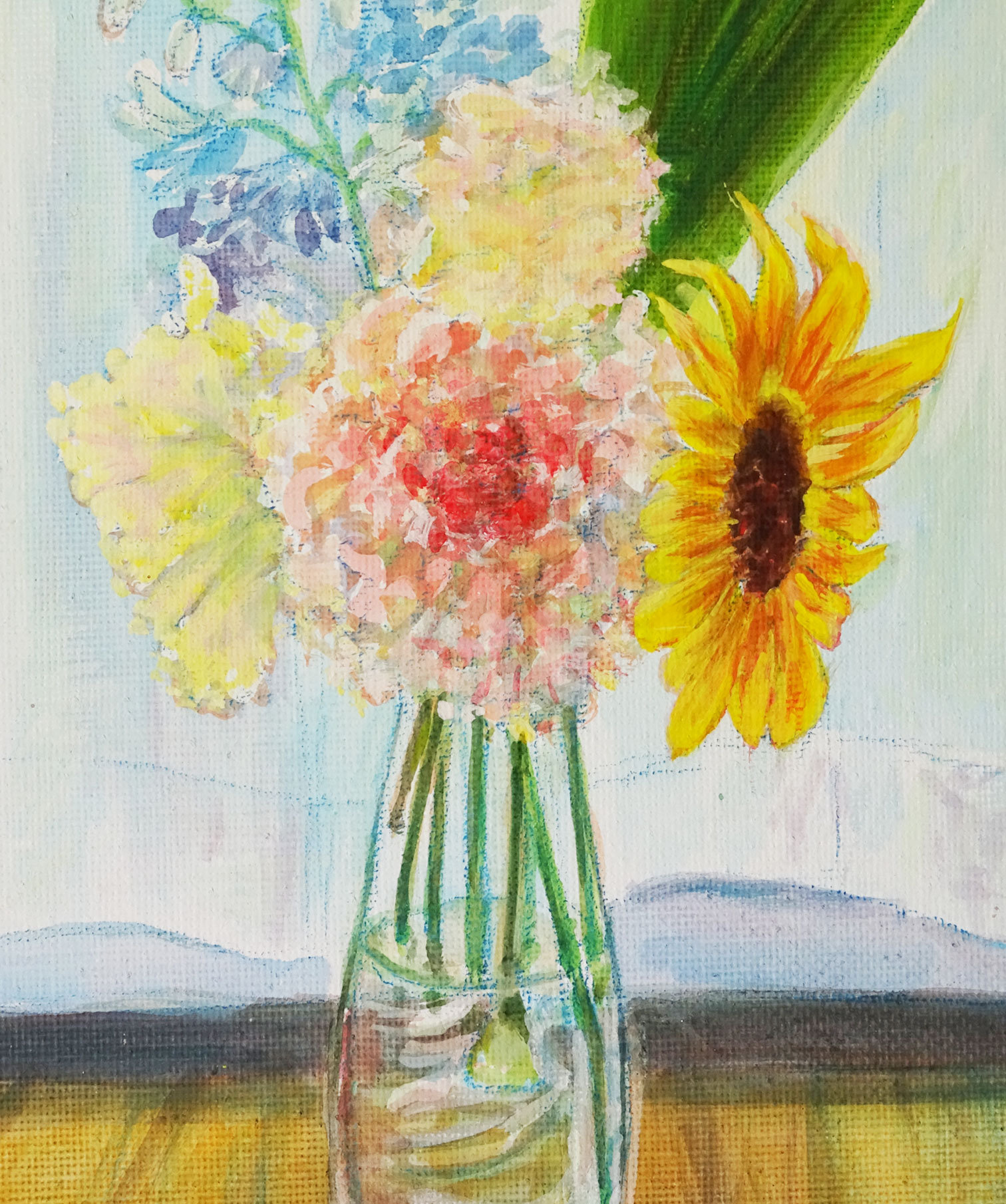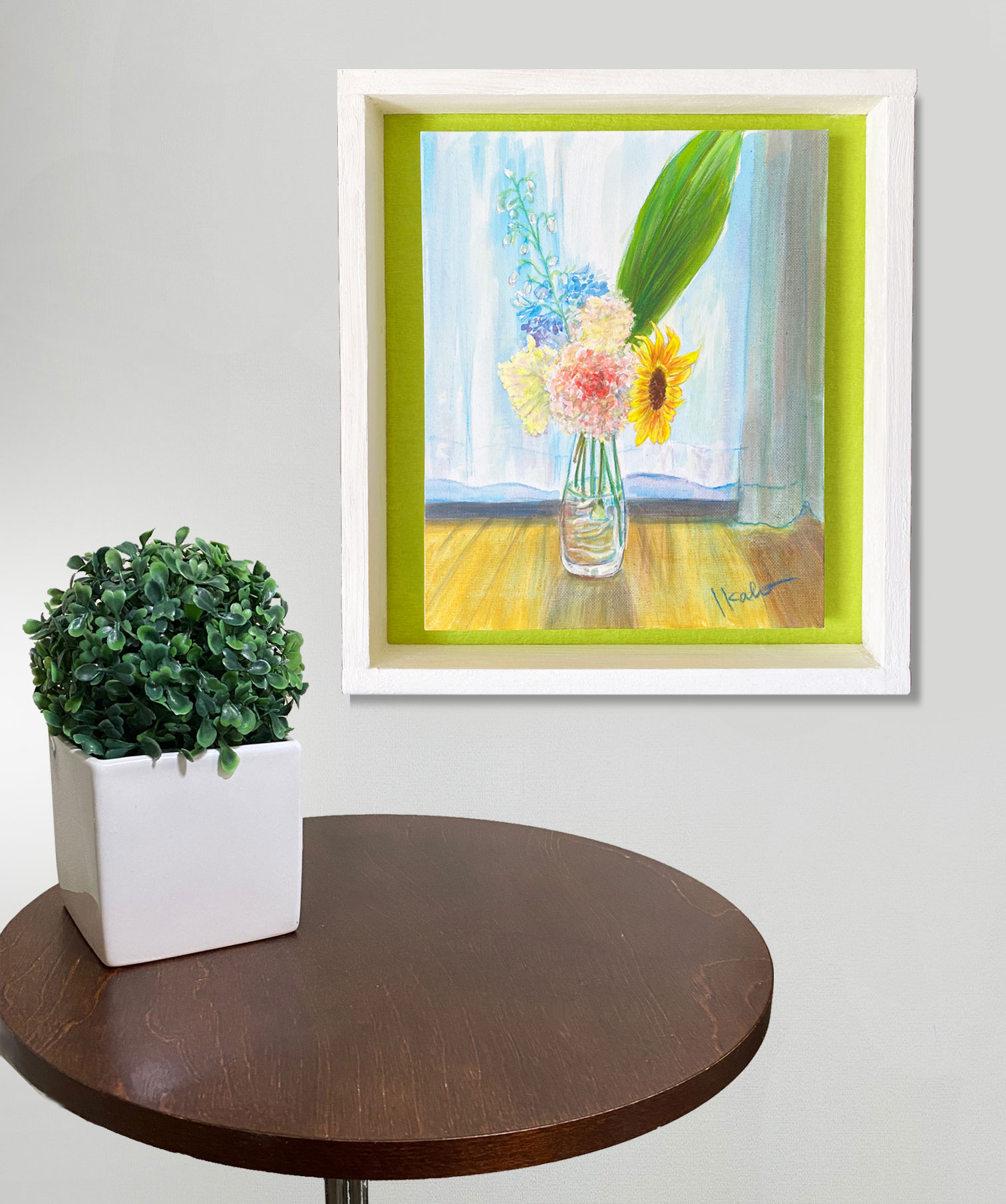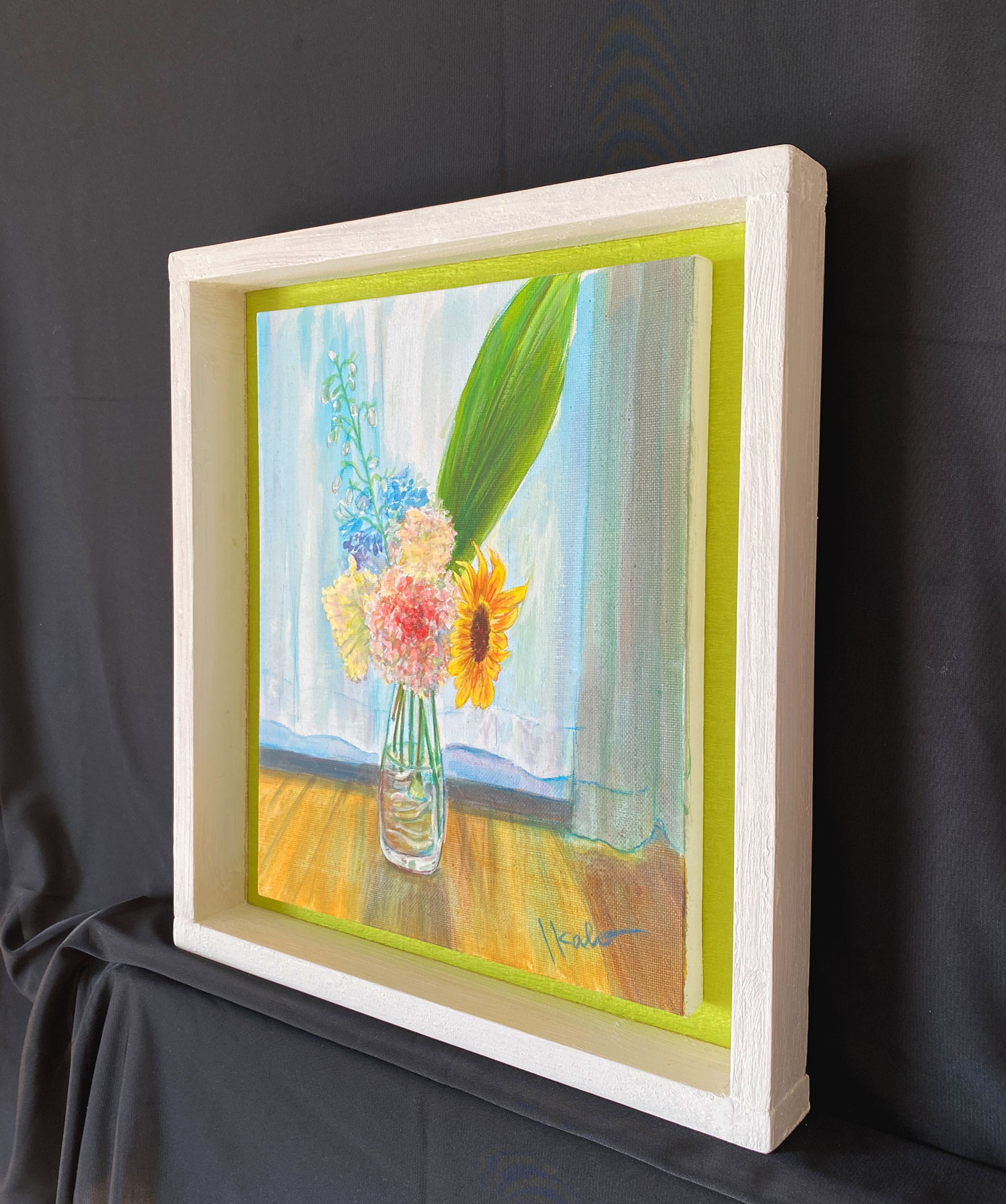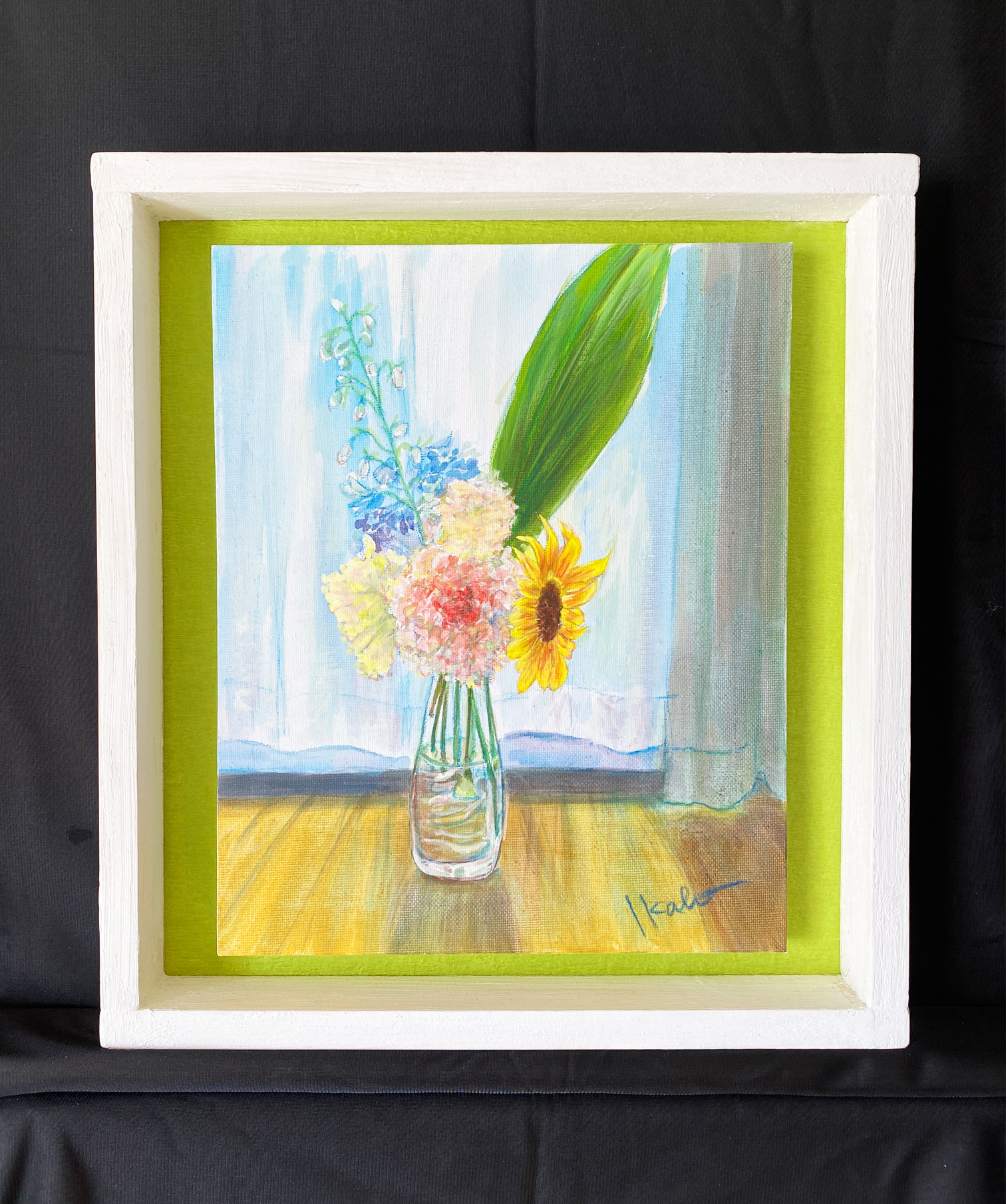 いただいた花束を窓辺に置いてスケッチし、アクリル絵具と色鉛筆で明るく描きました。手作りのボックス型フレームを合わせました。(アクリル板はありません。)
