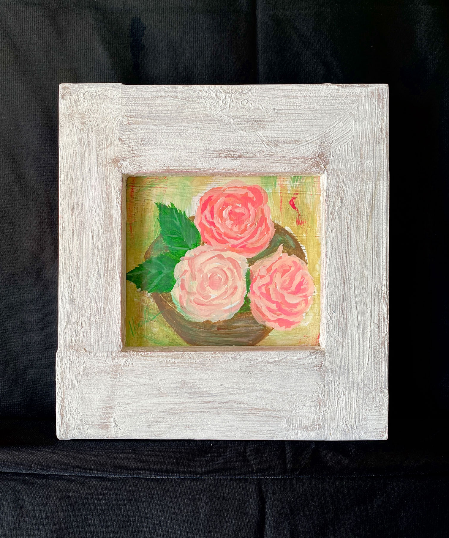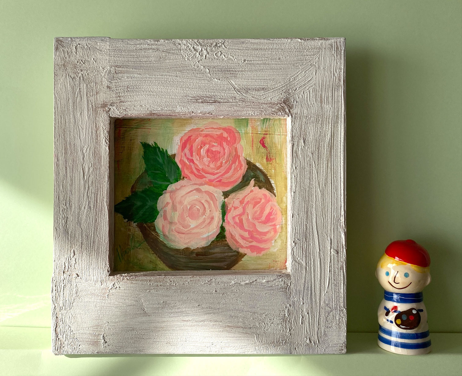 気軽に飾れるアクリル絵具で描いたミニバラの小作品です。(アクリル板と人形は付いていません。)