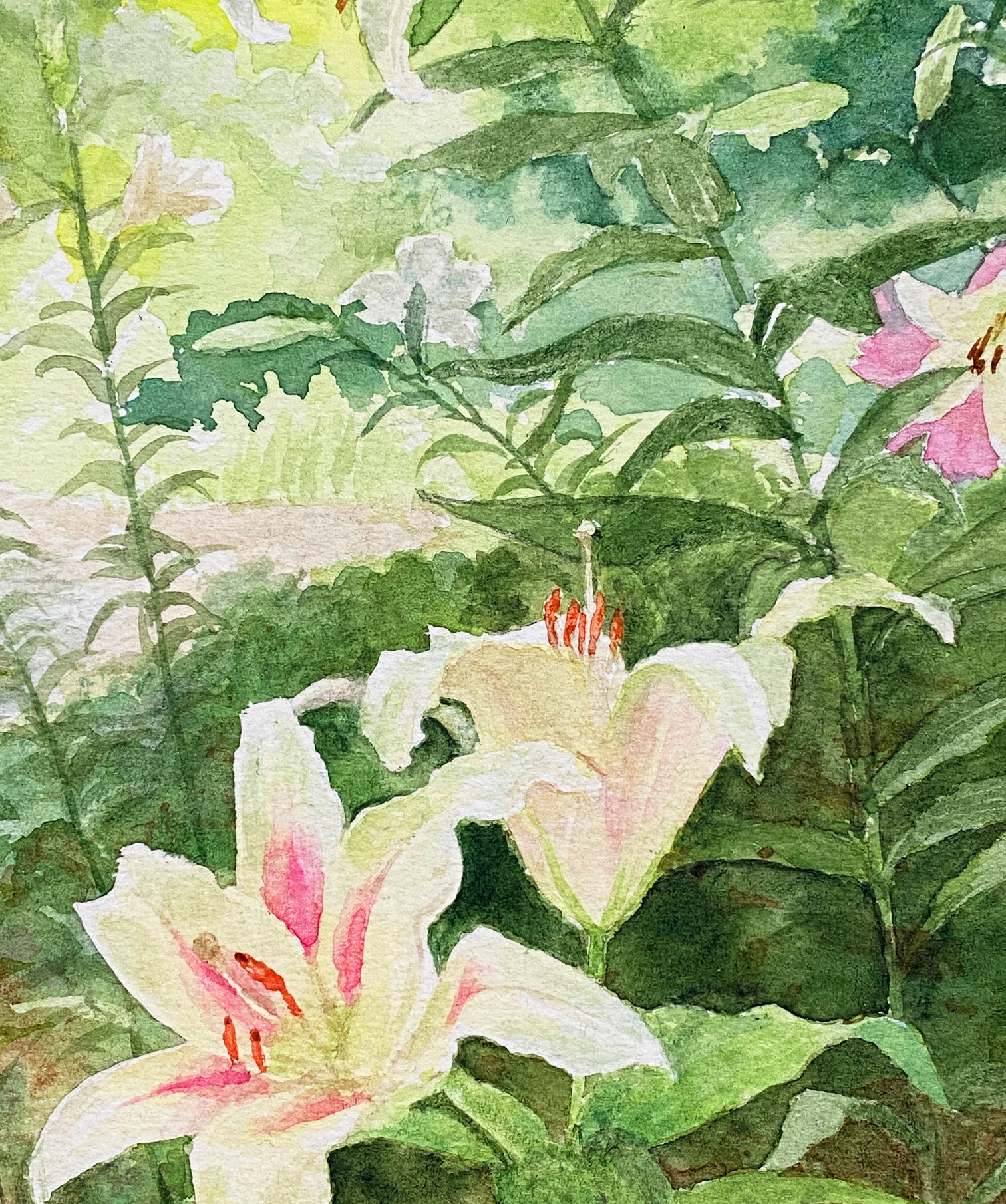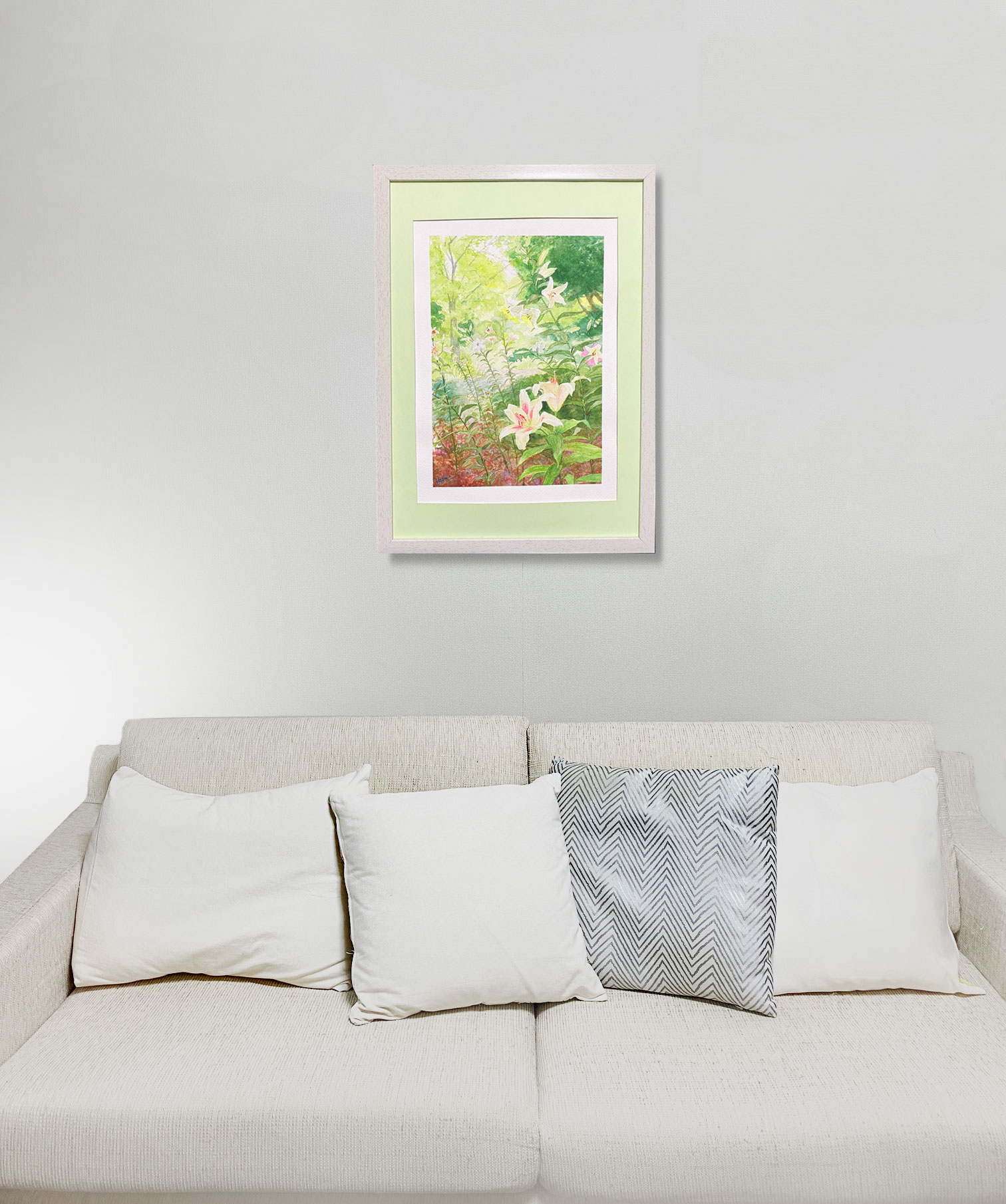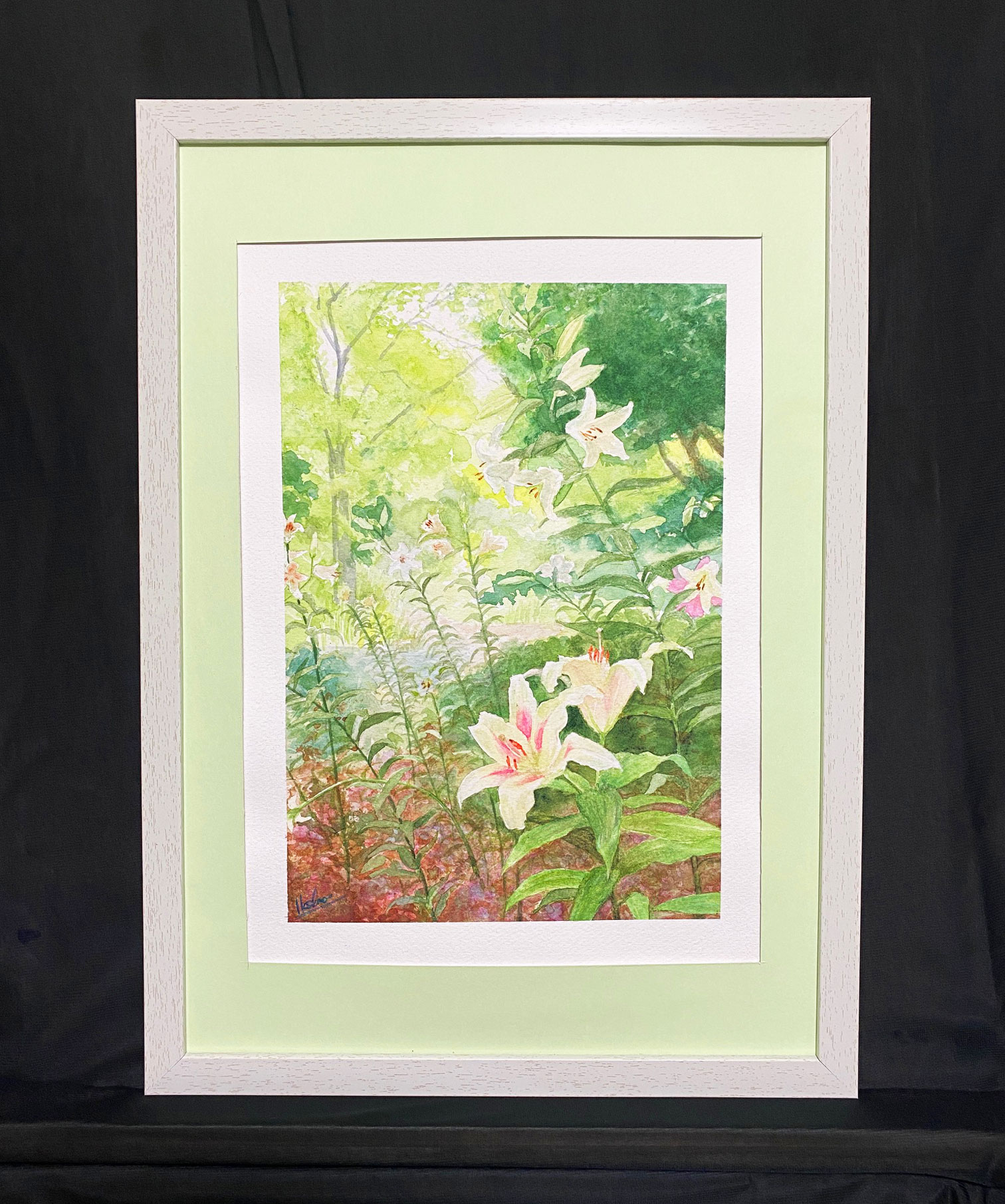 日比谷公園で見かけた百合の群生に感動し、描いてみました。マットとフレームも絵に合わせて額装しました。