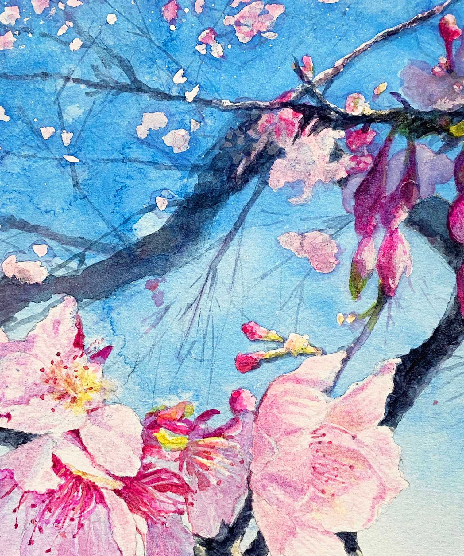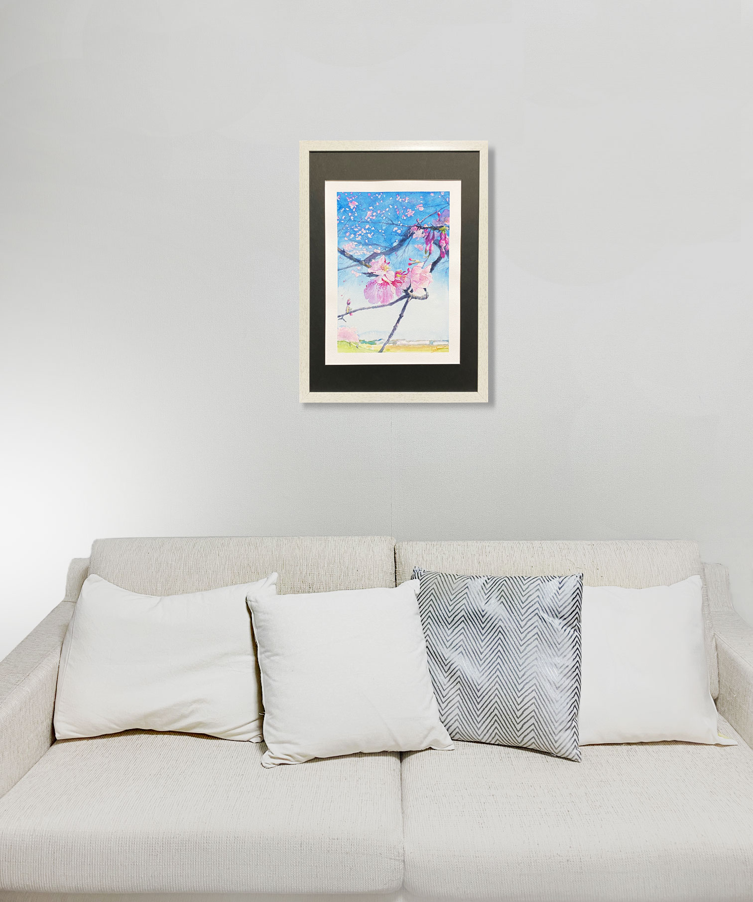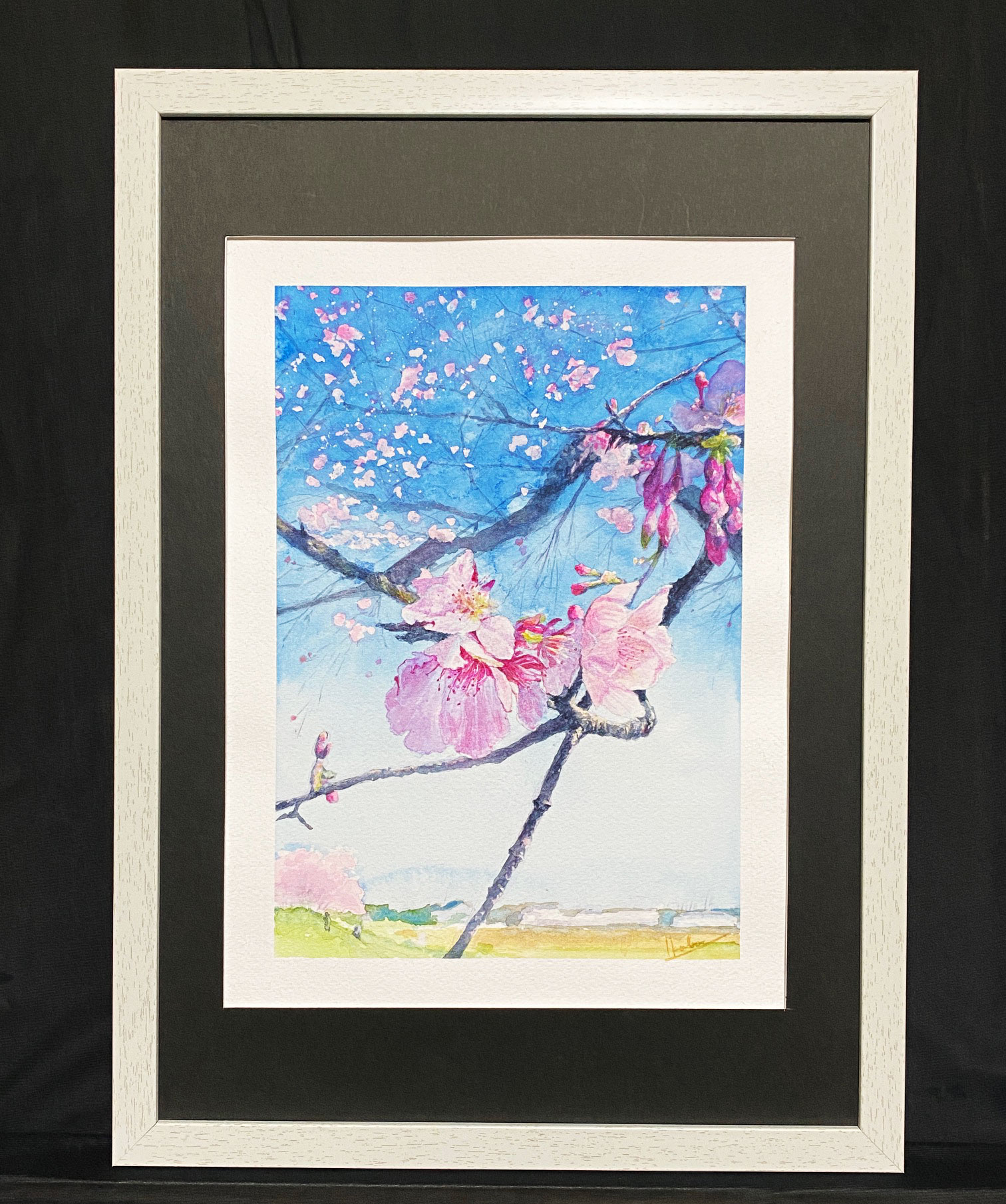 3月に咲く寒桜の群生を見に行きました。青空の下で、やわらかなつぼみが力いっぱい開こうとしている姿を描きました。マットとフレームも絵に合わせて額装しました。