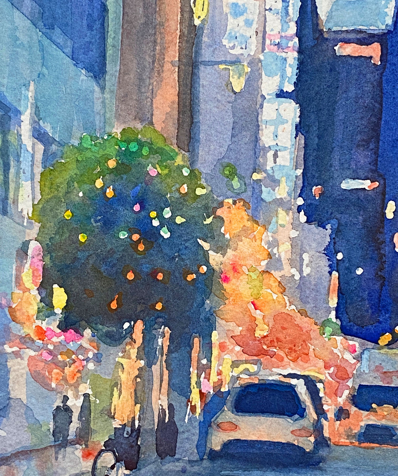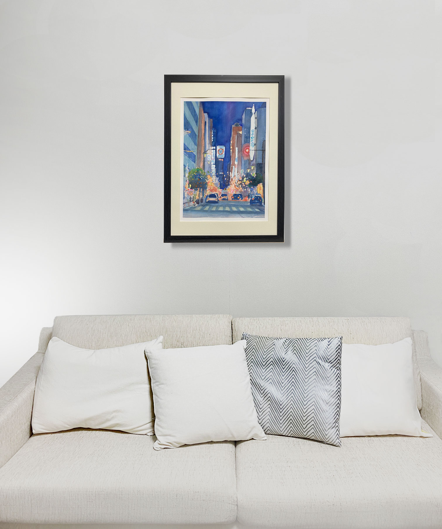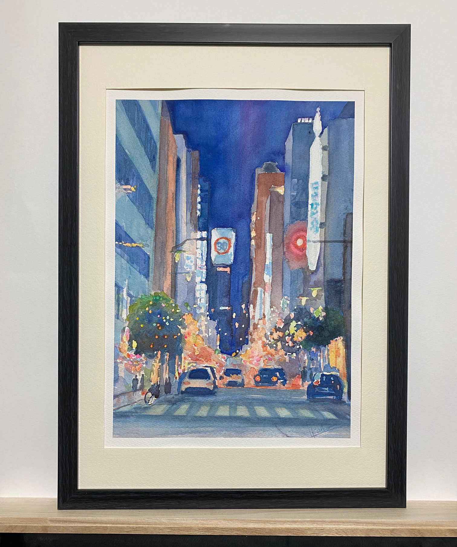 銀座のダークブルーの夜景にきらきらと輝くイルミネーションをやわらかく表現しました。待ちゆく人々も楽しそうでしたので、その雰囲気もだせたかなと思います。マットとフレームも絵に合わせて額装しました。
