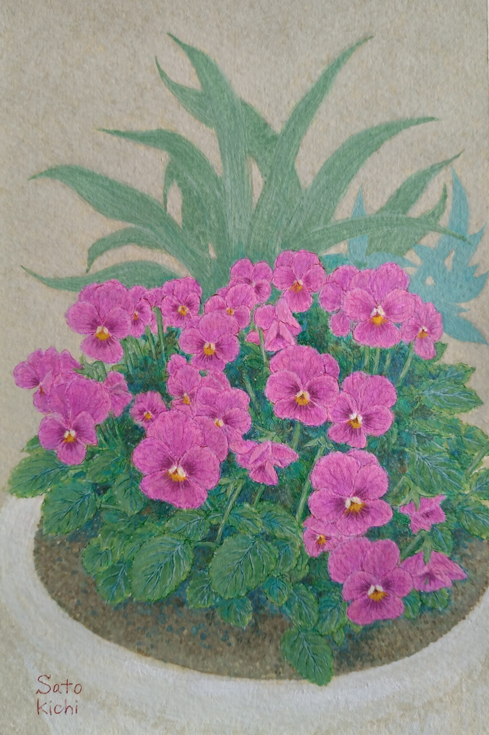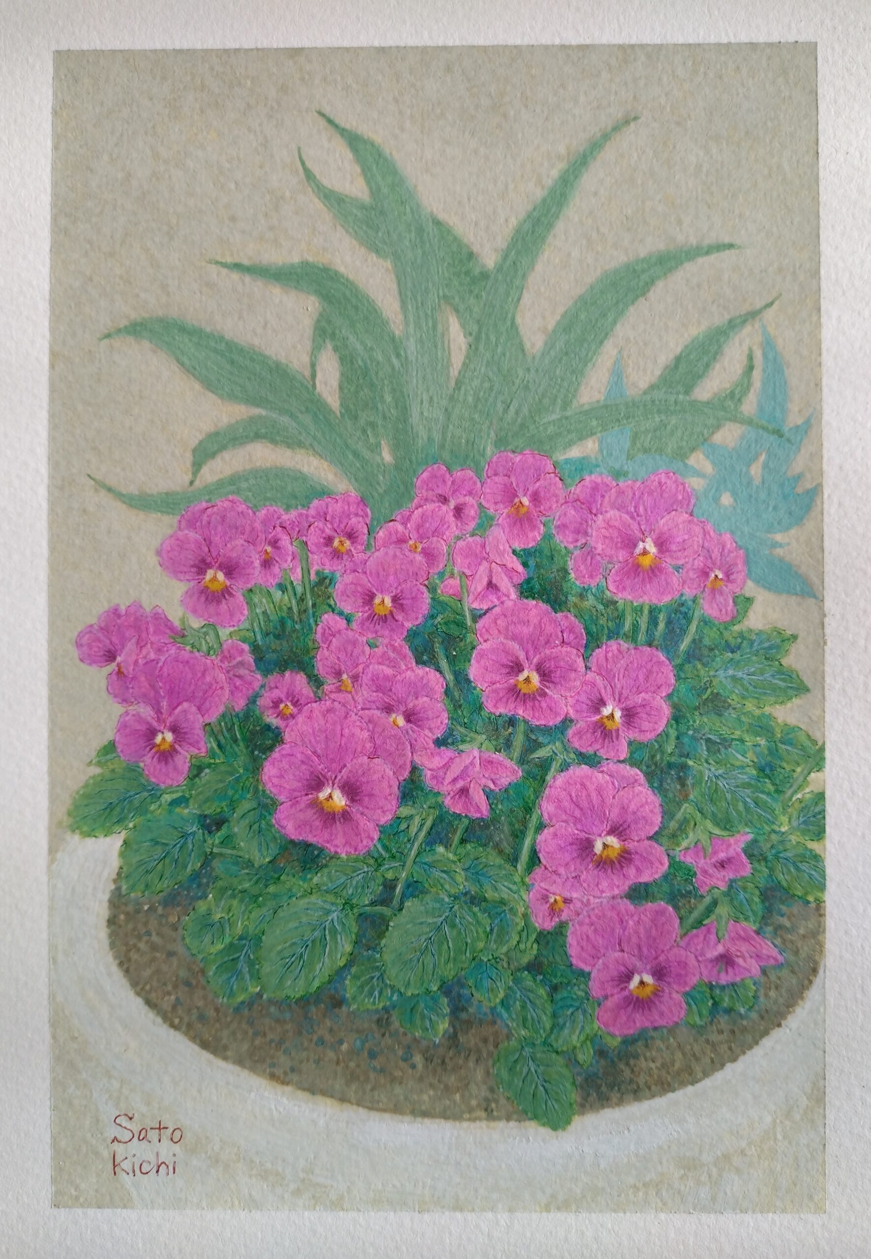 ビオラを描きました。冬越し後に沢山咲いてくれる姿に元気を貰っています。実物はもう少し落ち着いた色味です。