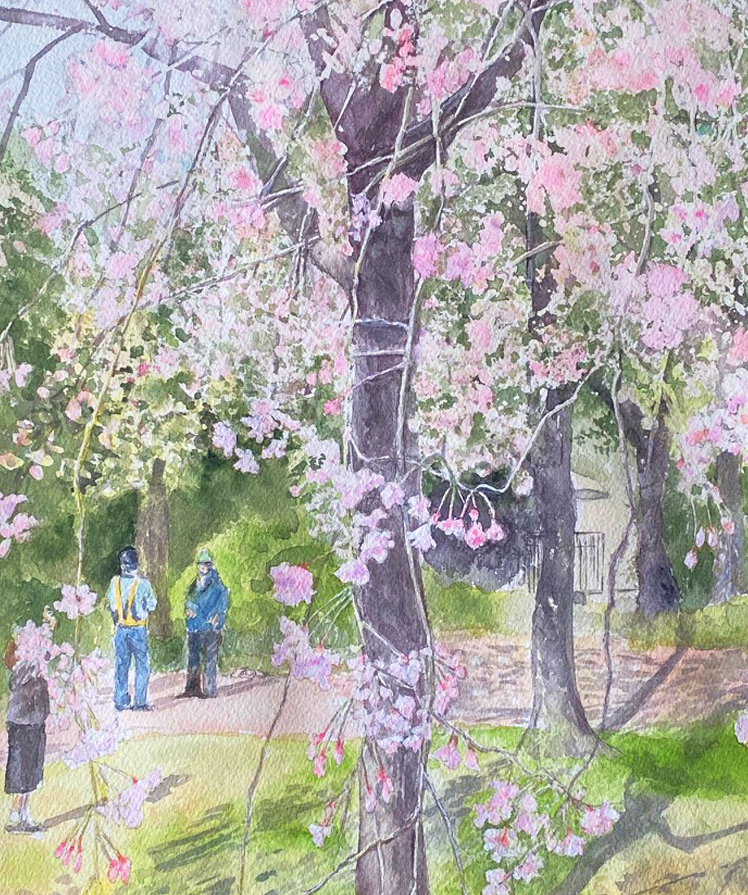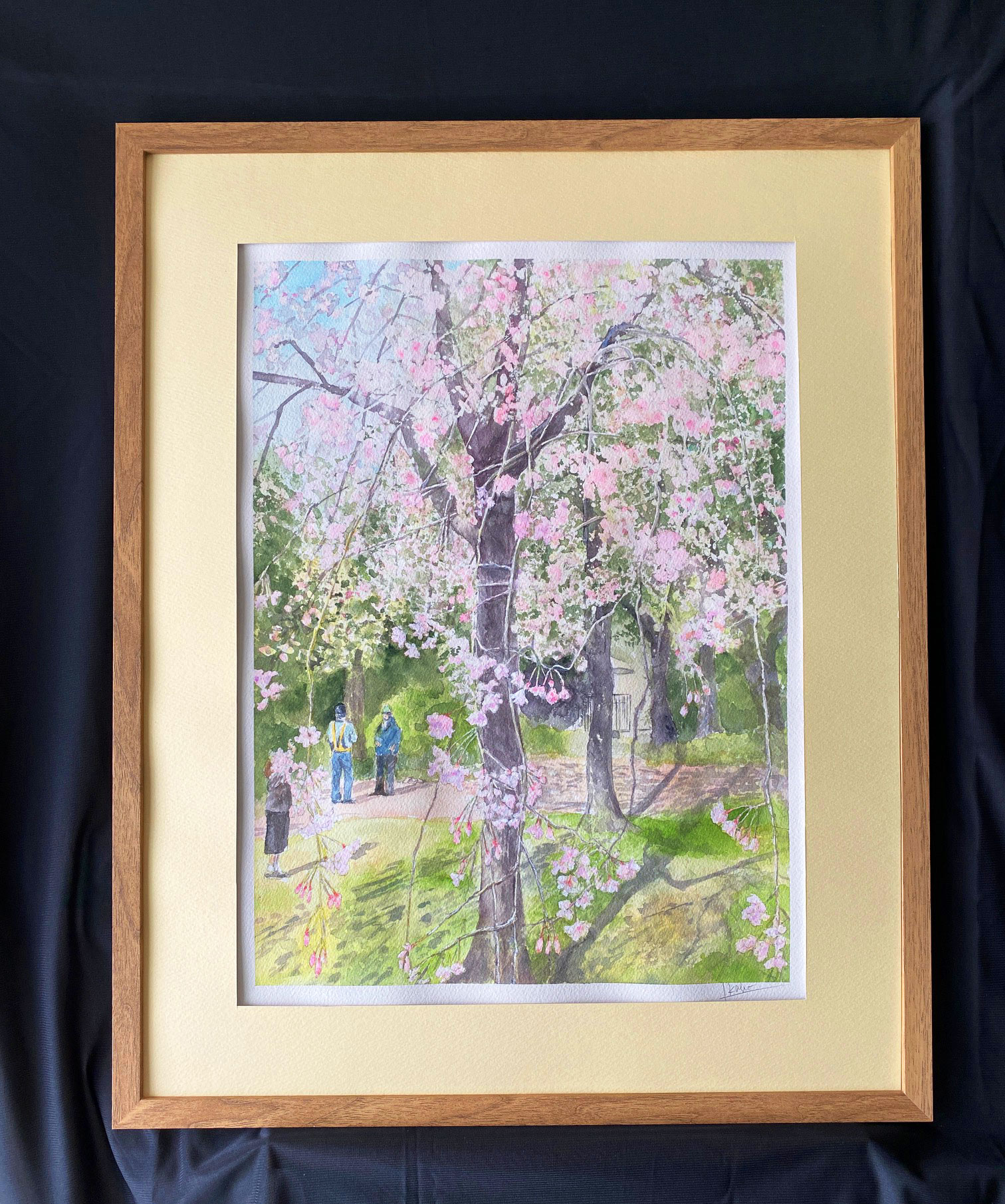 日比谷公園を散歩していると、素晴らしいしだれ桜の大木に出会いました。多くの人々が足を止め、撮影していました。その美しさを共有したいと思い描きました。公園を管理されている方々も感謝を込めて描きました。マットとフレームも絵に合わせて額装しました。