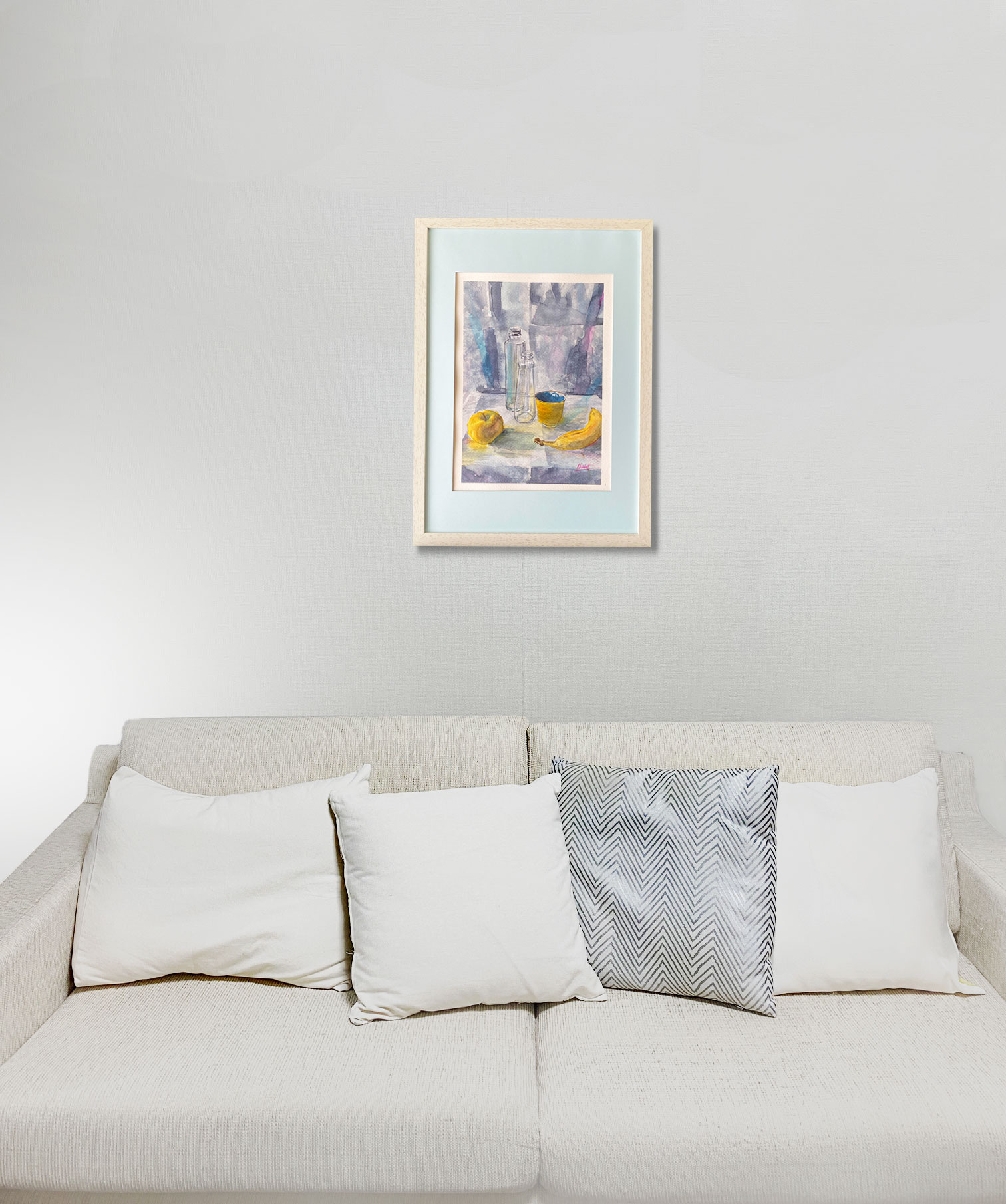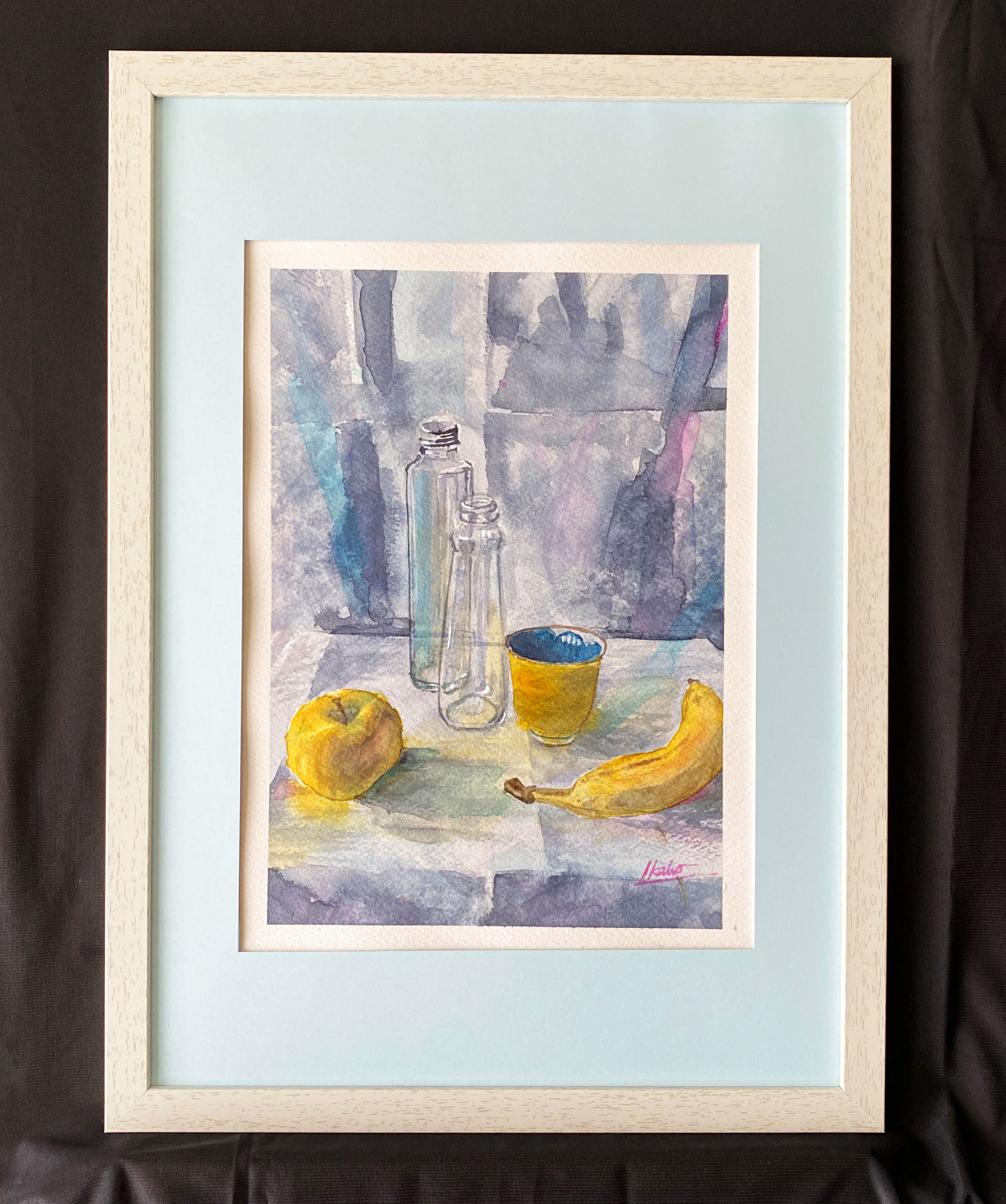 白い背景とテーブルクロスに3つの黄色のオブジェクトを置いて、少しざらついた感じを出してみました。それぞれの黄色の質感が違って見えたらうれしいです。絵に合わせて額装しました。